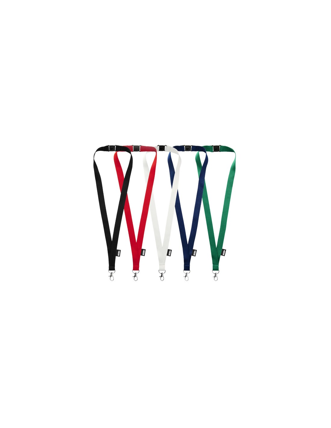 Lanyard con gancio in metallo, fibbia staccabile e chiusura di sicurezza. 25 mm di larghezza. Stampa in sublimazione disponibile sono sull’articolo di colore bianco.