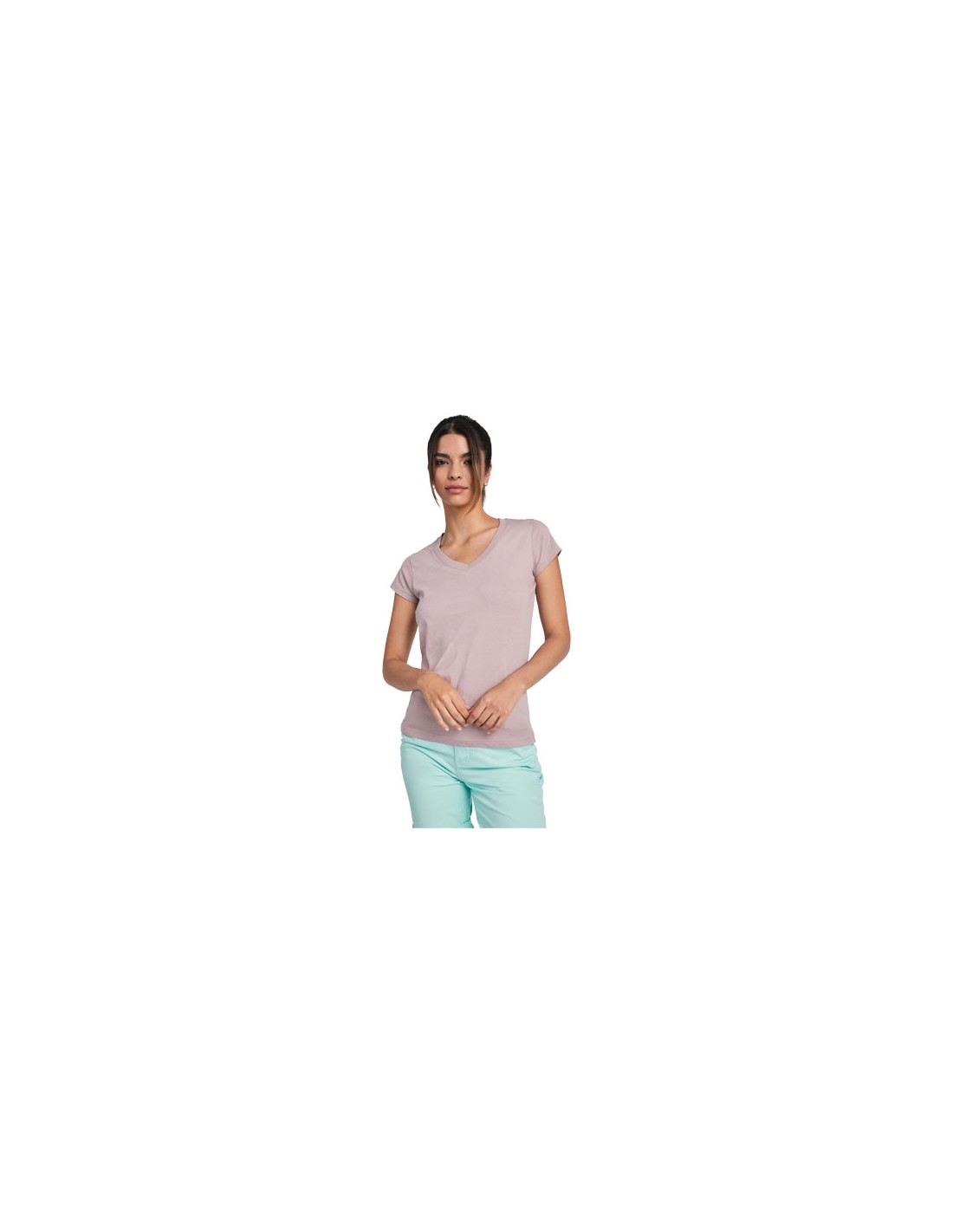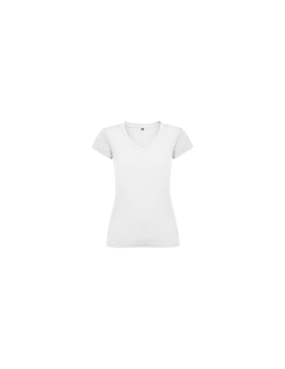 T-shirt da donna a maniche corte e scollo a V con finiture a costine 1x1. Aderente con cuciture laterali. Etichetta rimovibile. La modella è alta 174 cm ed indossa una taglia S.