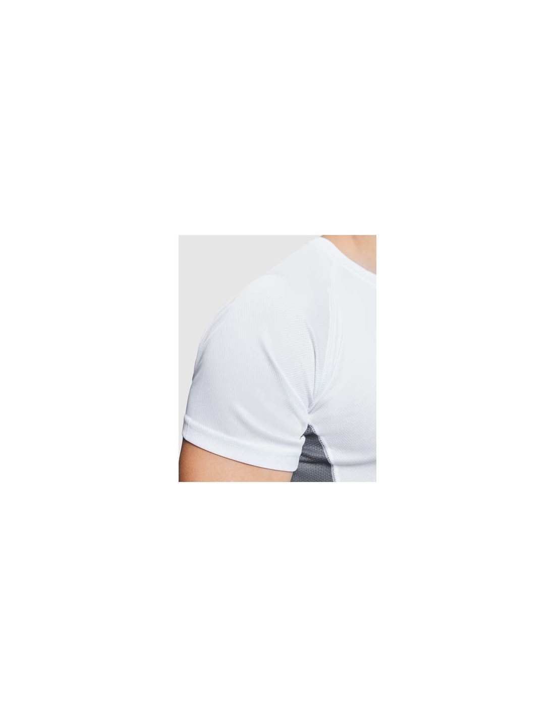 Tessuto tecnico e traspirante. Una combinazione di due tessuti in poliestere: Tessuto principale a occhio di pernice, inserti laterali e manica interna in tessuto microforato. Girocollo con cuciture interne rinforzate e coperte. Etichetta rimovibile.