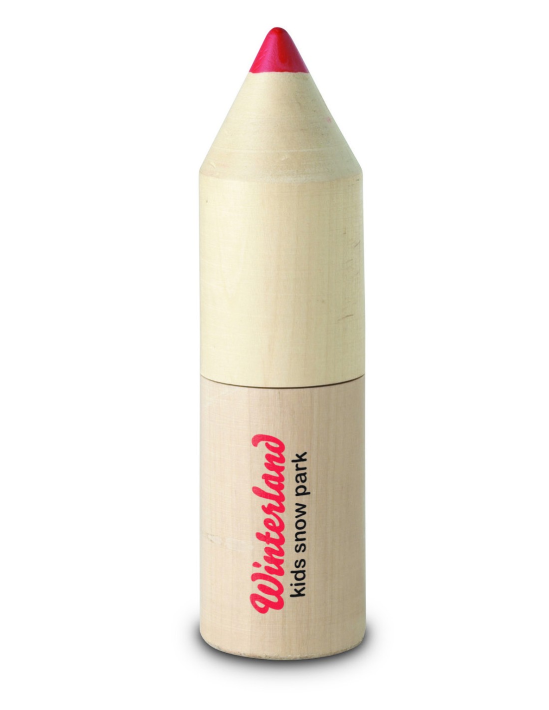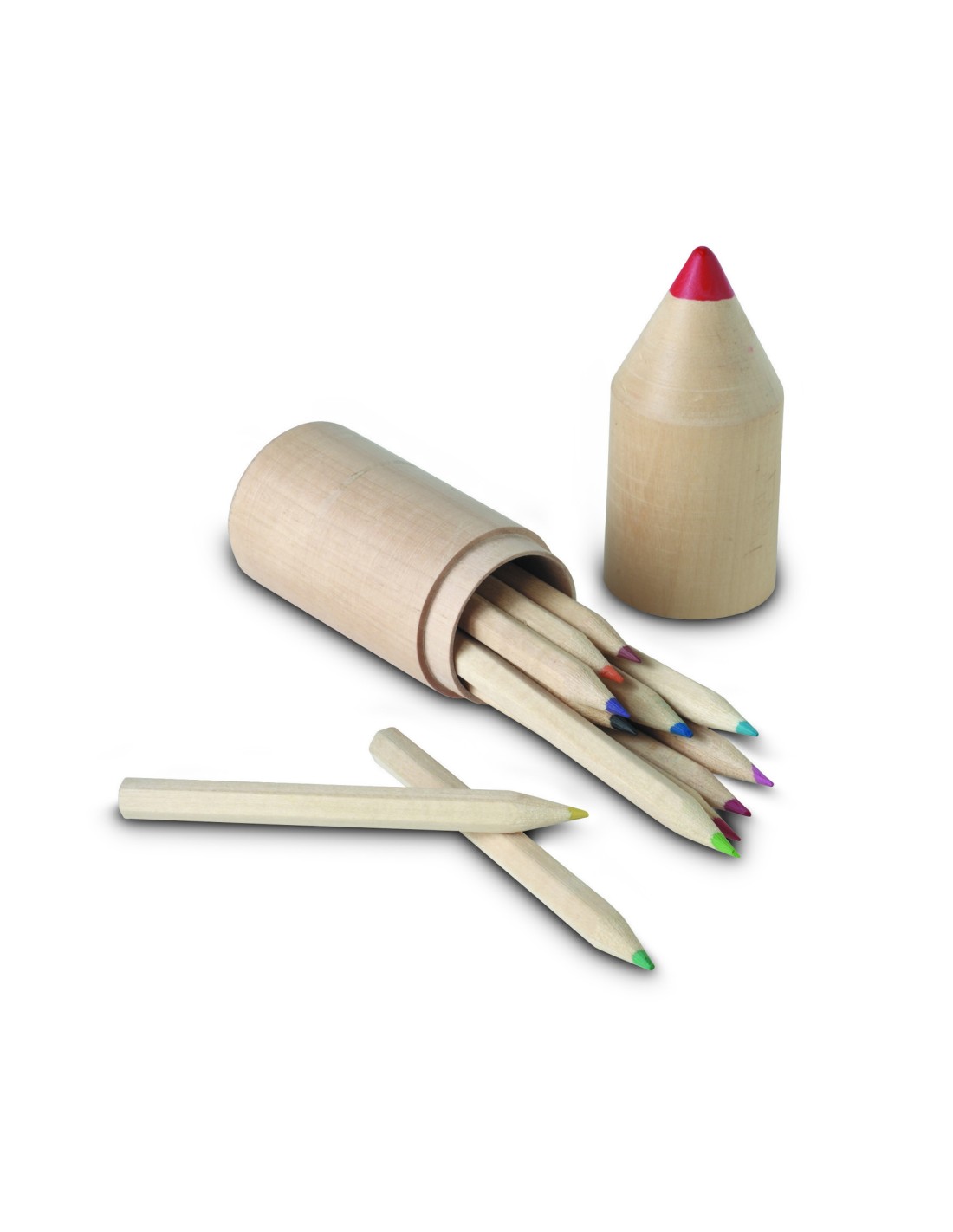 Confezione di carta colorata nera con 6 matite da colorare e un temperamatite nel coperchio della scatola.