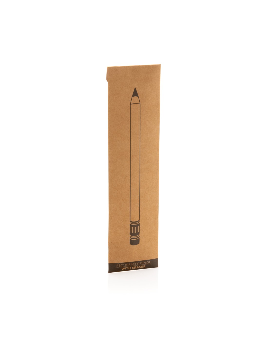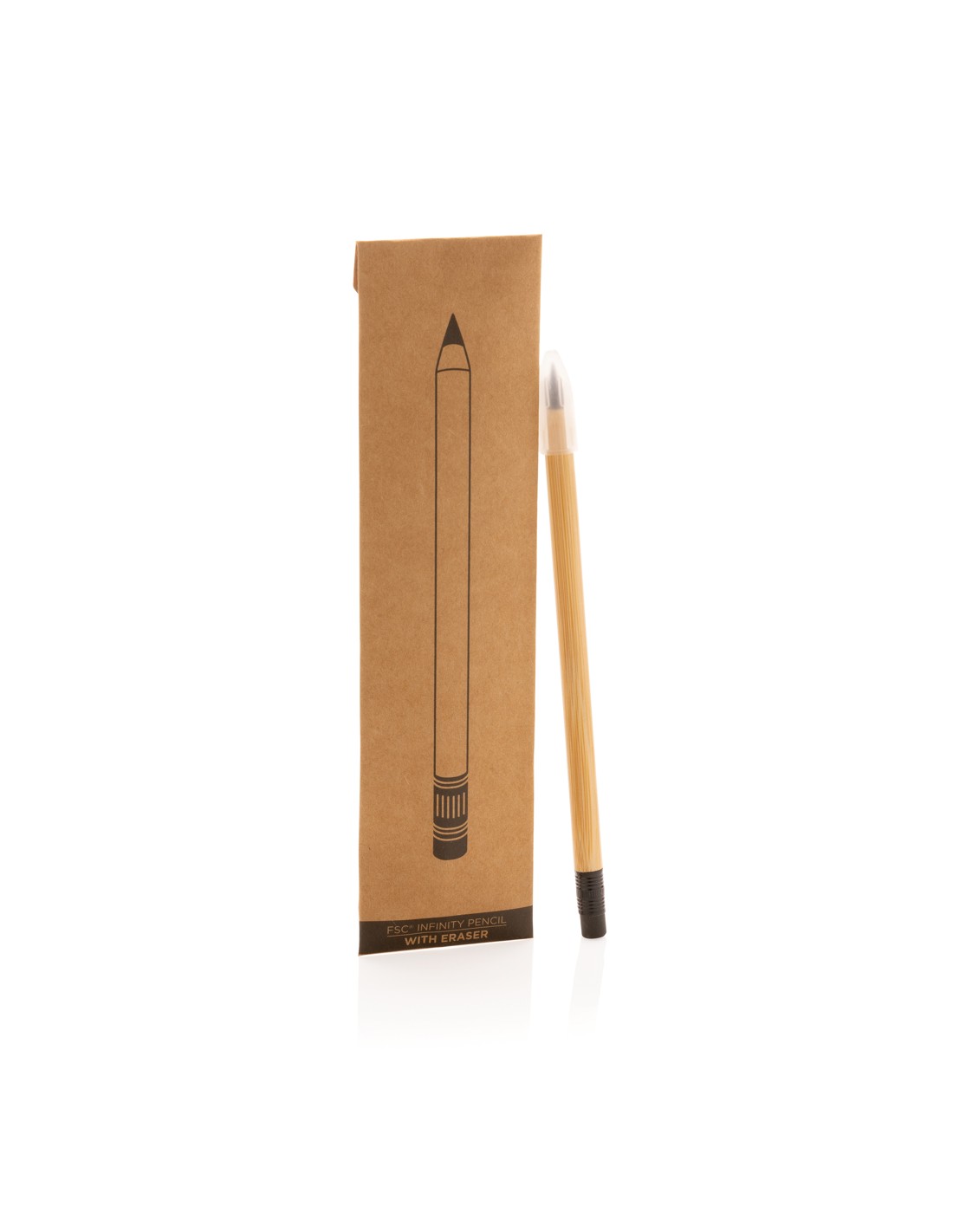 Questa matita infinity con gomma sostituisce la tradizionale matita di legno. Le tradizionali matite di legno scrivono solo circa 200 metri, ma grazie alla punta in grafite questa matita infinity in bambù FSC® ha una lunghezza di scrittura di circa 20000 metri. Ha il tratto di una matita ed è anche cancellabile. Funziona lasciando una linea di grafite sulla carta proprio come una normale matita di legno tradizionale, ma si consuma così lentamente che equivale a 100 tradizionali matite di legno!
