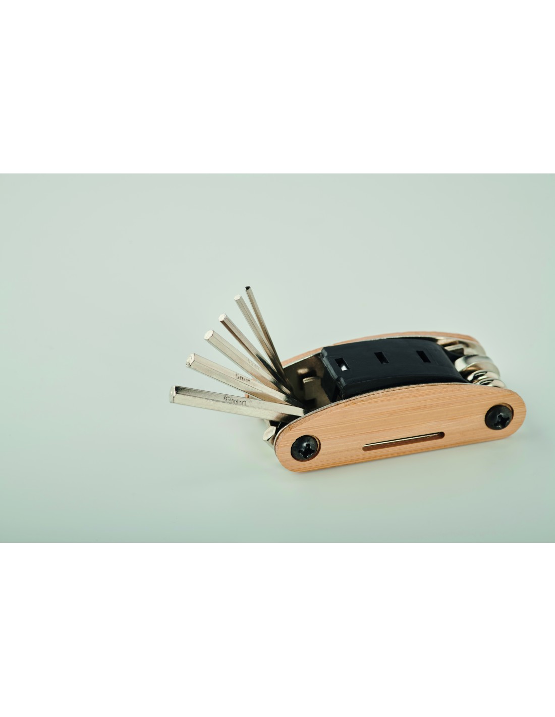Utensile tascabile multifunzione in acciaio inossidabile con copertura in bamboo. 11 funzioni. Include: chiavi esagonali, chiave piatta, prolunga, cacciavite Phillips e chiave a bussola.