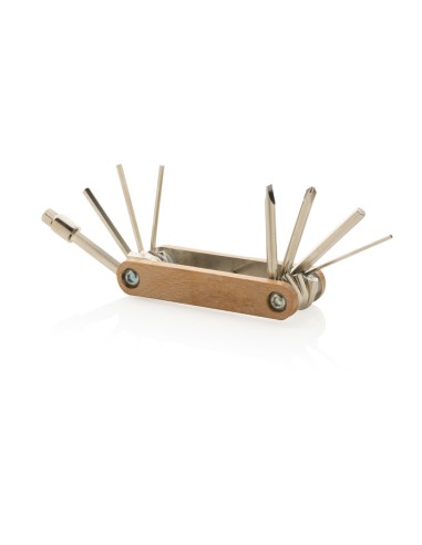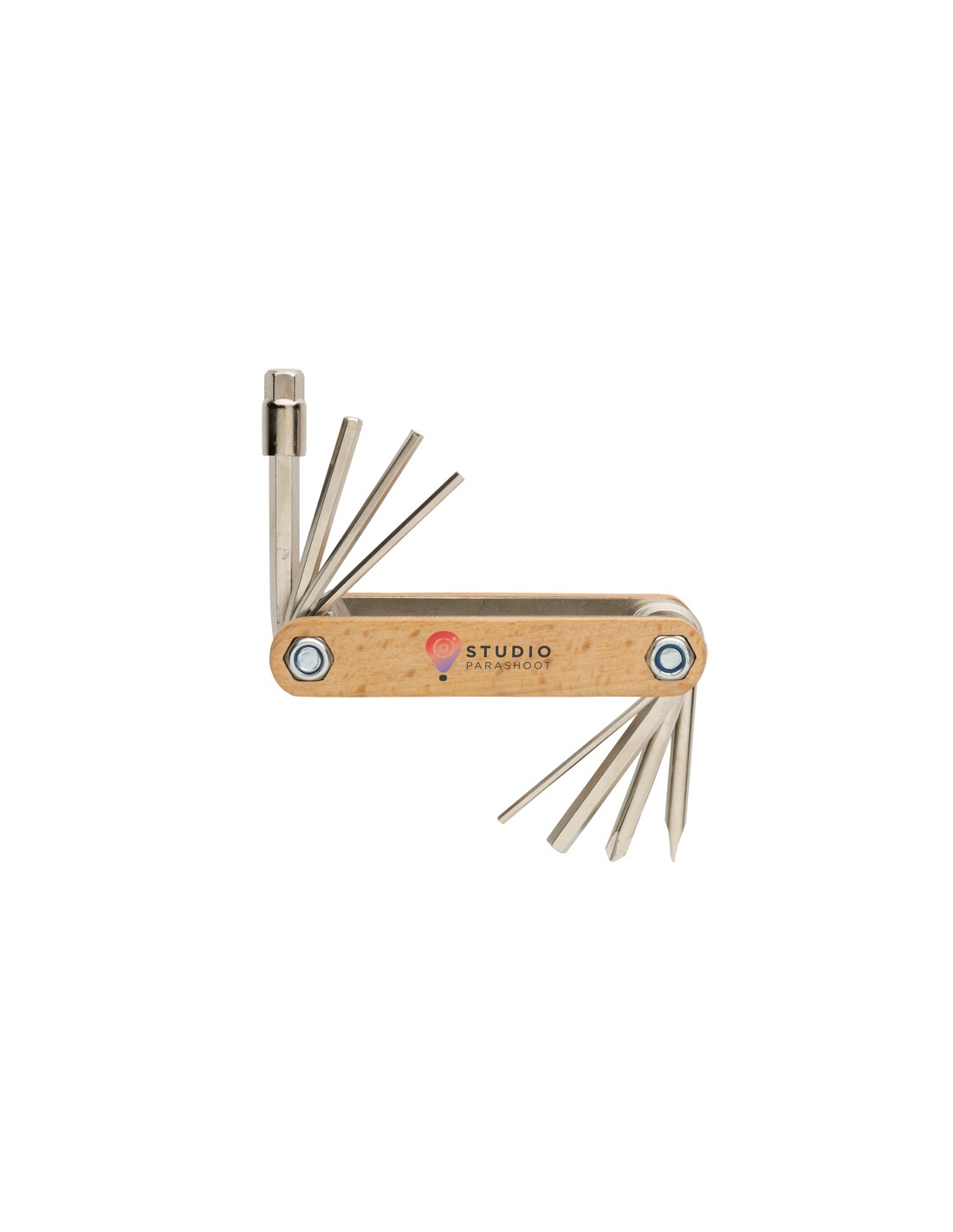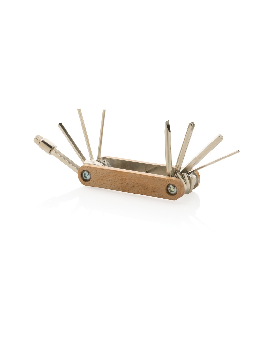 Multiattrezzo ad 8 funzioni realizzato con legno di faggio FSC 100% e acciaio al carbonio ad alta durezza e resistente alla corrosione (#45). Durezza Rockwell 40-45. Include 9 funzioni. Lunghezza della manico 9,3 cm, spessore 3,2 cm. Inclde le seguenti punte: chiave a brugola da 5,5 mm; chiave a brugola da 2 mm; chiave a brugola da 2,5 mm; chiave a brugola da 3 mm; chiave a brugola 4 mm; chiave a brugola da 5 mm; chiave a brugola da 6 mm; cacciavite a stella; cacciavite piatto. Confezionato in scatola FSC mix.