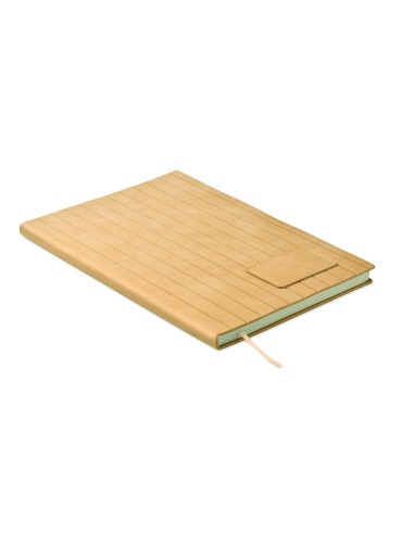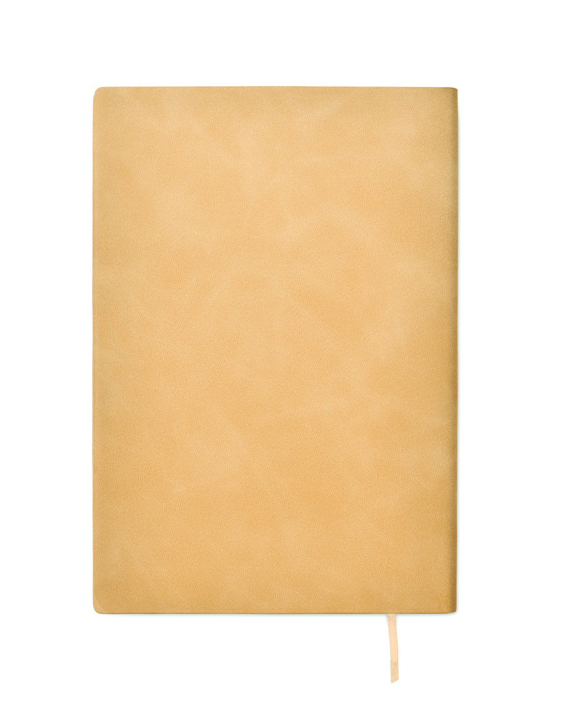 Notebook A5 con copertina a coste in PU fumé, 40% riciclato post consumo e 60% PU, con patch in PU liscio. 160 pagine a righe, carta riciclata da 70 g/m² (80 fogli). Segnapagina in nastro di poliestere in tinta.