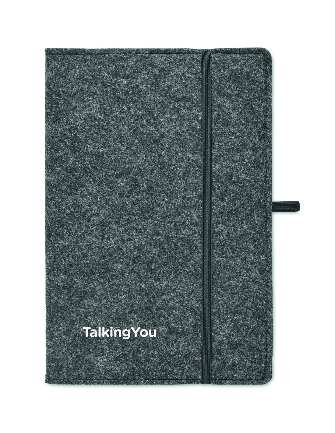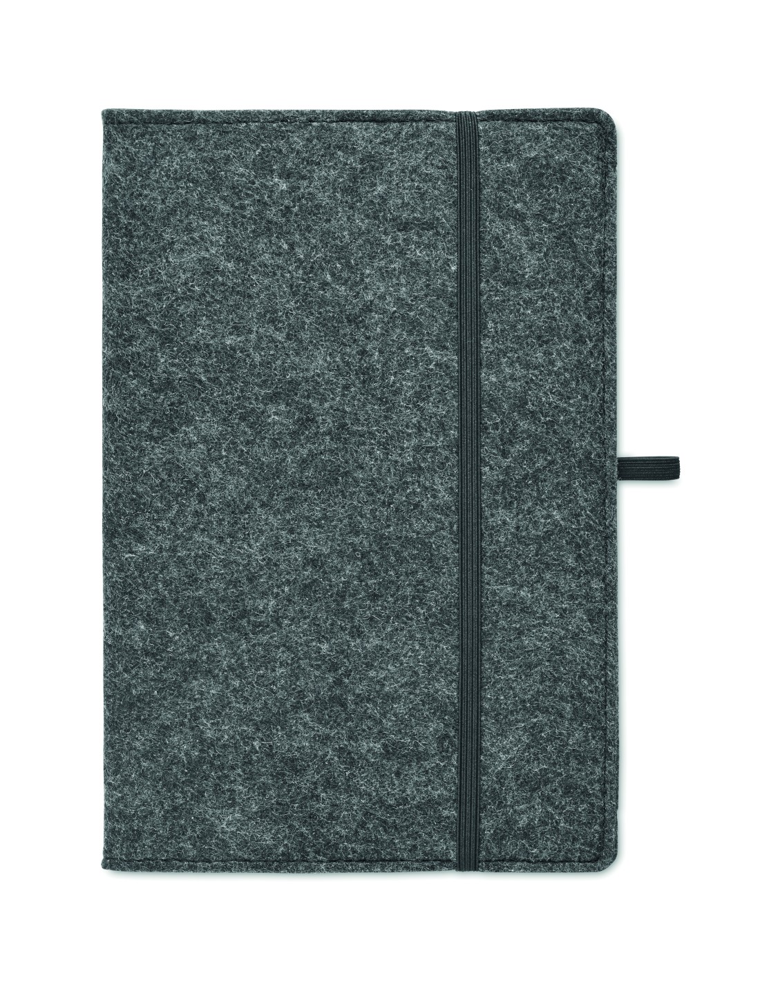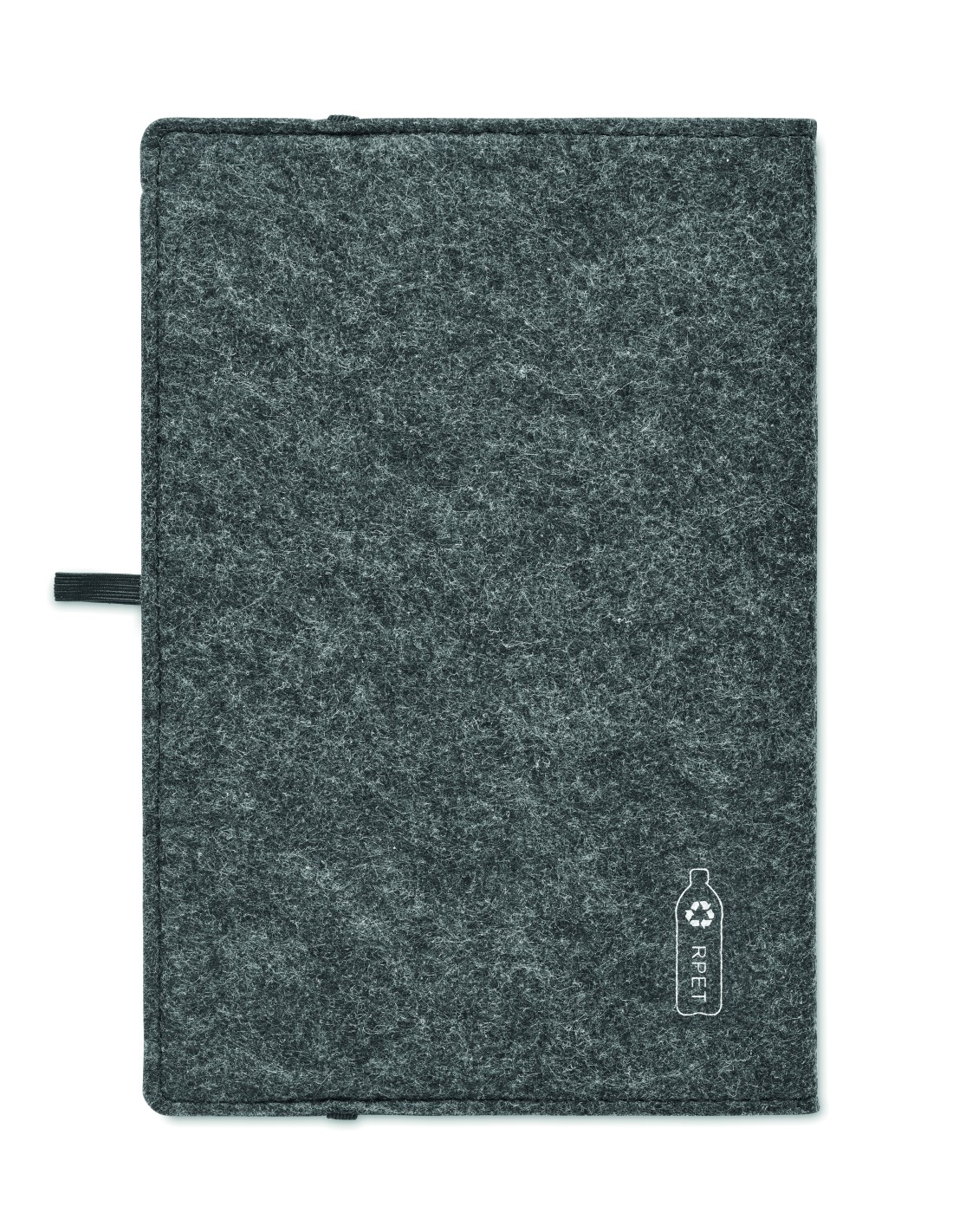 Notebook A5 con copertina in feltro RPET. 160 pagine foderate in carta riciclata (80 fogli / 70 gr/m²). Portapenne.