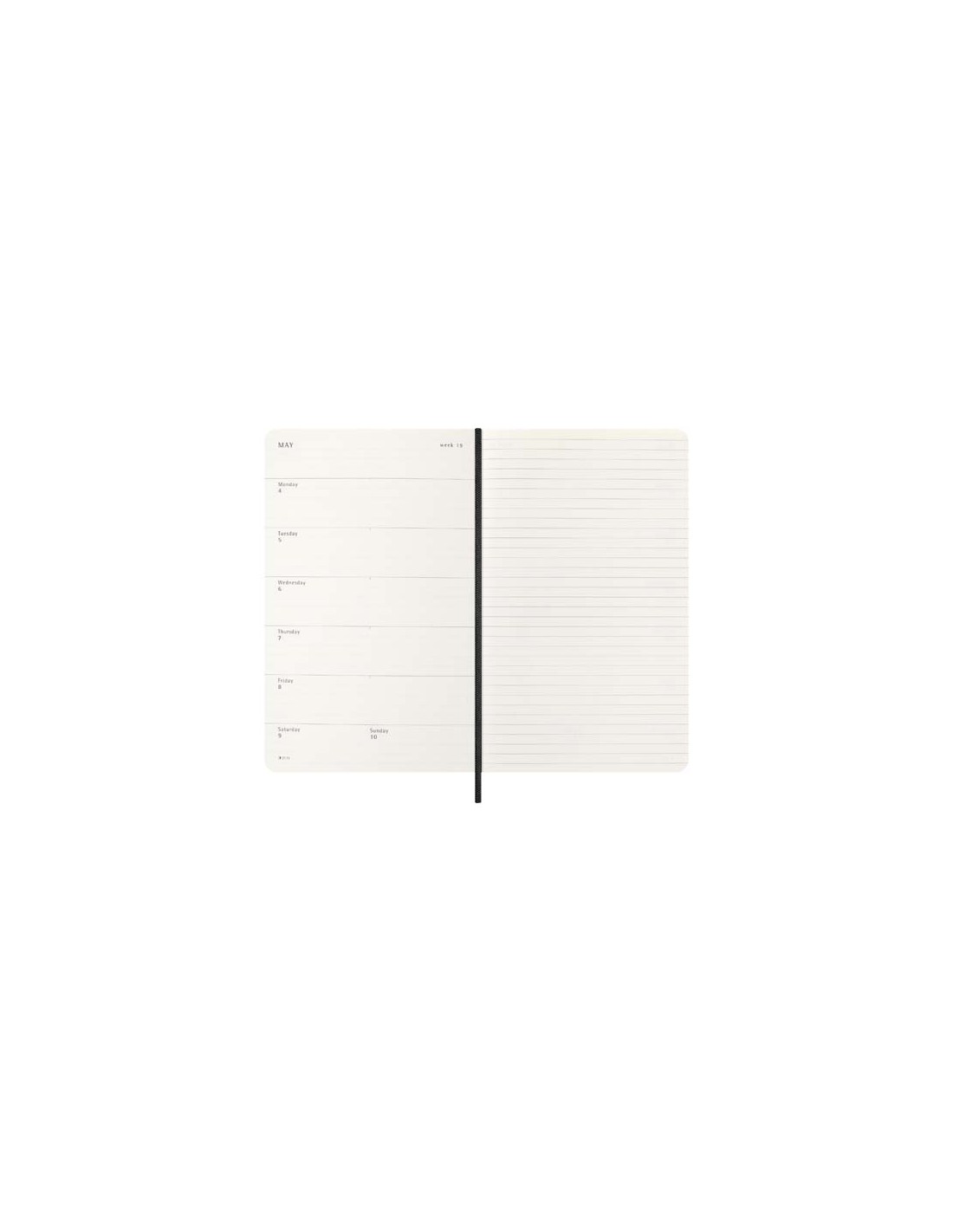 Con durata gennaio-dicembre 2026, l'agenda settimanale 12 mesi Moleskine con copertina morbida mostra l'intera settimana a colpo d'occhio, oltre a pagine con panoramica annuale e mensile per una visione più ampia dell'anno, seguite da pagine per la pianificazione di viaggi, idee e obiettivi. I giorni di ogni settimana sono indicati su un lato, mentre a destra è presente una pagina a righe per impegni e appunti. Dispone di una carta priva di acidi color avorio, una chiusura con elastico nero, un segnalibro a nastro, una tasca interna espandibile in colore coordinato, adesivi per la personalizzazione e adesivi dell'anno per il dorso.