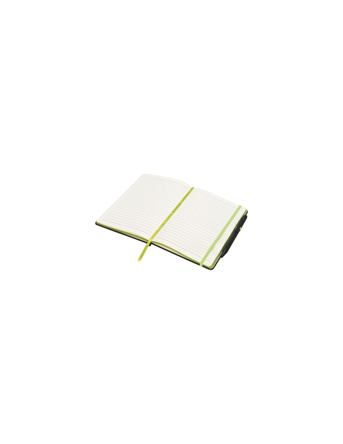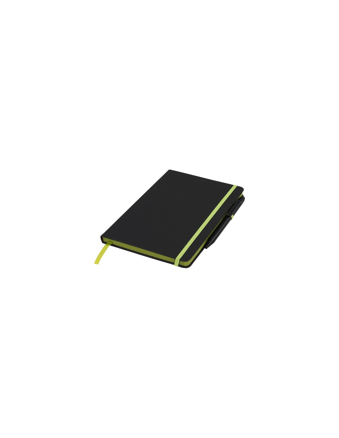 Un block-notes nero, elegante e moderno, con copertina morbida al tatto. Dotato di bordi colorati con nastrino segnapagina, anellino portapenna e chiusura a fascetta coordinati. Accompagnato da una penna a sfera con pennino nero semplice. Inclusi 96 fogli a righe color crema (70 g/m²).