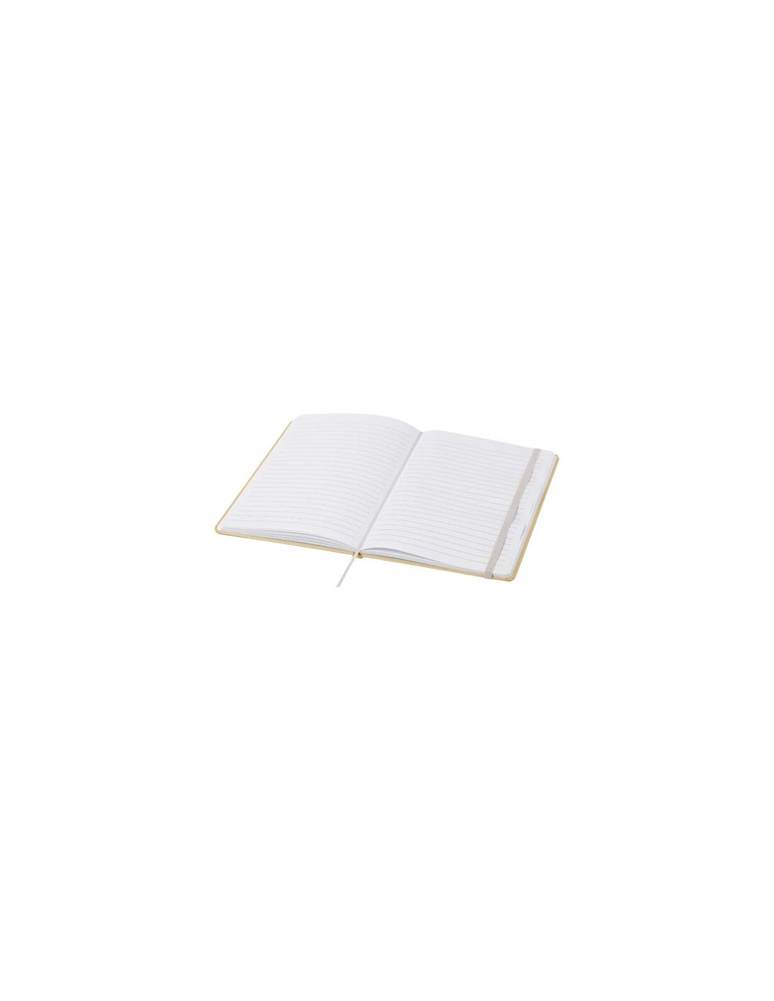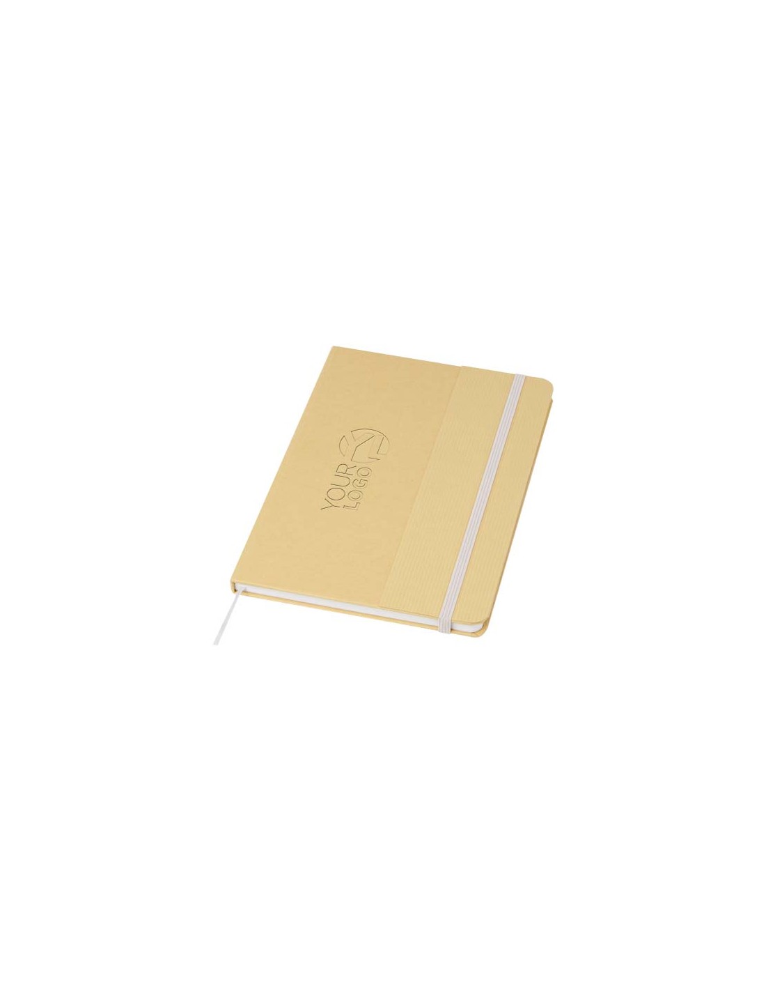 Quaderno A5 con copertina rigida in cartone riciclato e 80 fogli a righe di carta da 70 g/m². Il quaderno ha una chiusura con elastico, un nastro segnapagina e angoli arrotondati.
