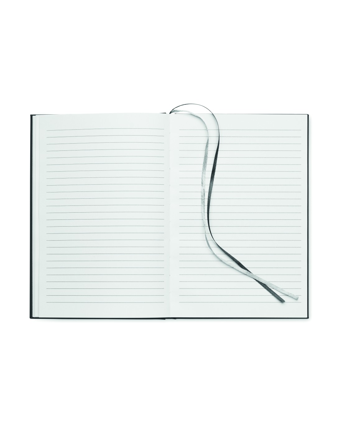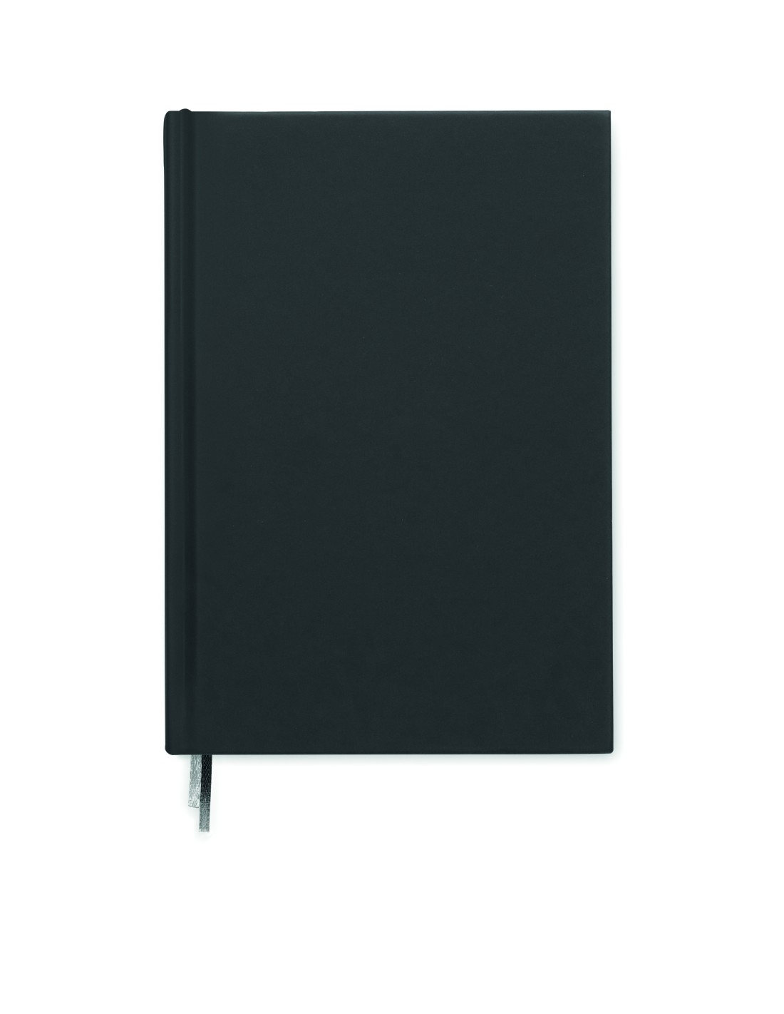 Notebook A5 in poliestere riciclato post consumo al 60% e copertina in PU al 40%. Rilegato con custodia. 256 pagine a righe in carta riciclata da 70 g/m² (128 fogli). Con 2 segnapagina in nastro di poliestere.