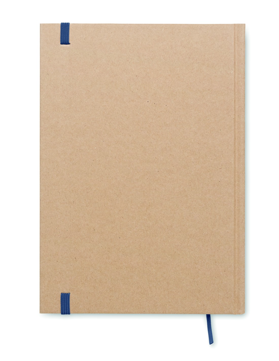 Notebook A5 con copertina rigida in cartone riciclato. Rilegato con custodia. 200 pagine a righe in carta riciclata (100 fogli/80 gr/m²). Chiusura elastica e segnapagina a nastro. Prodotto in UE.
