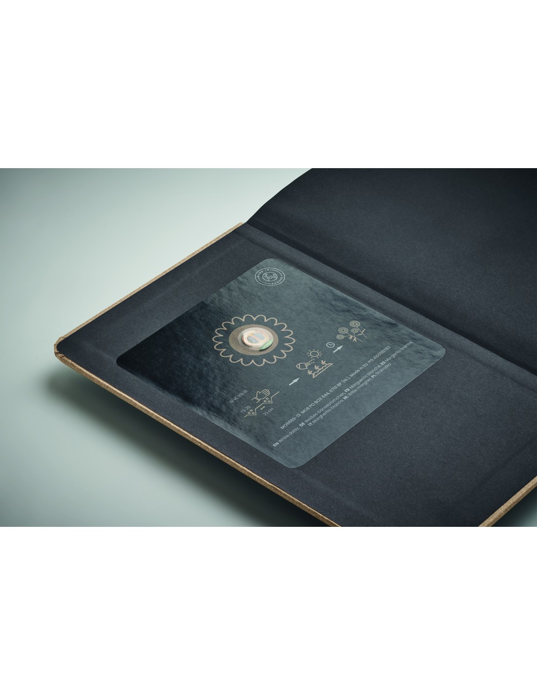 Notebook A5 con copertina in carta rigida raccolta sostenibile. Rilegato in cartone, 184 pagine a righe (92 fogli) in carta riciclata. Segnapagina in cotone. Include semi da piantare. Prodotto in UE.