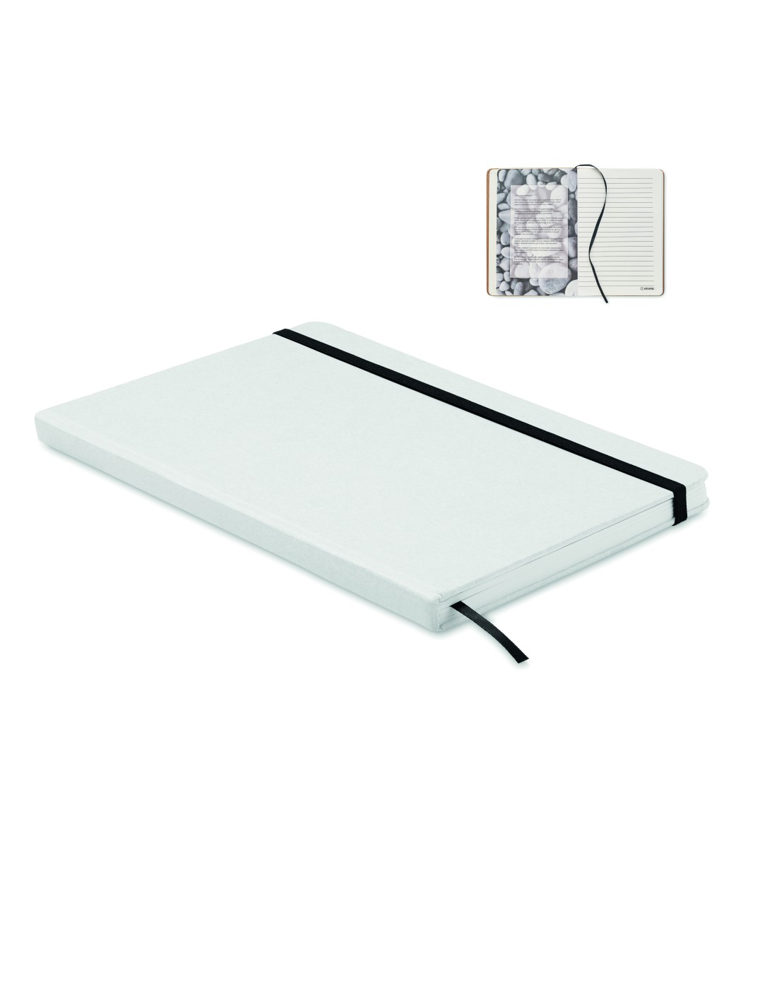 Notebook A5 con copertina rigida in cartone riciclato. Rilegato con custodia. 160 pagine foderate (80 fogli) carta minerale. Laccetto di chiusura elastico e segnapagina a nastro. FSC®-certified | FSC MIX CREDIT, P7.1 , FSC-C213206