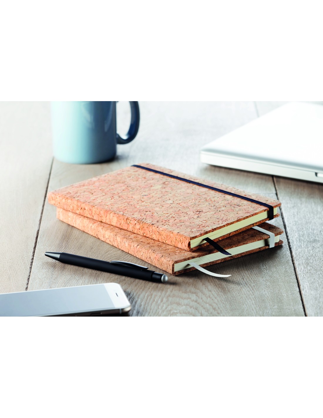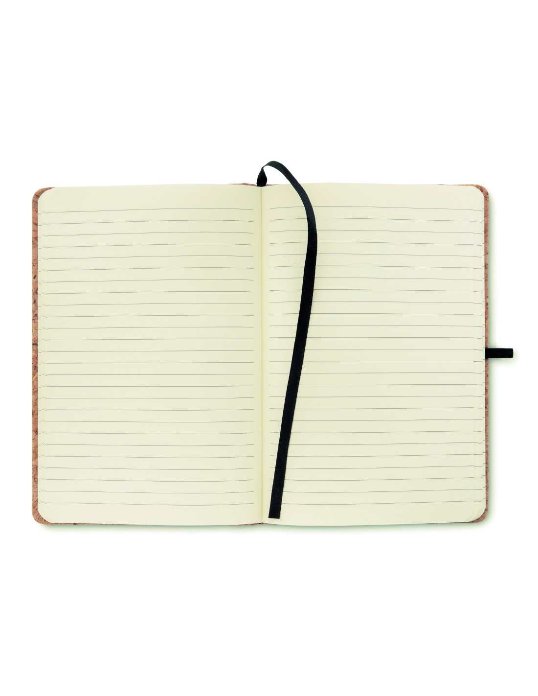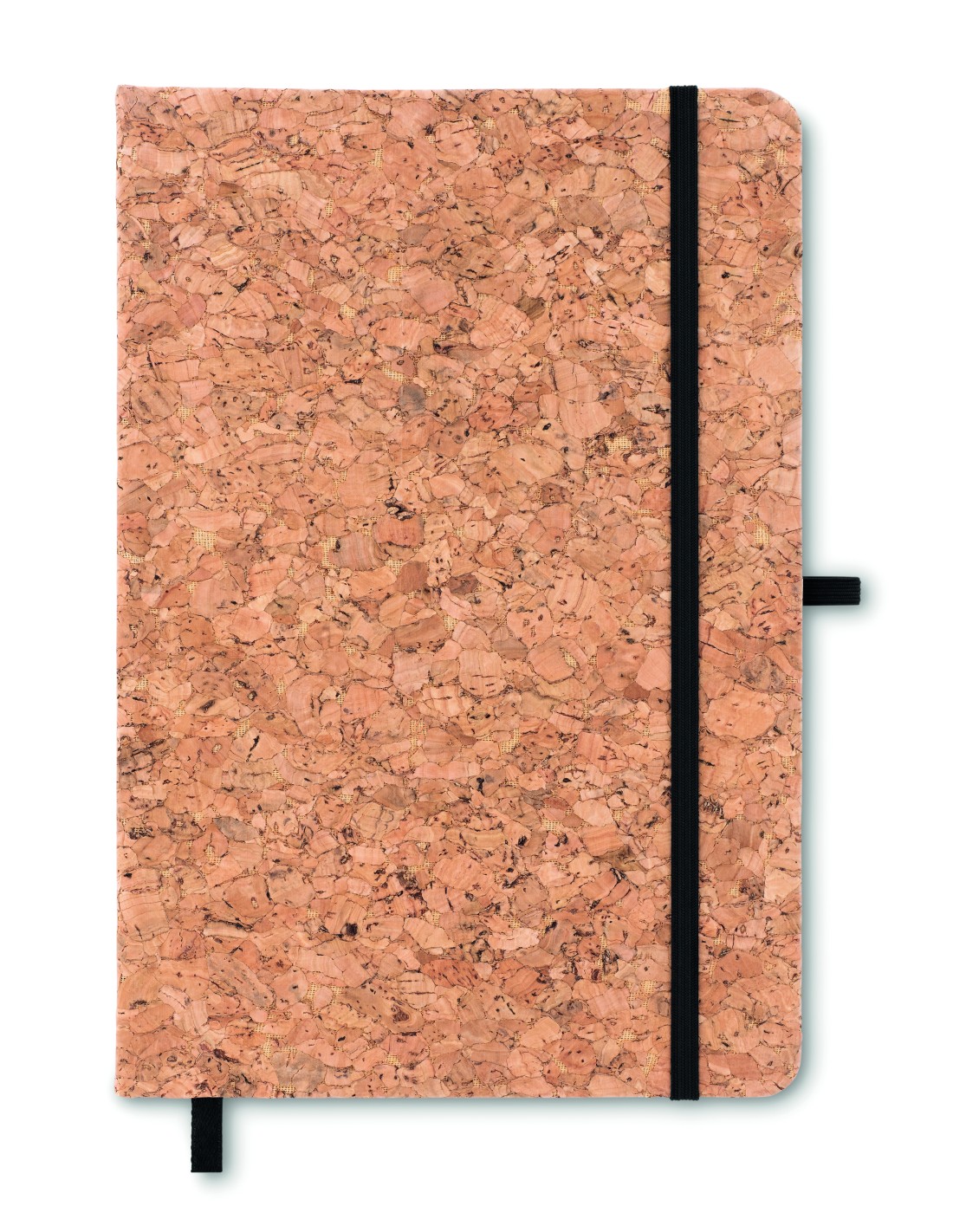Notebook A5 con copertina rigida in sughero. 192 fogli a righe in carta riciclata (96 fogli). Cinturino di chiusura elastico, segnalibro in nastro e portapenne elastico.