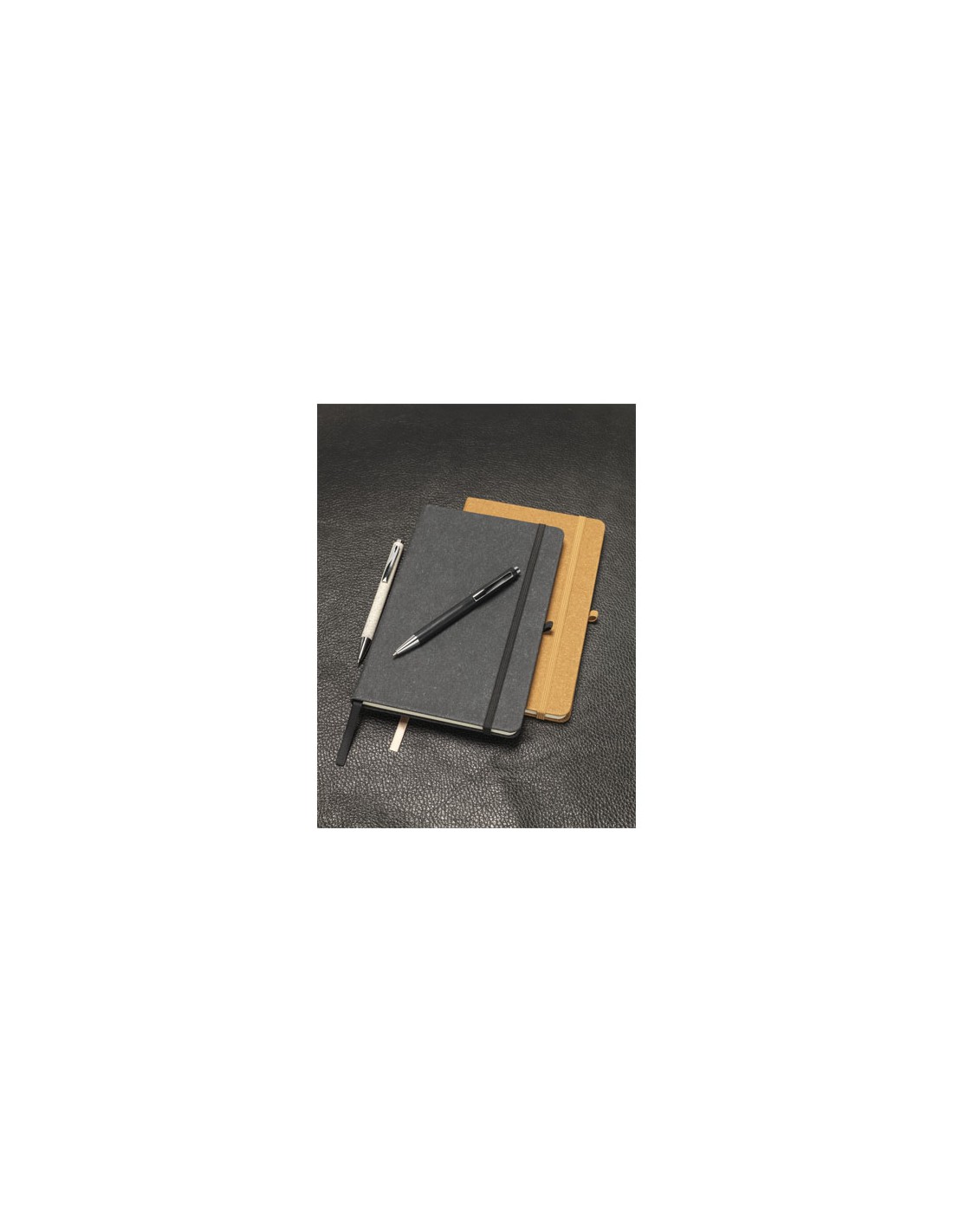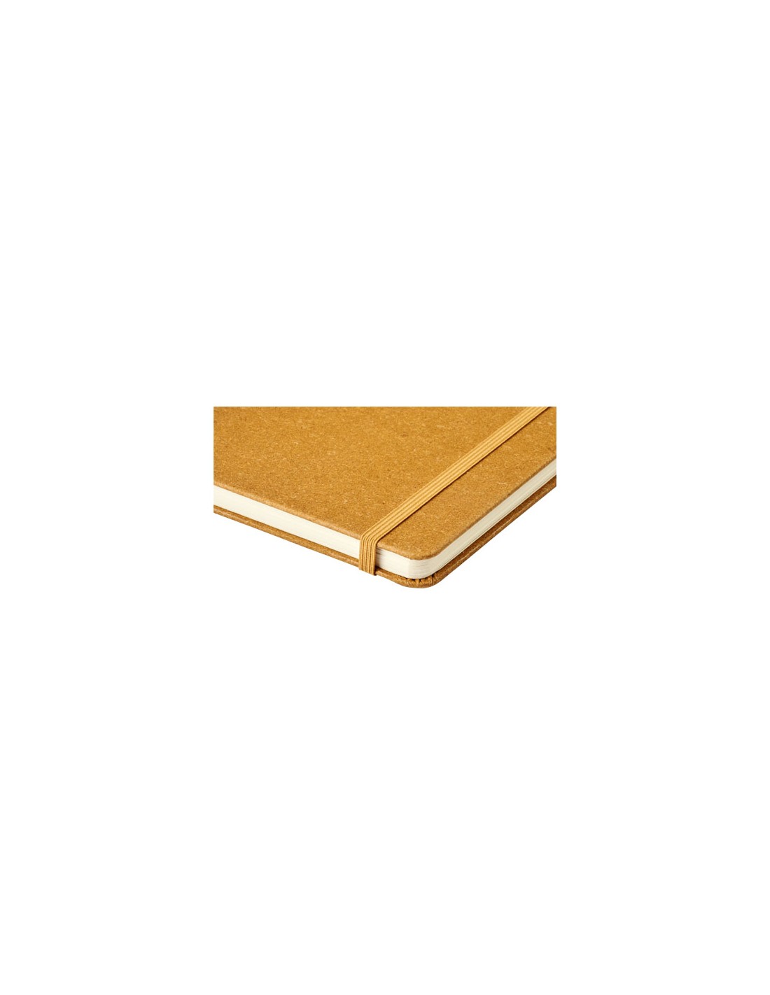 Blocco note in formato A5 con cover in tessuto RPET. Include 80 fogli di carta riciclata da 70 g/m² a righe, con asola portapenna e nastro segnalibro.