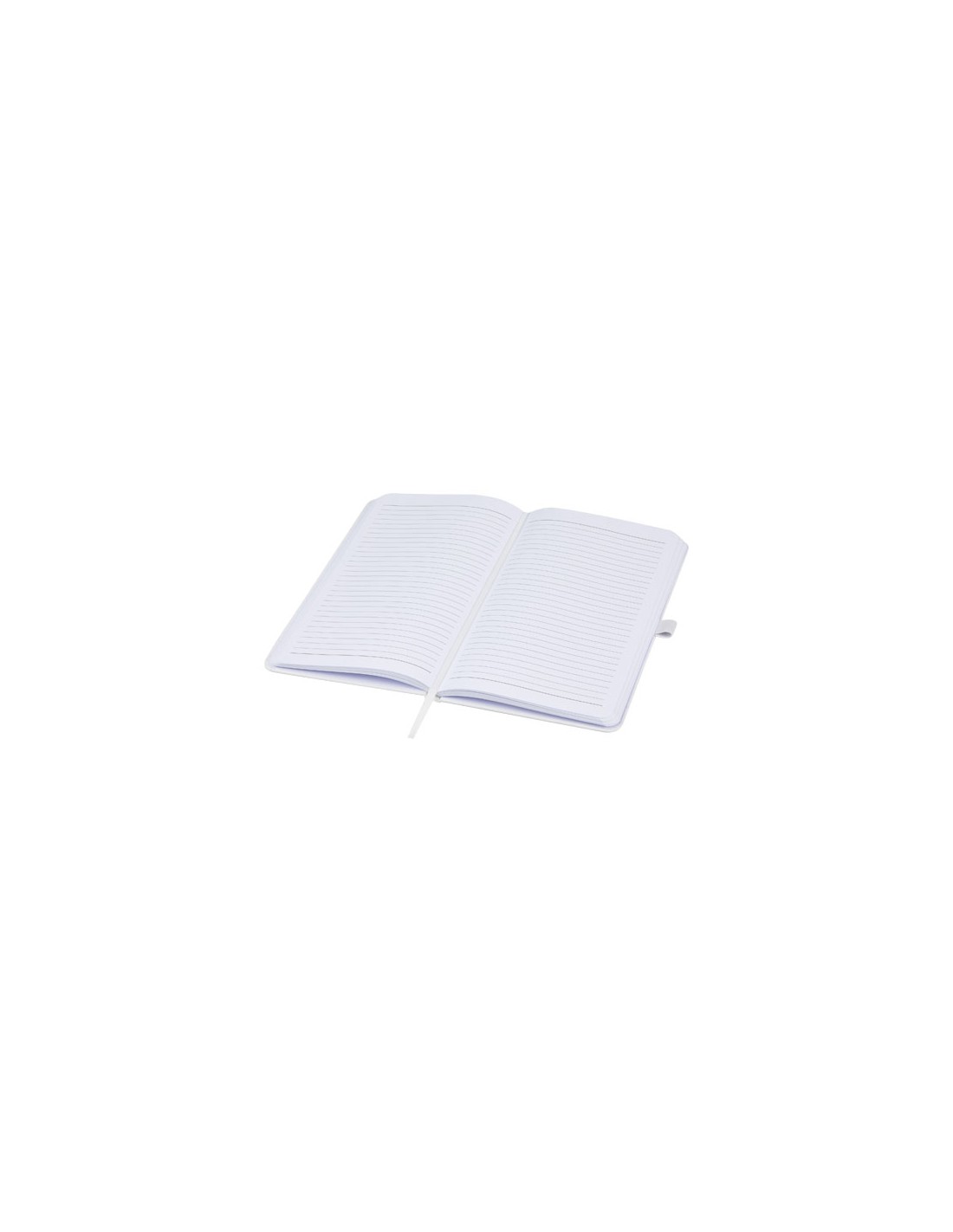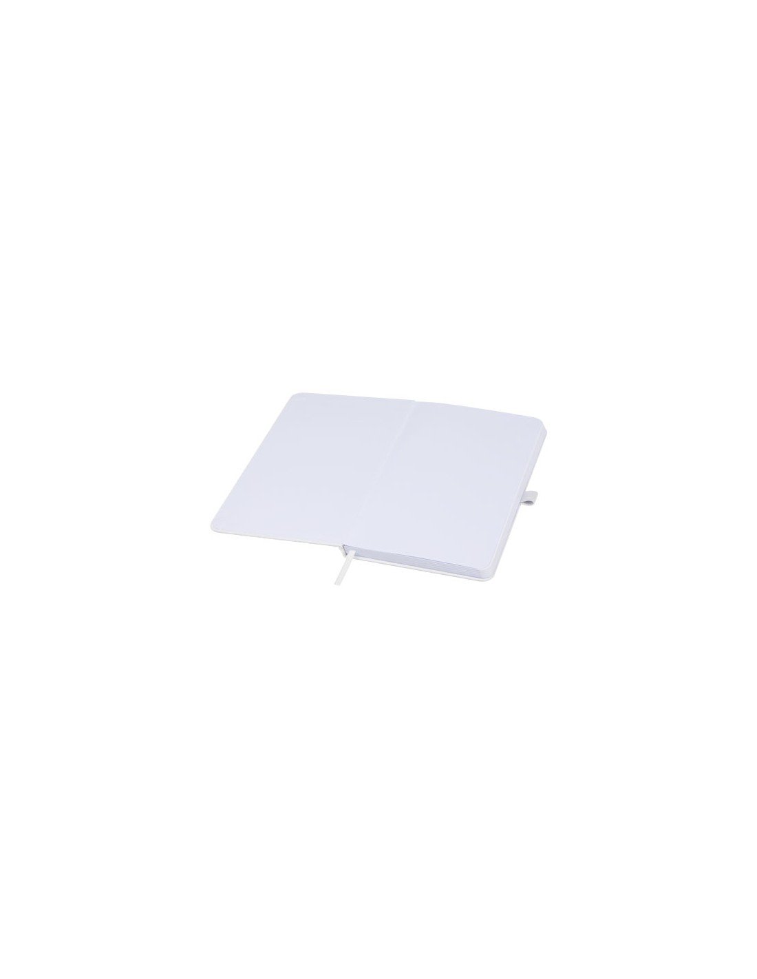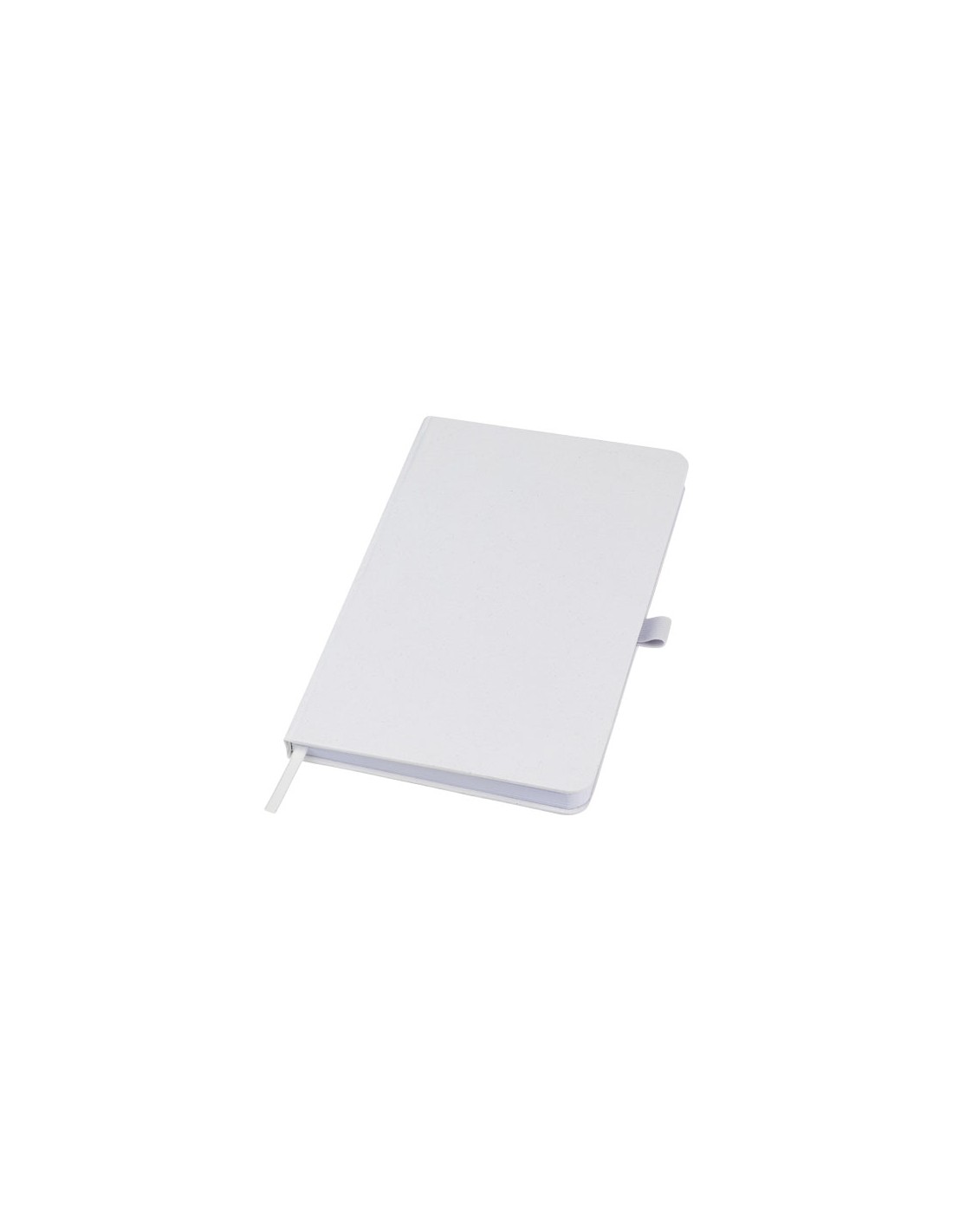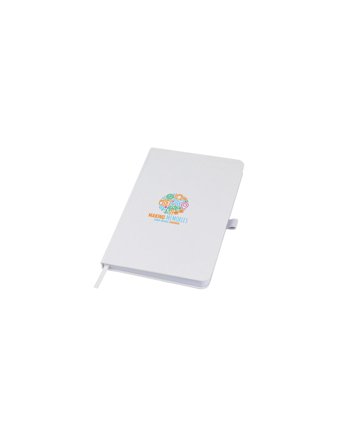 Notebook A5 con copertina rigida in tela. 192 pagine riciclate a righe (96 fogli). Chiusura con elastico a strappo e nastro segnapagina a contrasto.