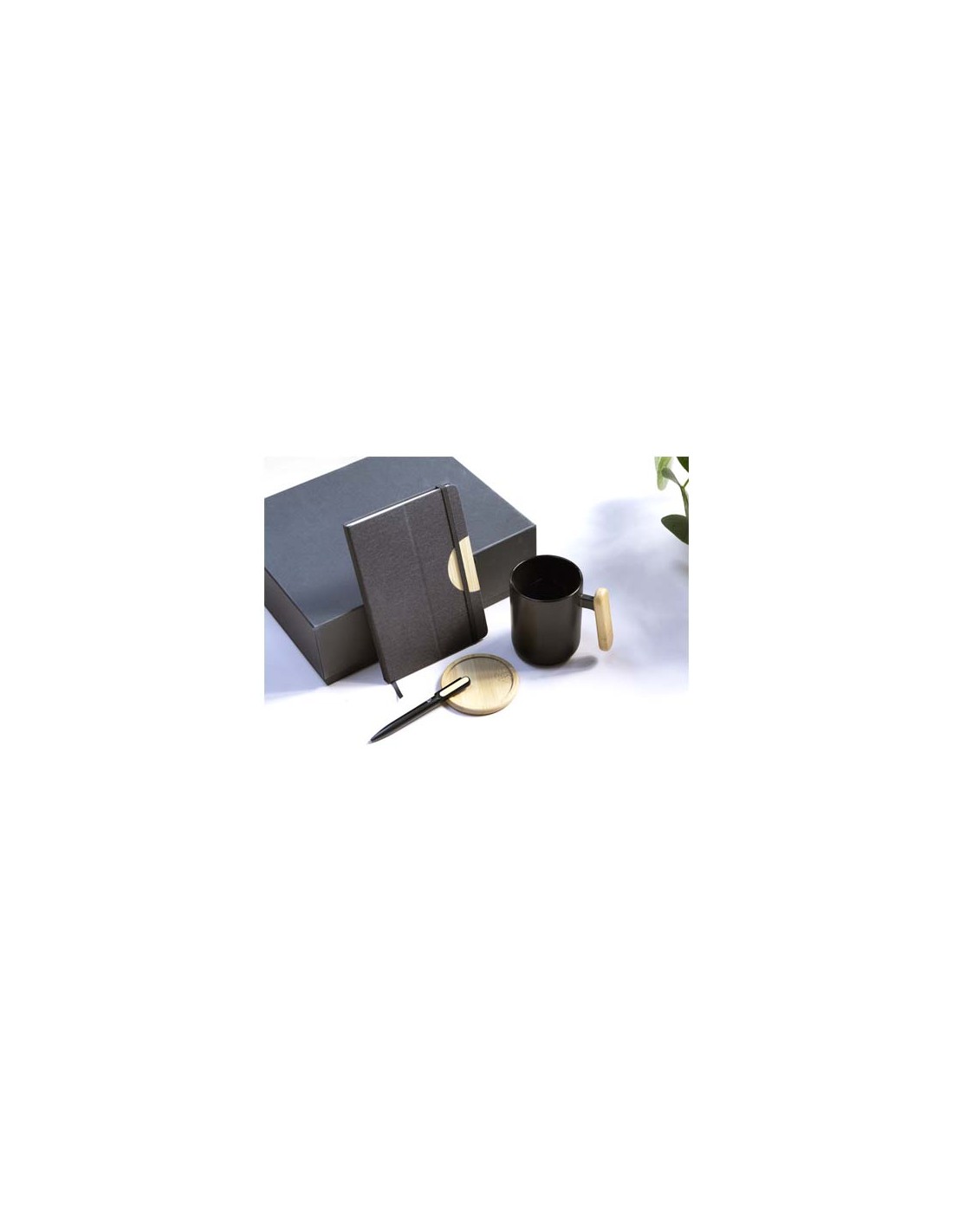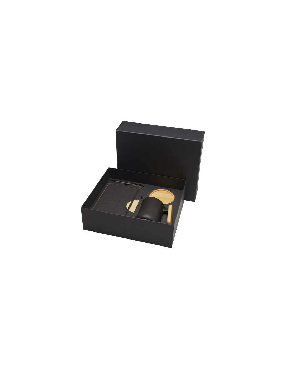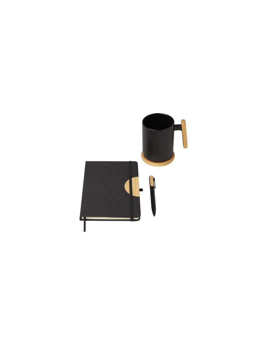La confezione regalo Laura comprende un blocco note formato A5 con copertina rigida in PET riciclato, una penna a sfera, una tazza in ceramica e un sottobicchiere. Il blocco note è dotato di chiusura con elastico nera e di un segnalibro, nonché di 80 fogli a righe in carta color crema da 80 g/m². La copertina del blocco note dotata di semicerchio in bambù funge da supporto per telefono. La penna a sfera è realizzata in alluminio riciclato certificato RCS con rivestimento verniciato a spruzzo nero e accessori in bambù su entrambi i lati del fusto superiore. Inchiostro penna: Nero. Capacità di scrittura: 400 metri. La tazza in ceramica da 480 ml viene fornita con un sottobicchiere in bambù. Lavabile solo a mano. Dimensioni della tazza: 11 x 12,7 cm. Diametro del sottobicchiere: 9,5 cm. Dimensioni della confezione regalo: 32 x 27 x 10,3 cm.