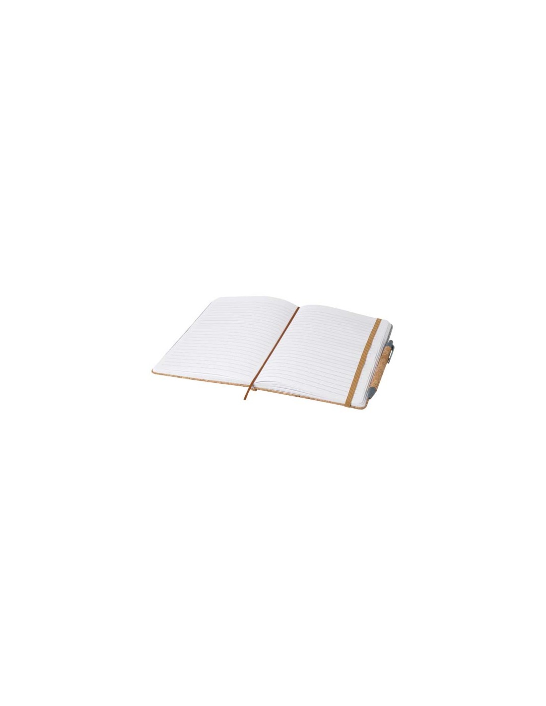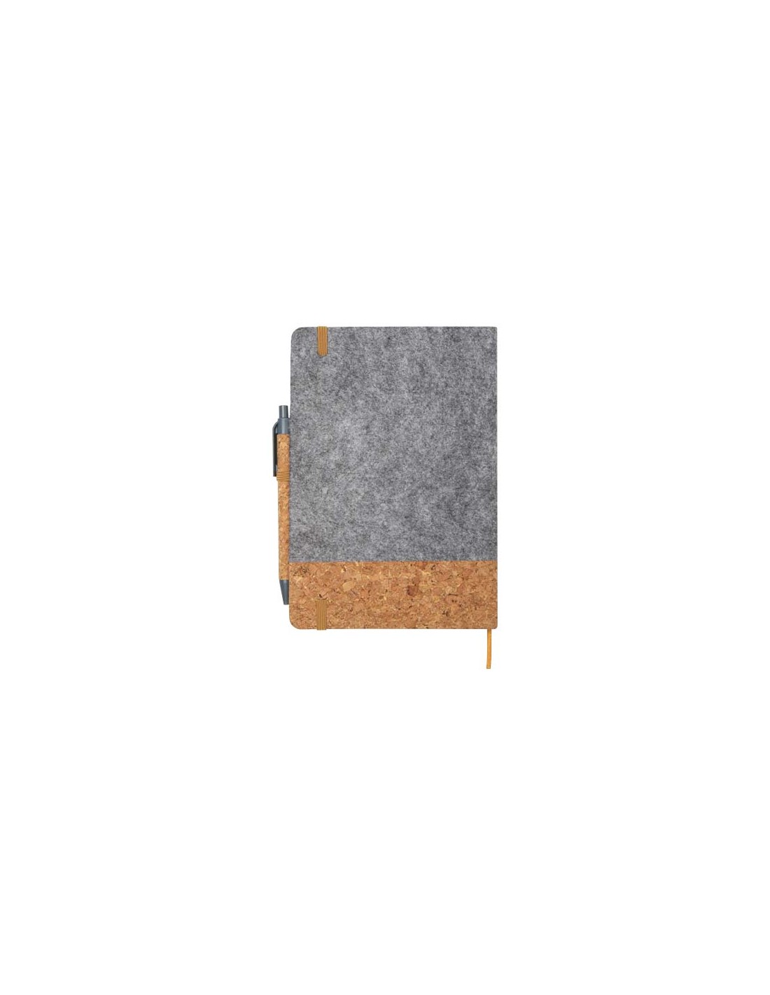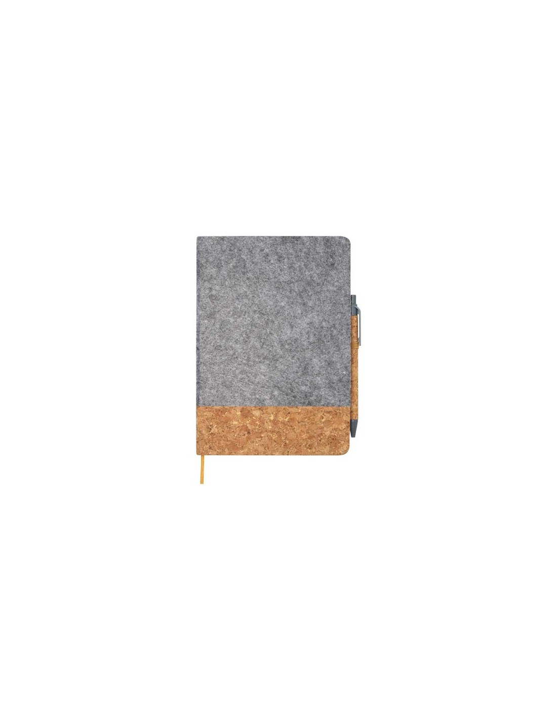 Il blocco note in formato A5 con copertina rigida è realizzato in sughero e feltro riciclato ed è provvisto di 80 fogli a righe in carta da 70 g/m², chiusura con elastico, segnalibro e passante per la penna. Il pulsante, la clip e la punta della penna a sfera sono realizzati in plastica riciclata, mentre il fusto è realizzato in sughero. Inchiostro penna: Nero. Capacità di scrittura: 600 metri. Dimensione del pennino: 1,0 mm.