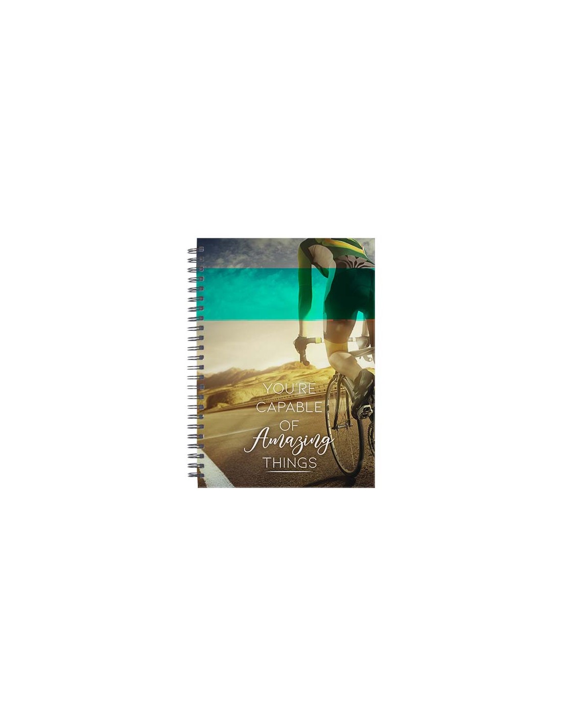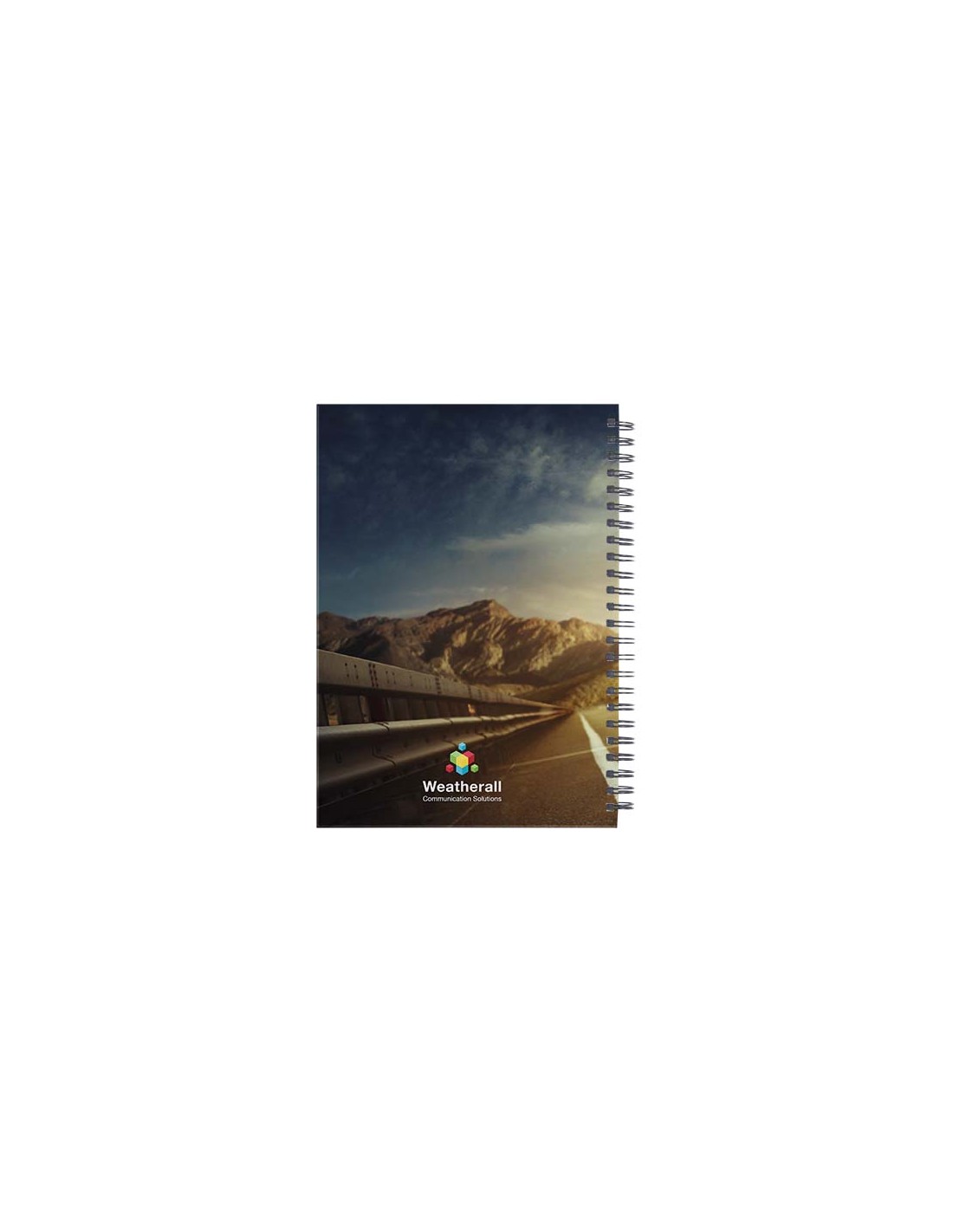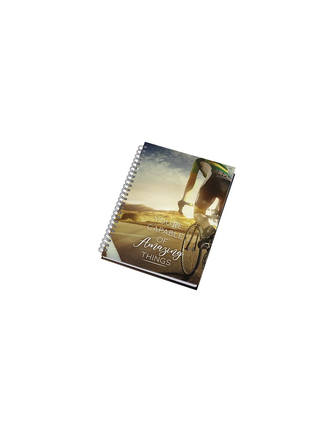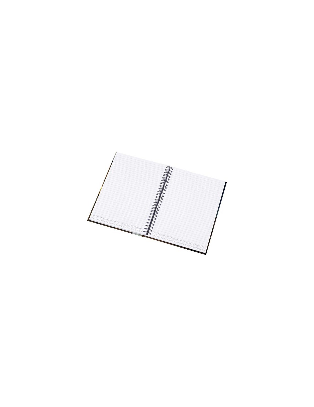 Blocco note in formato A5 con cover in tessuto RPET. Include 80 fogli di carta riciclata da 70 g/m² a righe, con asola portapenna e nastro segnalibro.