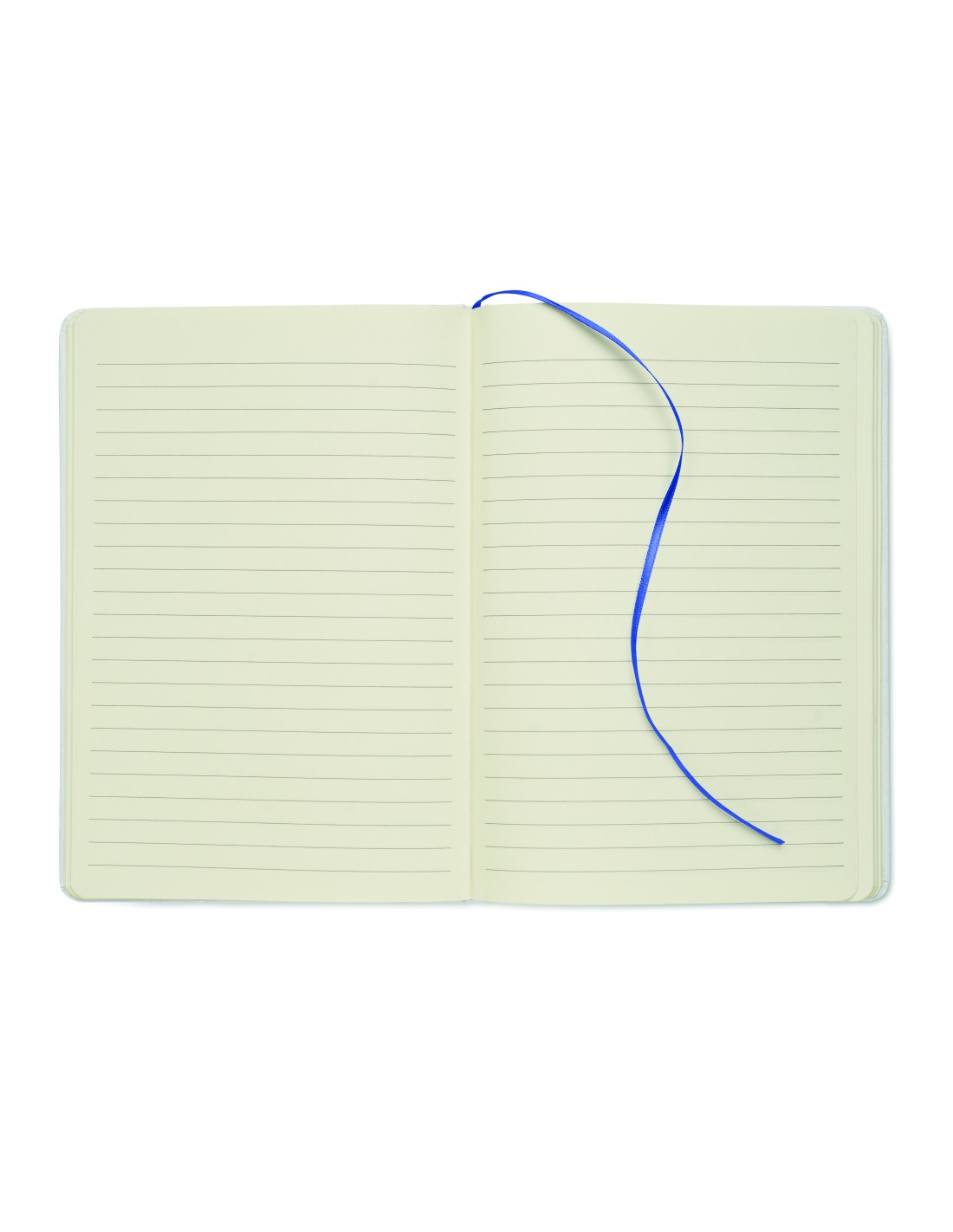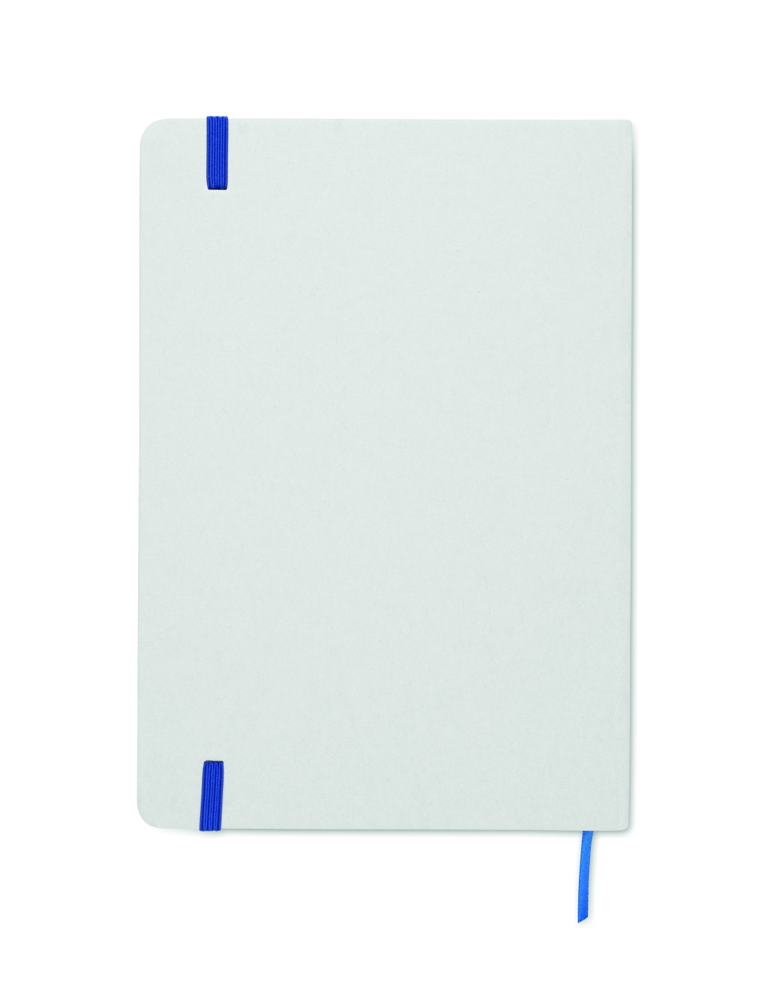 Notebook A5 con copertina rigida realizzato al 70% con cartone del latte riciclato e al 30% con carta riciclata. Copertina nera. Rilegato con custodia. 160 pagine in carta riciclata a righe (80 fogli). Cinturino di chiusura elastico, segnalibro a nastro in tinta con il colore rivelato. Dopo l'incisione laser il colore viene rivelato.