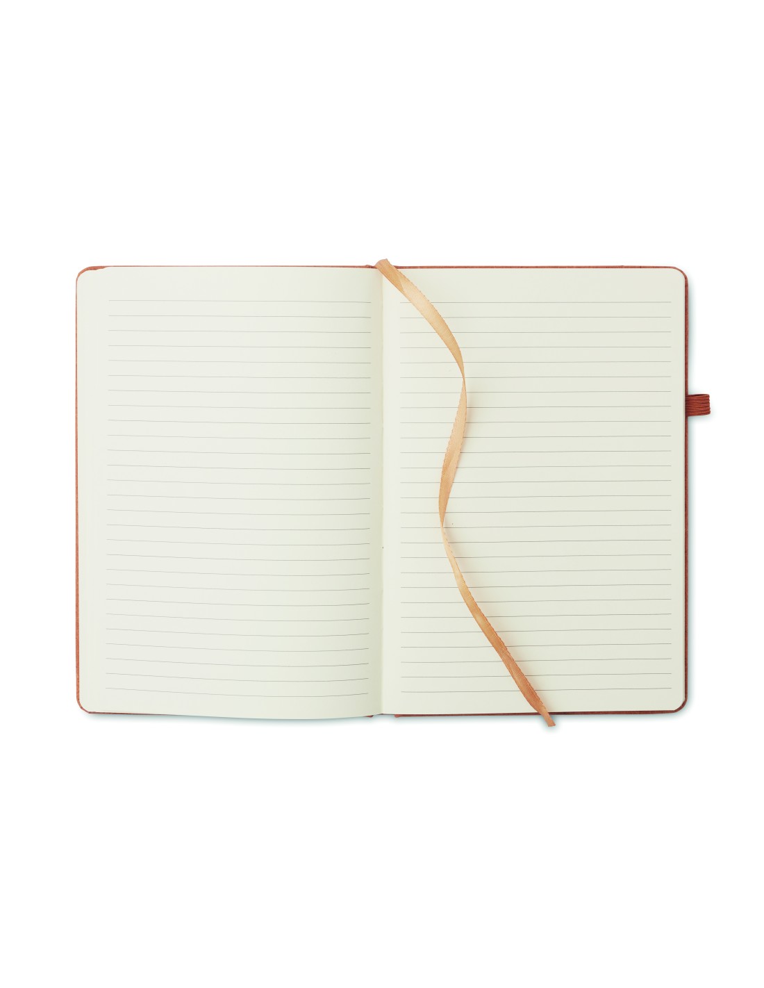 Notebook A5 con copertina in pelle pre-consumo riciclata al 70% e copertina in PU lattice al 30%. Rilegato con custodia. 160 pagine a righe in carta riciclata (80 fogli). Chiusura elastica abbinata, portapenne.