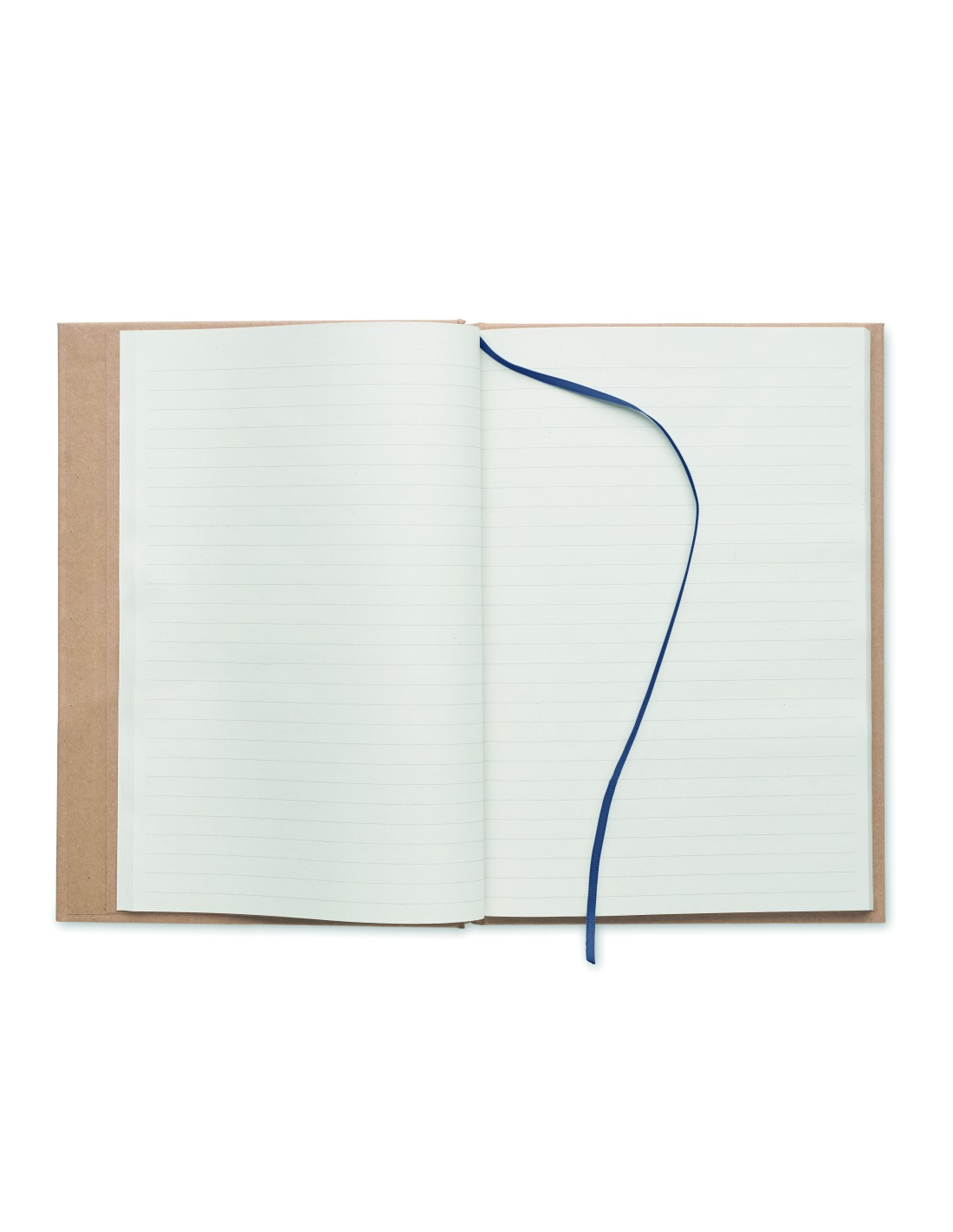 Notebook A5 con copertina rigida in cartone riciclato. Rilegato con custodia. 200 pagine a righe in carta riciclata (100 fogli/80 gr/m²). Chiusura elastica e segnapagina a nastro. Prodotto in UE.