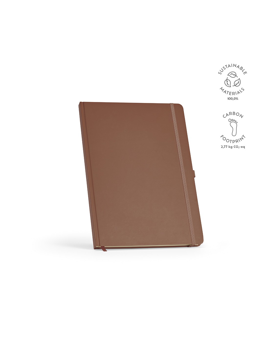 Notebook Marquez A4 con copertina rigida realizzato in carta riciclata. Contiene 240 pagine rigate avorio da 70 gsm, in carta riciclata, con una sezione dedicata a data e numerazione. Include un segnalibro a nastro, una fascia elastica di chiusura e una tasca interna espandibile per una maggiore praticità.
