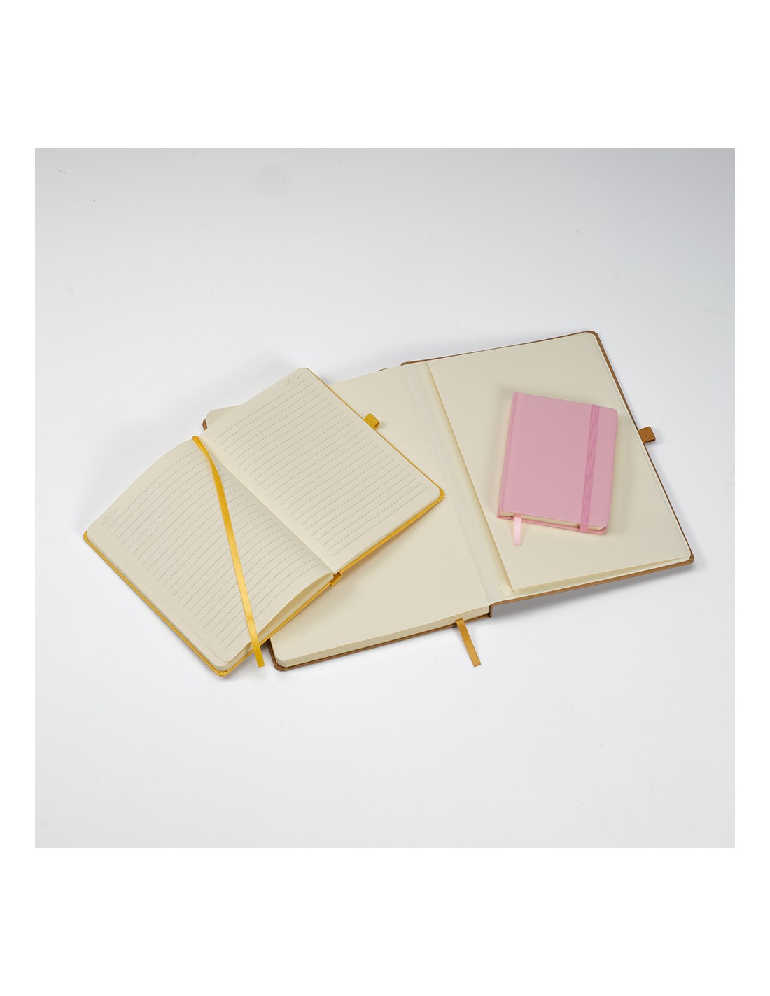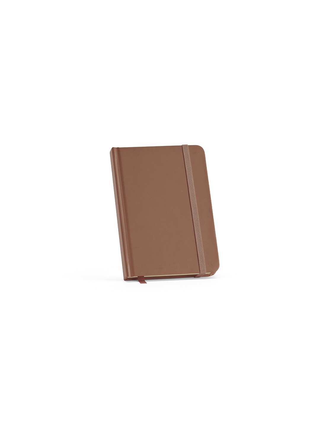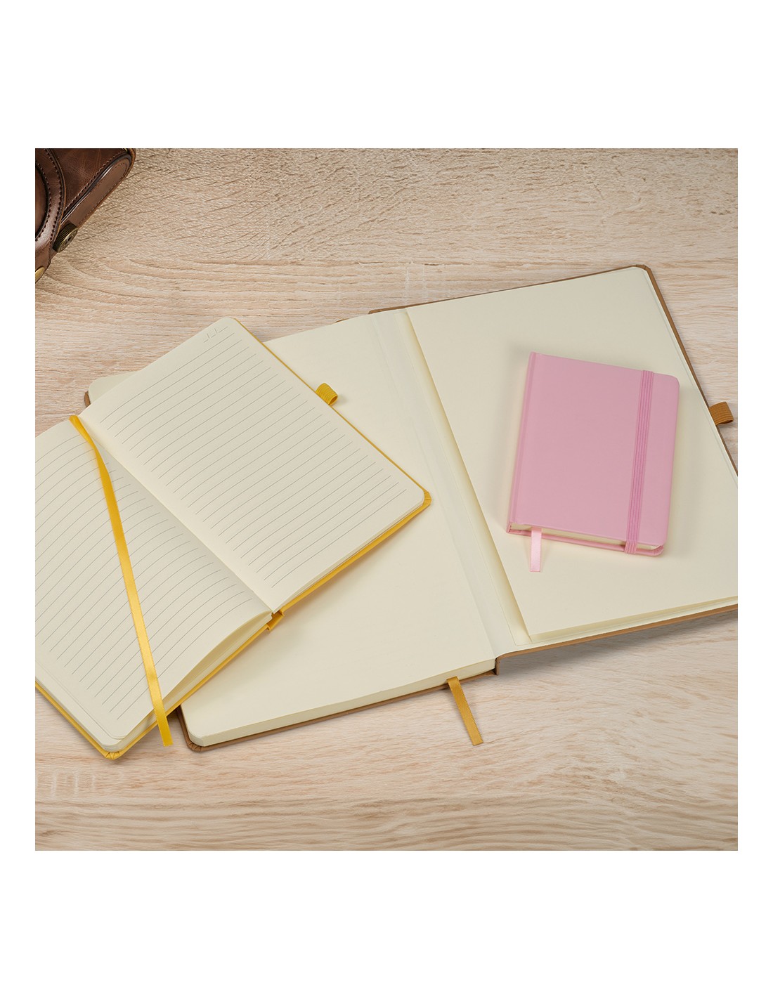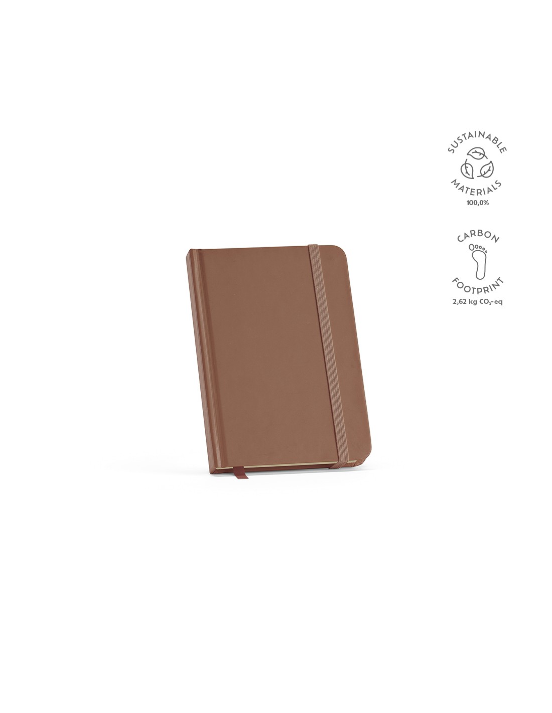 Notebook A5 in poliestere riciclato post consumo al 60% e copertina in PU al 40%. Rilegato con custodia. 256 pagine a righe in carta riciclata da 70 g/m² (128 fogli). Con 2 segnapagina in nastro di poliestere.