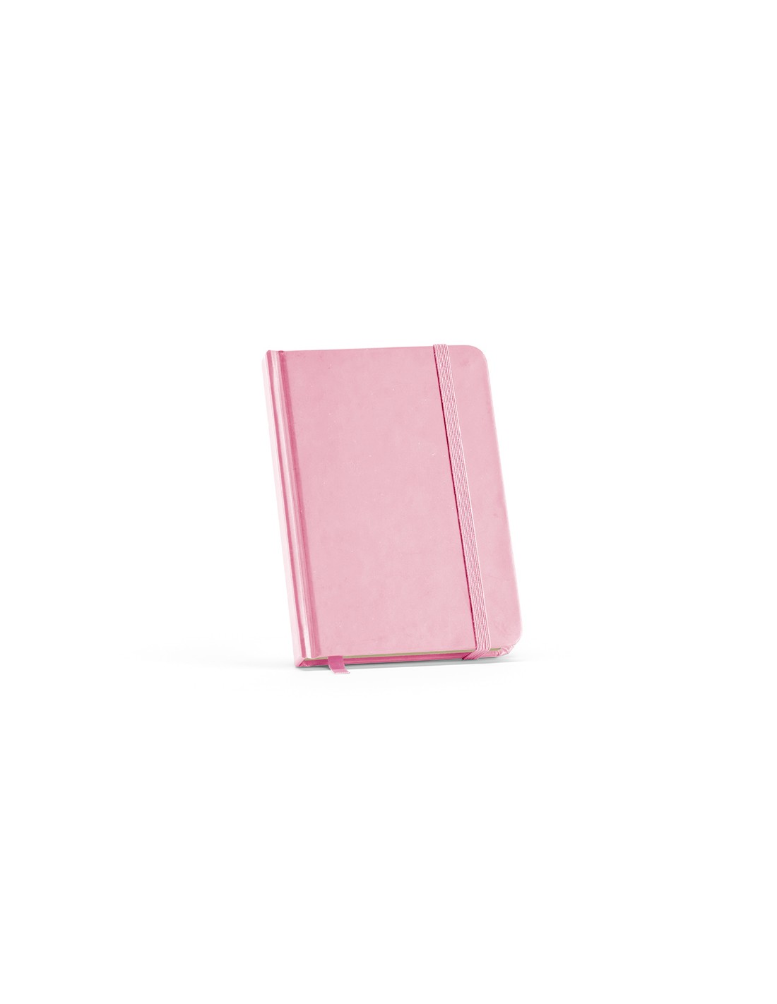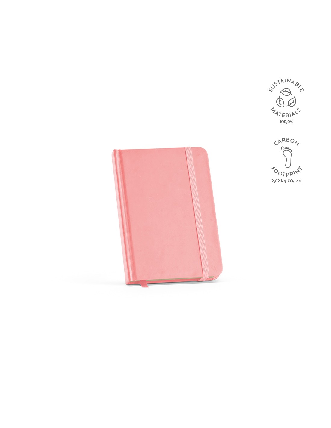 Notebook A5 in poliestere riciclato post consumo al 60% e copertina in PU al 40%. Rilegato con custodia. 256 pagine a righe in carta riciclata da 70 g/m² (128 fogli). Con 2 segnapagina in nastro di poliestere.