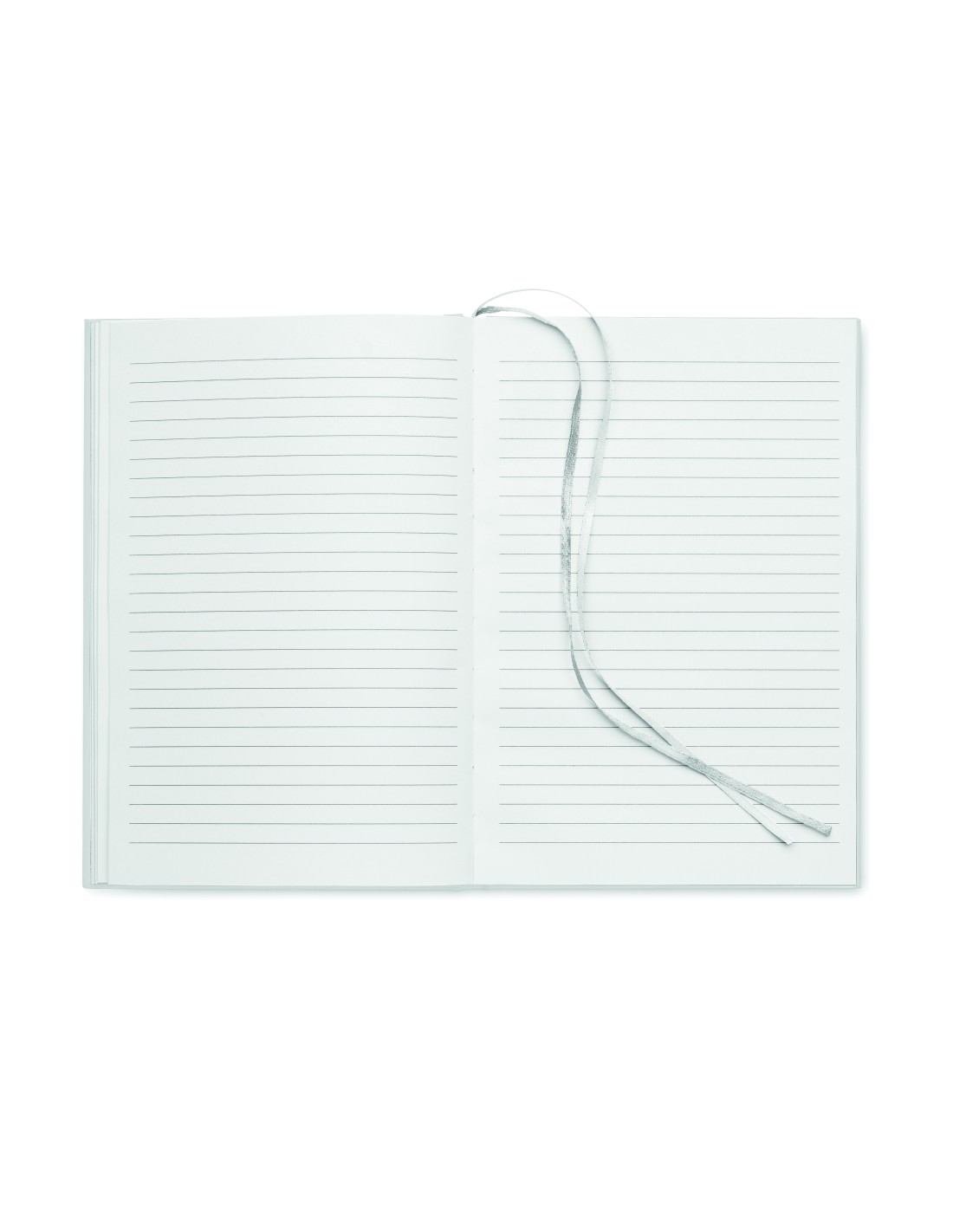 Notebook A5 in poliestere riciclato post consumo al 60% e copertina in PU al 40%. Rilegato con custodia. 256 pagine a righe in carta riciclata da 70 g/m² (128 fogli). Con 2 segnapagina in nastro di poliestere.