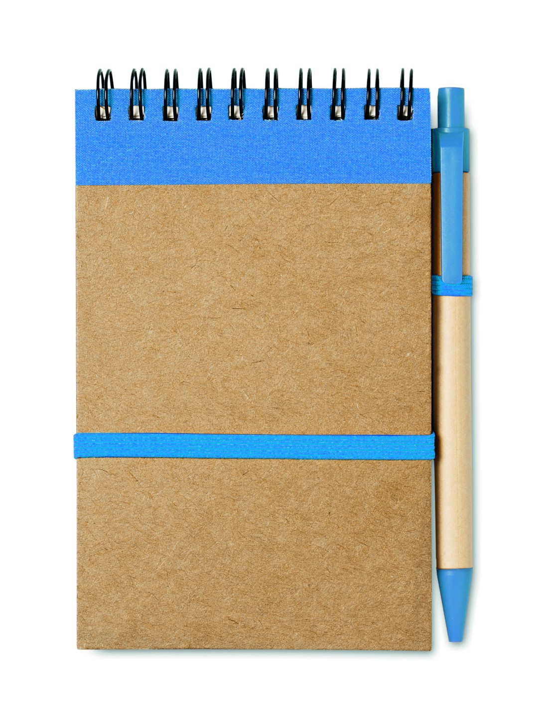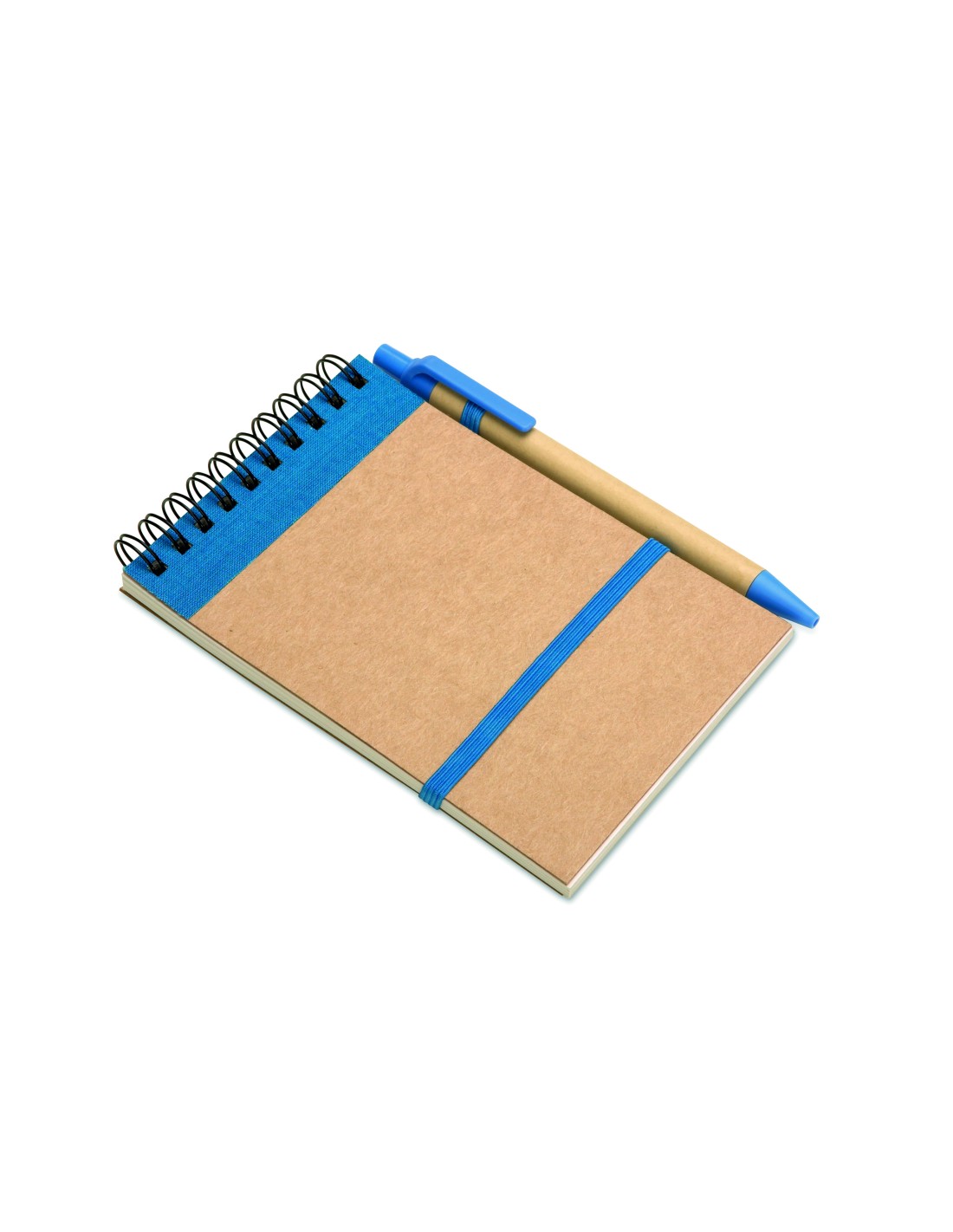 Notebook in carta riciclata con penna abbinata. Doppia spirale. 140 pagine di carta riciclata normale (70 fogli). Penna a sfera a pulsante abbinata in cartone riciclato e plastica biodegradabile. Inchiostro blu. Cinturino elastico di chiusura e portapenne. FSC®-certified | FSC MIX, P7.1, FSC-C213206