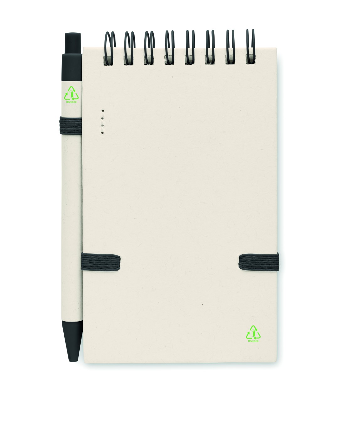 Notebook A6 da 70 fogli in carta comune (70% cartone del latte riciclato e 30% carta riciclata) con penna abbinata. Rilegato ad anelli. Penna a sfera a pulsante abbinata. Inchiostro blu. Cinghia di chiusura elastica e portapenne.