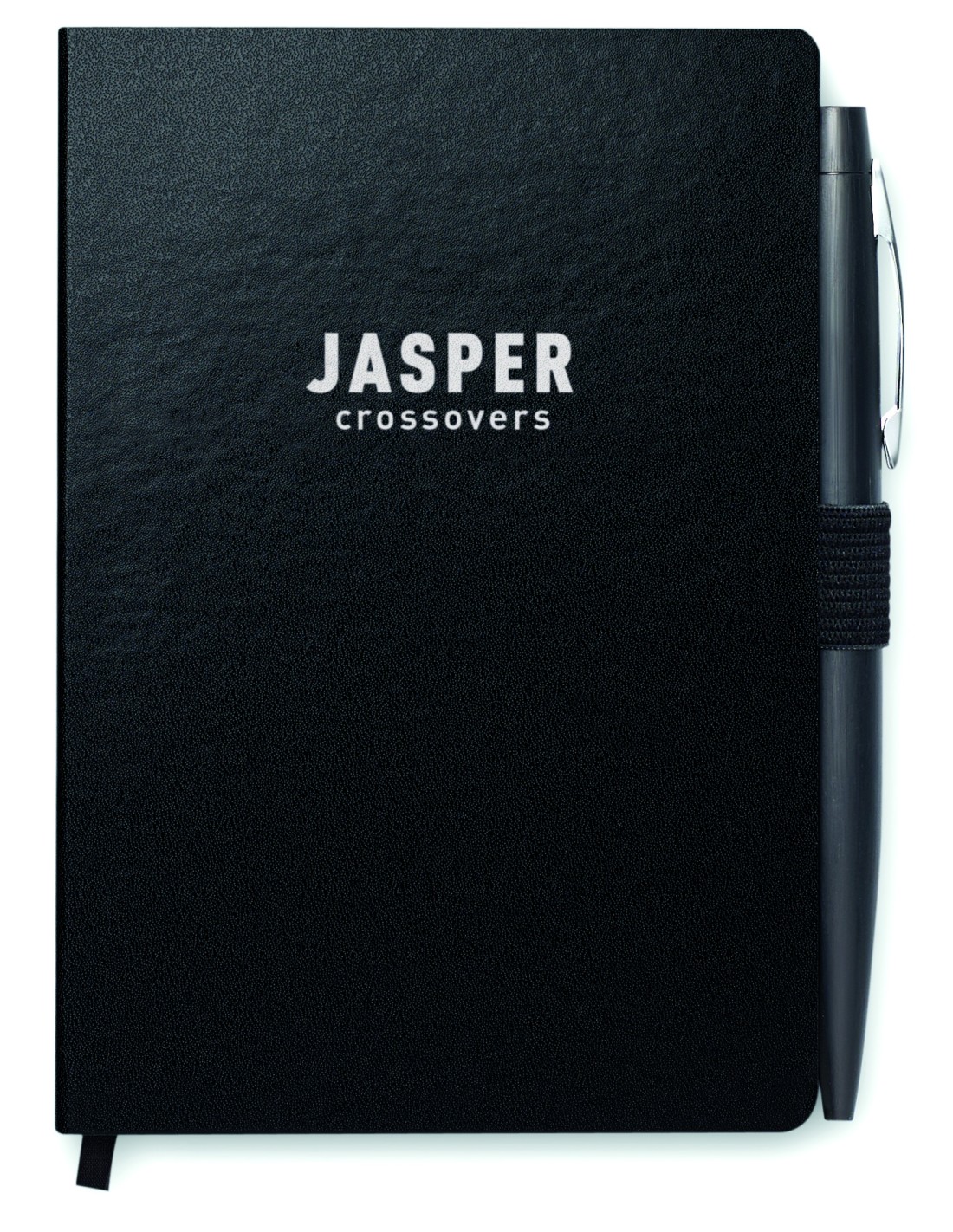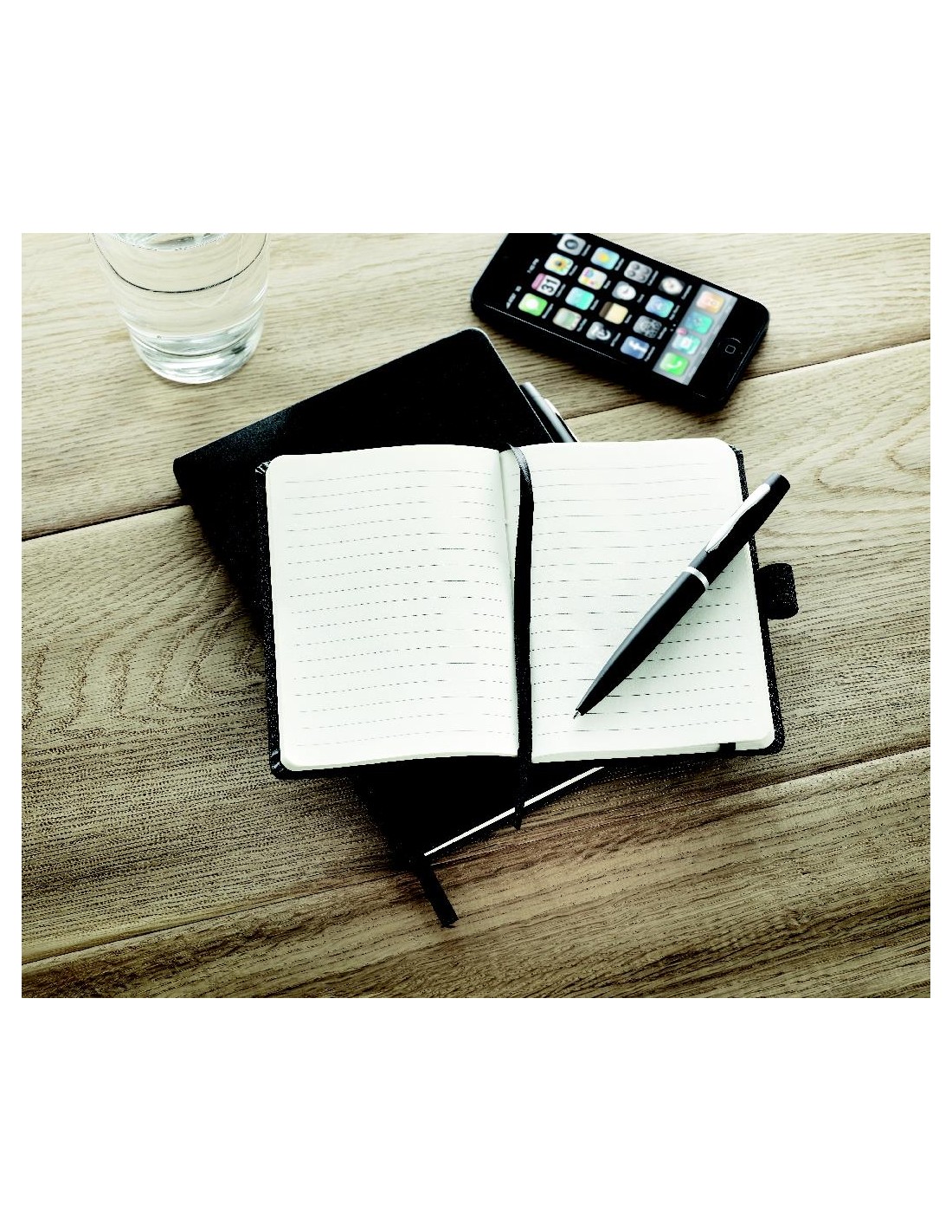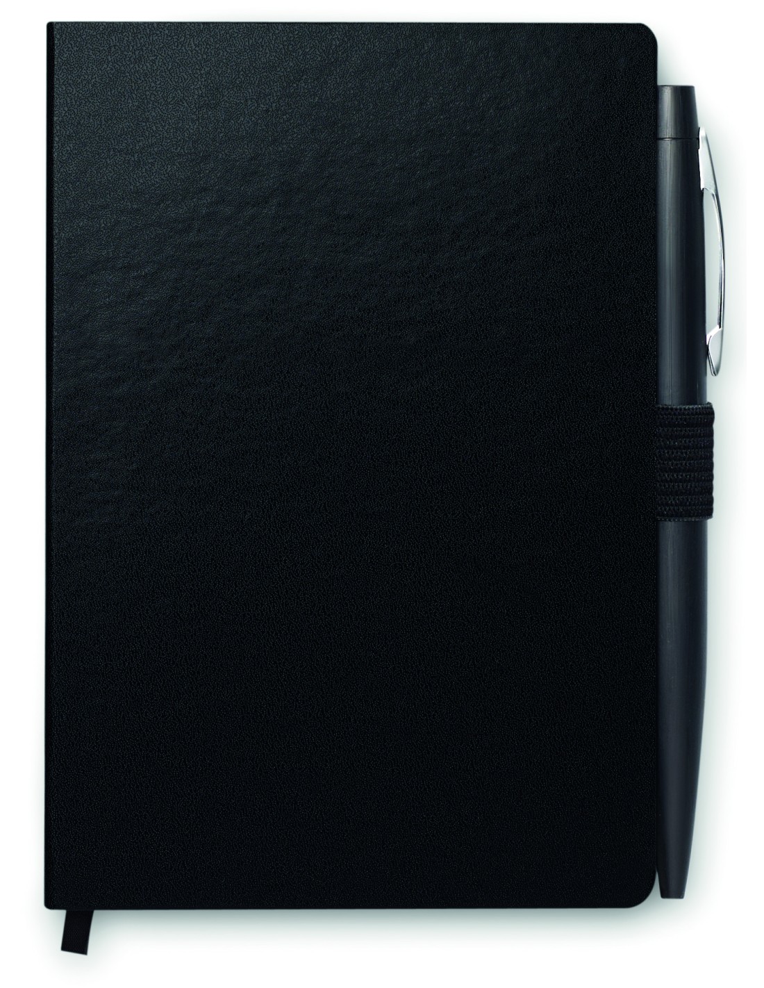 Notebook A6 con penna. Copertura rigida in PU. 144 pagine a righe (72 fogli). Cinturino di chiusura elastico e portapenne abbinati. Penna a sfera a bottone in metallo abbinata. Inchiostro blu. FSC MIX CREDIT | P7.1 | FSC-C213206