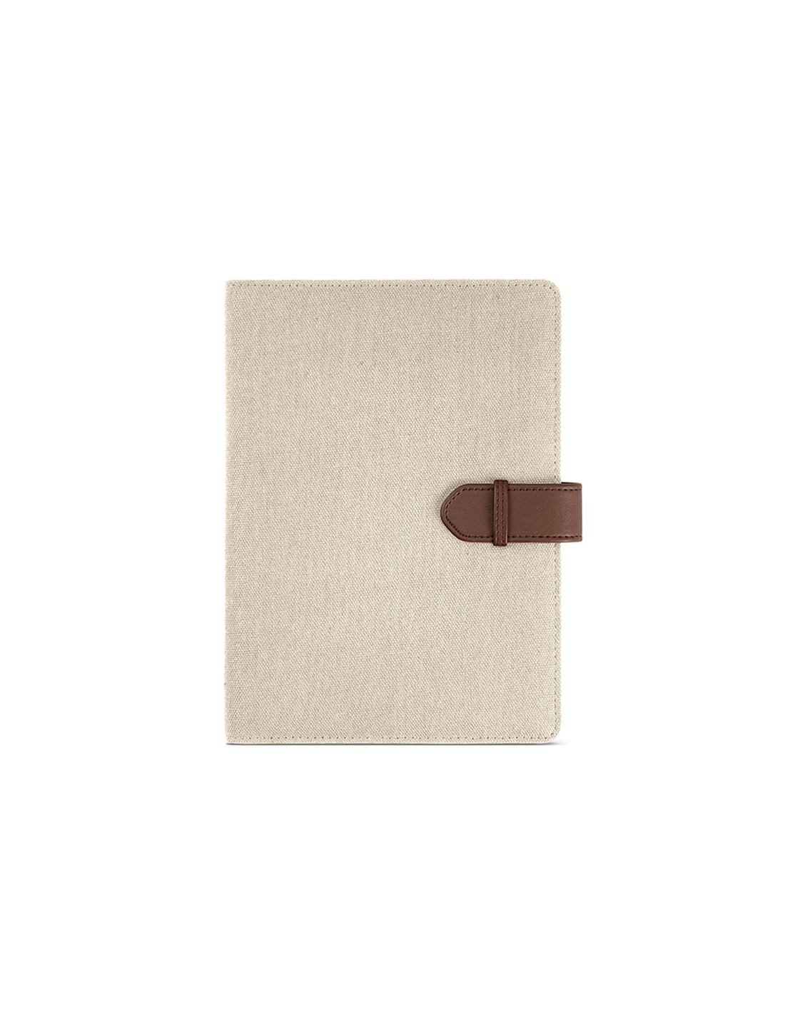Cartella formato A5 Eliot in tela di cotone riciclato, con pratica chiusura a pressione in PU riciclato. Include un blocco da 64 fogli puntinati certificati FSC (70 gsm) con spazio integrato per data e numero di pagina, tasca per telefono, doppio portapenne e 2 slot per carte. Progettata all’insegna della sostenibilità, è il tuo compagno di stile verso il successo. Confezionata in una scatola kraft individuale.