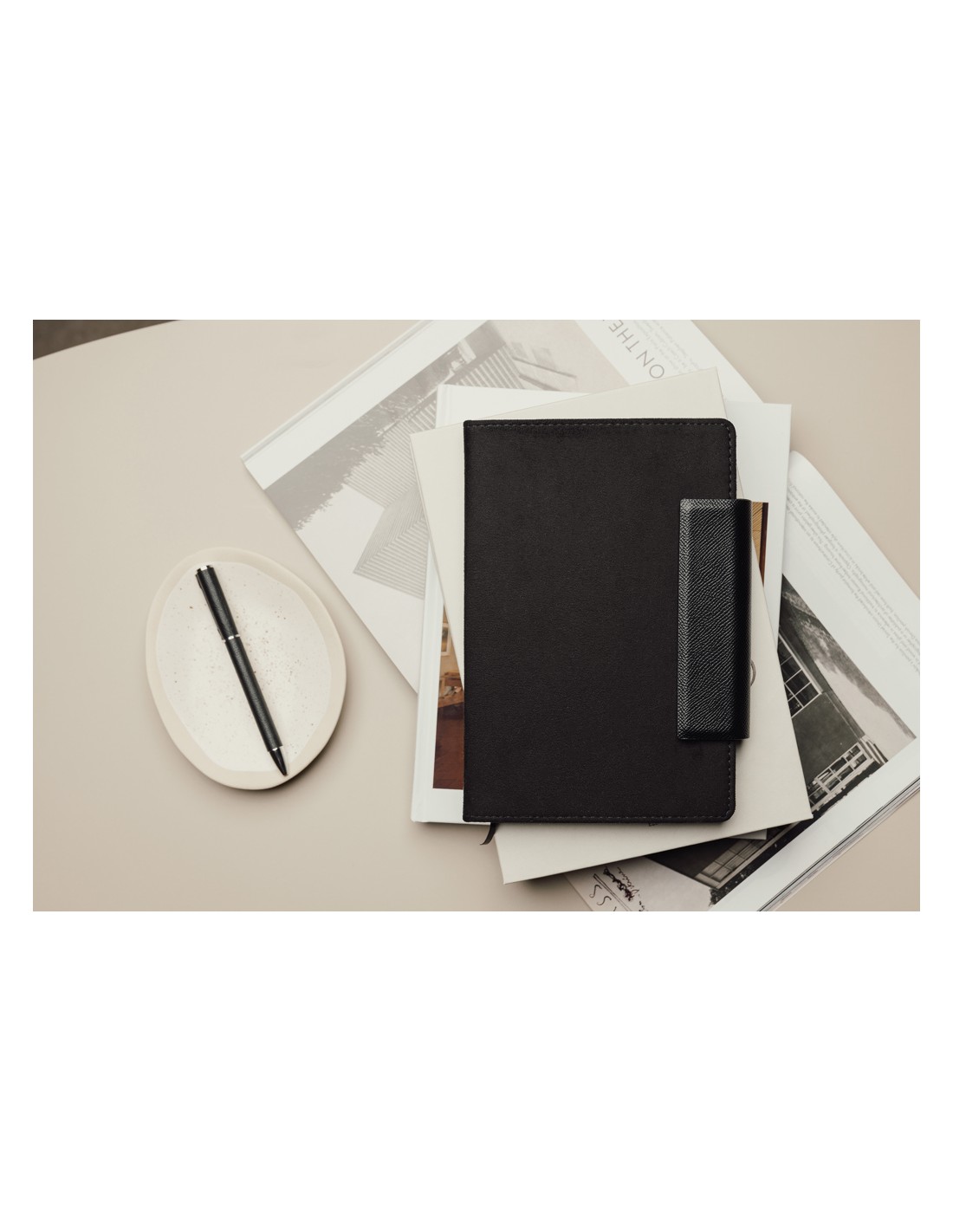 Un elegante taccuino A5 composto da 160 pagine a righe (80 fogli). È l'accessorio perfetto da portare alle riunioni, per tenere in ordine i tuoi appunti con stile. Il taccuino Marlow combina un design intramontabile con finitura in ecopelle riciclata, dettagli in PU e carta riciclata. Il taccuino è dotato di una pratica ed elegante chiusura magnetica. Certificato GRS (Global Recycled Standard), la certificazione GRS garantisce che l'intera catena di approvvigionamento dei materiali riciclati è certificata. Il contenuto totale riciclato si basa sul peso complessivo del prodotto. Questo prodotto contiene il 50% di carta riciclata certificata GRS e il 6% di poliestere riciclato certificato GRS.