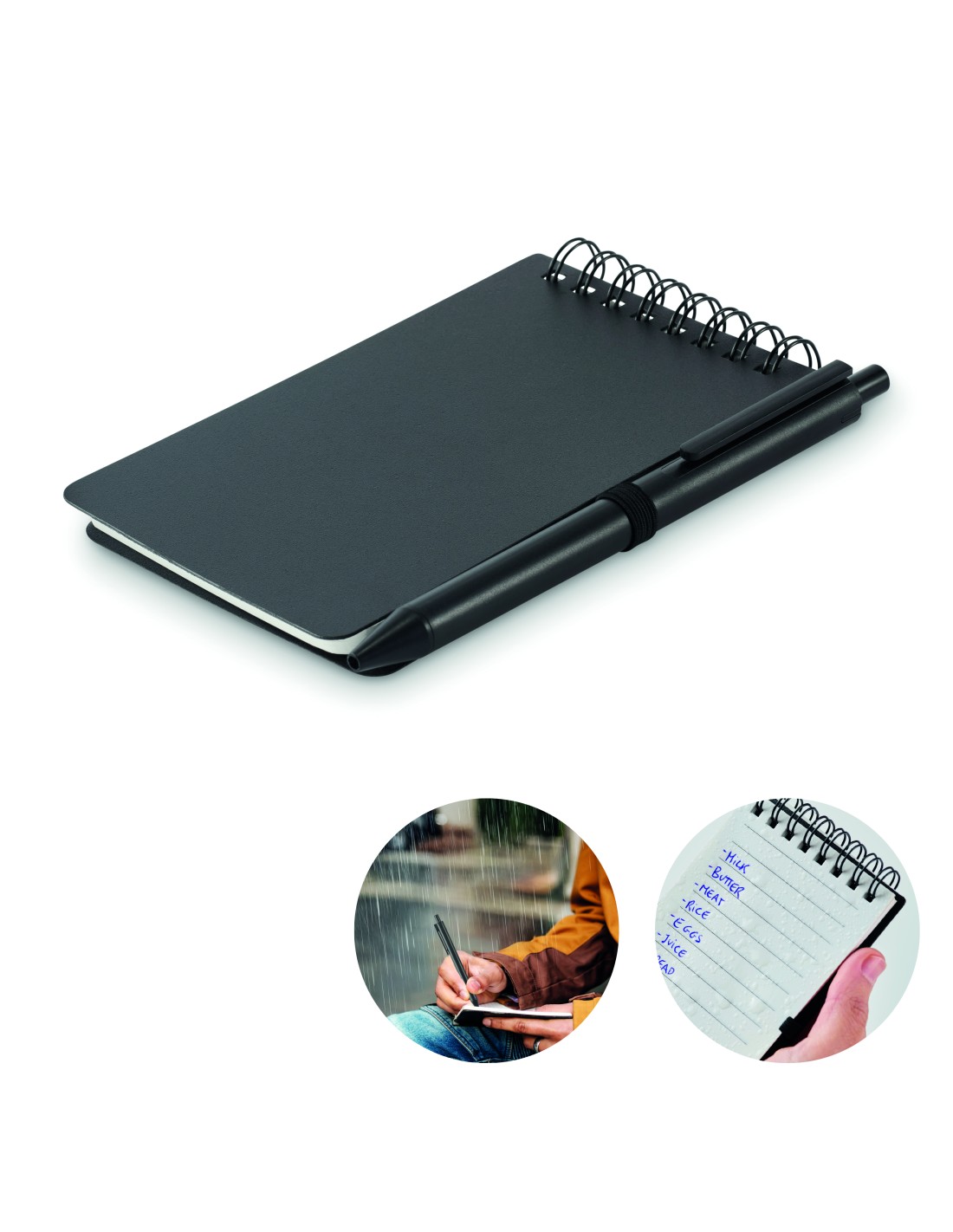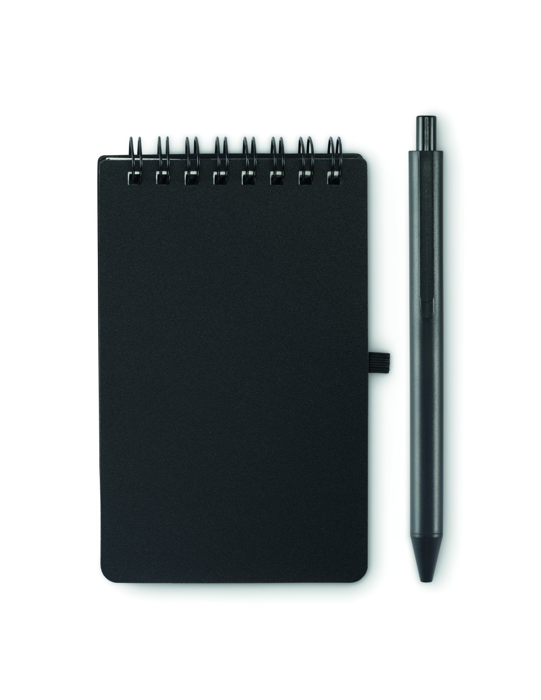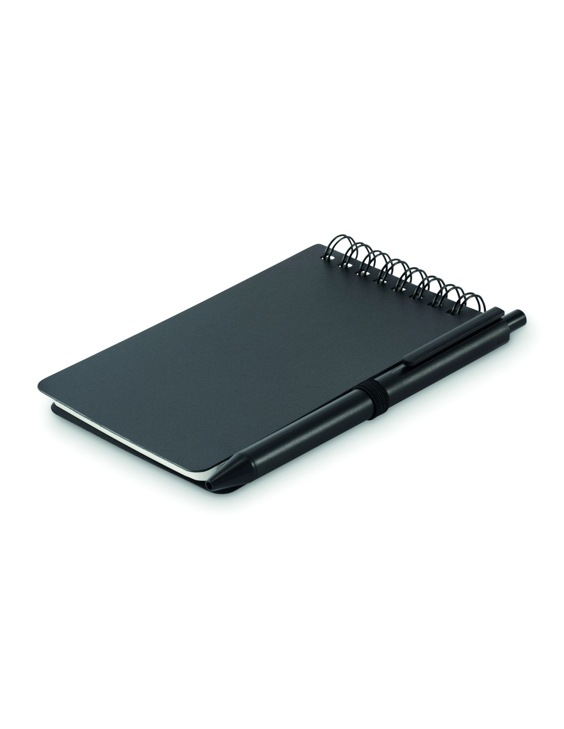 Notebook in carta riciclata con penna. Doppia spirale. 140 pagine di carta riciclata normale (70 fogli). Penna a sfera a pulsante in cartone riciclato e plastica biodegradabile. Inchiostro blu. Portapenne elastico nero. FSC MIX CREDIT | P7.1 | FSC-C213206