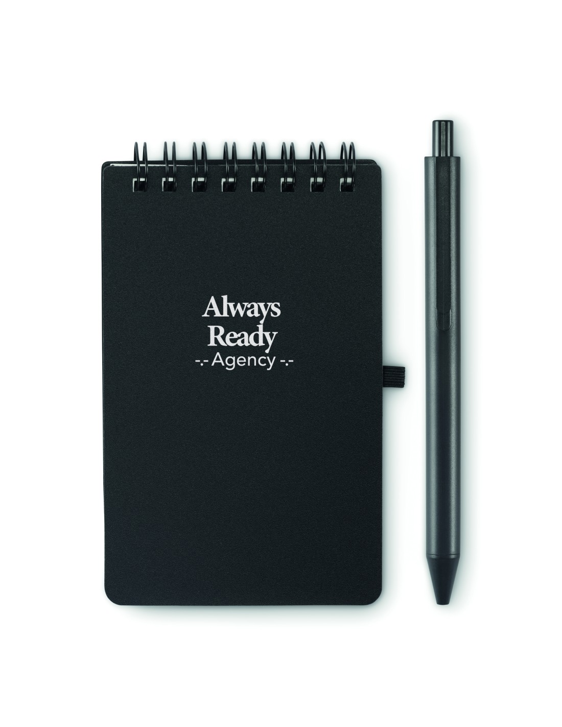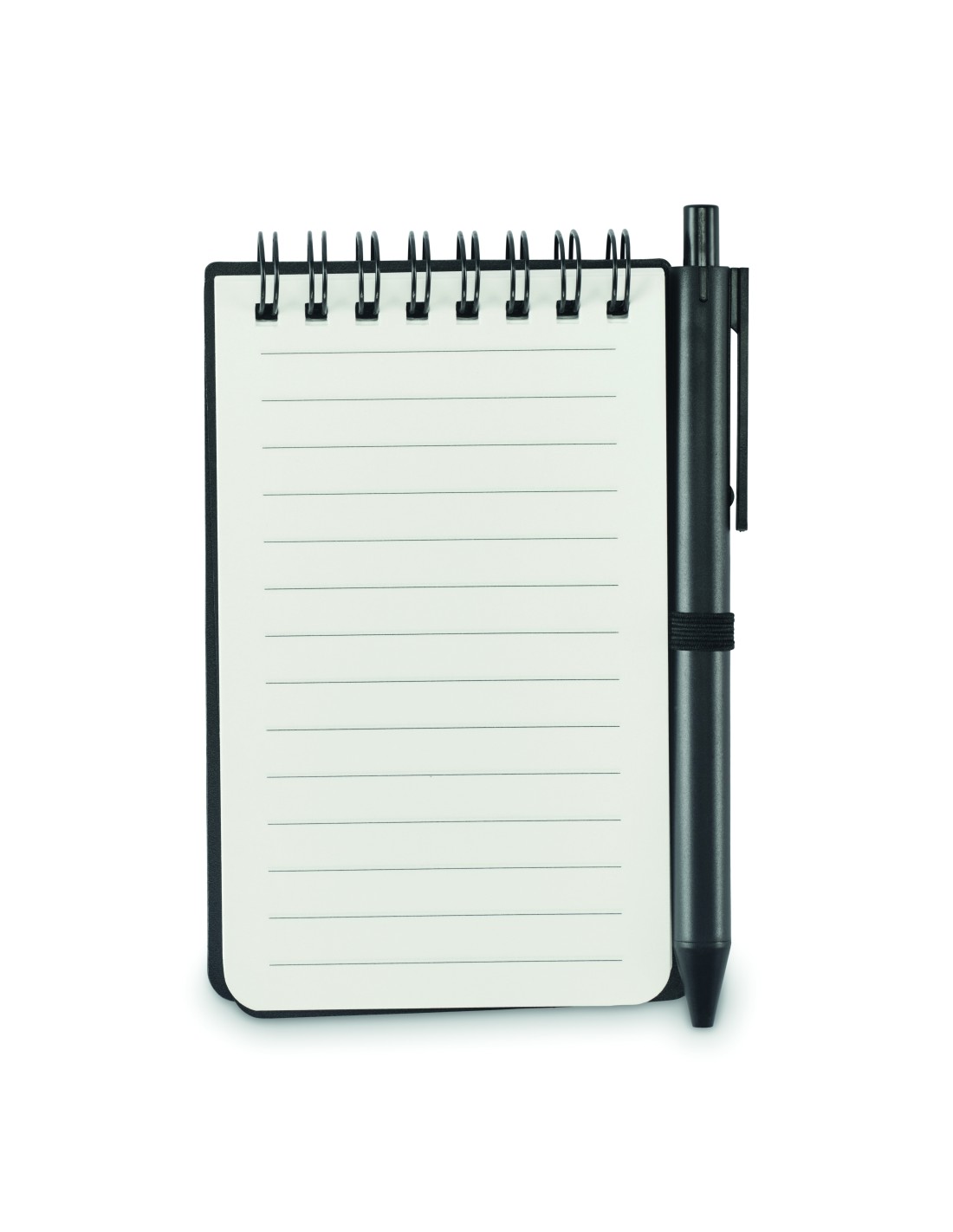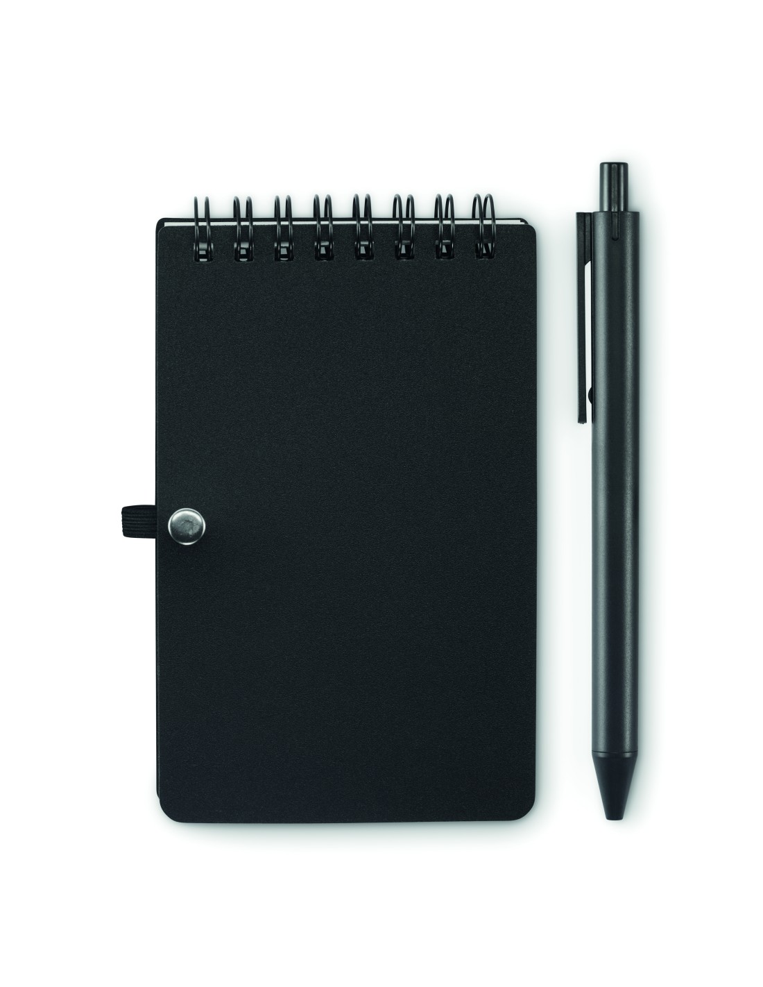 Notebook in carta riciclata con penna. Doppia spirale. 140 pagine di carta riciclata normale (70 fogli). Penna a sfera a pulsante in cartone riciclato e plastica biodegradabile. Inchiostro blu. Portapenne elastico nero. FSC MIX CREDIT | P7.1 | FSC-C213206