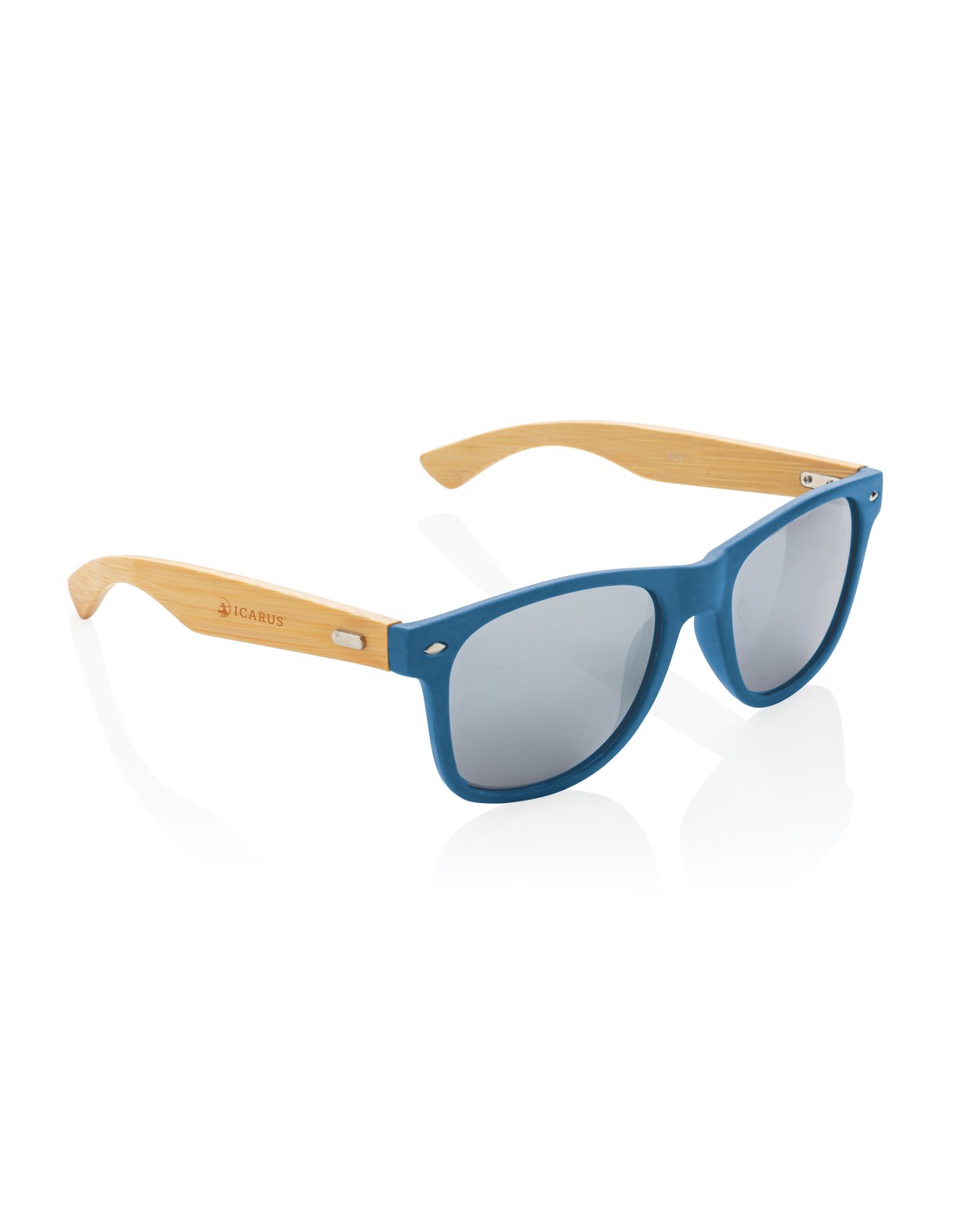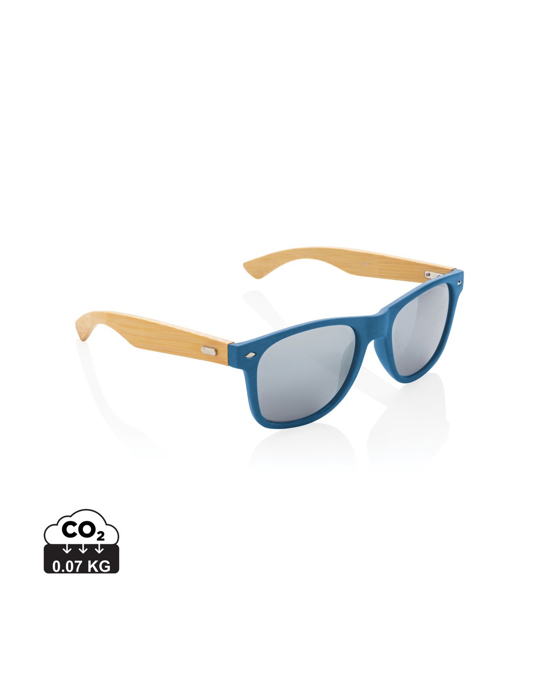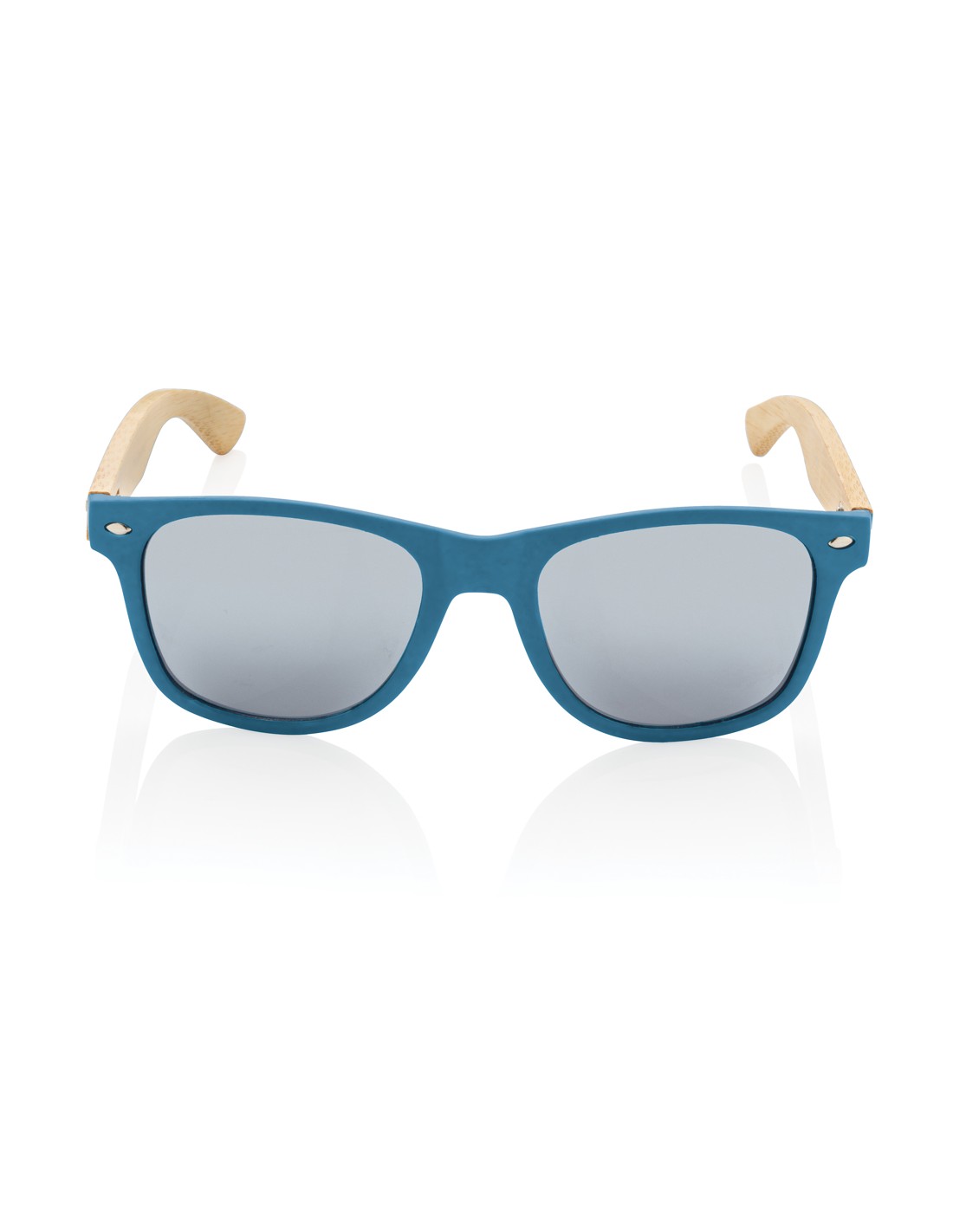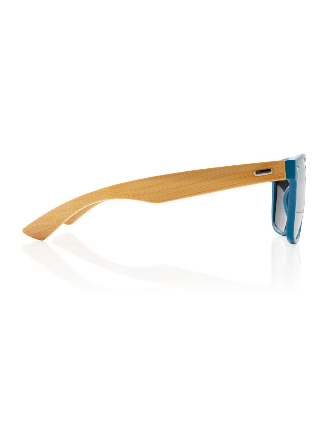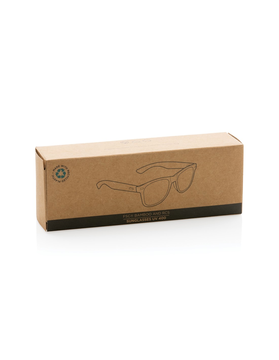 Occhiali da sole realizzati con montatura in PC riciclato certificato RCS e stecche in bambù FSC® 100%. Il contenuto riciclato del telaio è al 100%. Contenuto totale riciclato: 41% in base al peso totale dell'articolo. La certificazione RCS garantisce una filiera completamente certificata dei materiali riciclati. Le lenti sono in acrilico smokey e sono conformi a EN ISO 12312-1, UV 400 e CAT 3. Confezionate in scatola FSC®.
