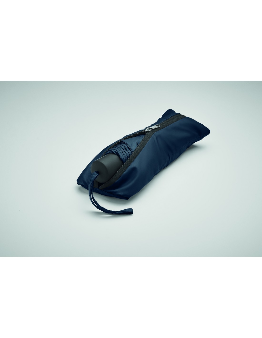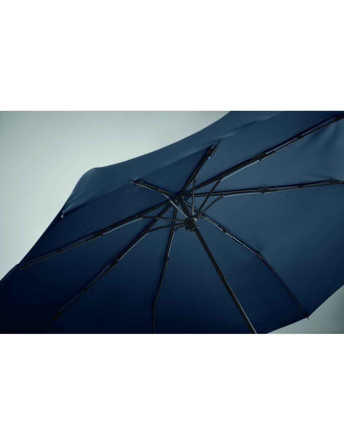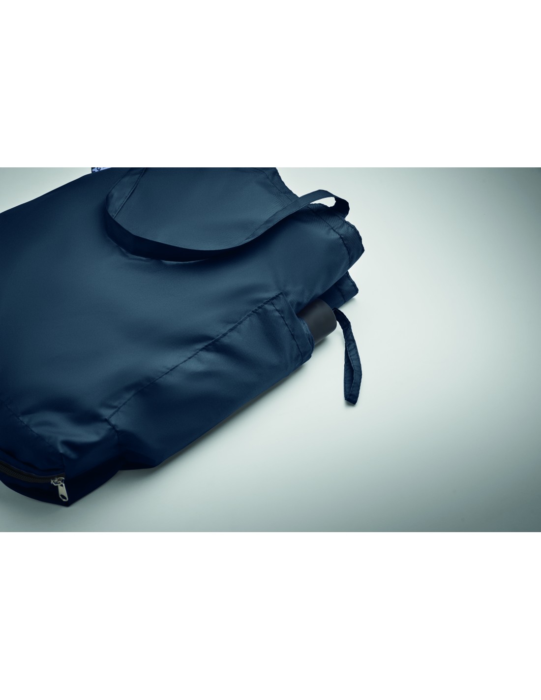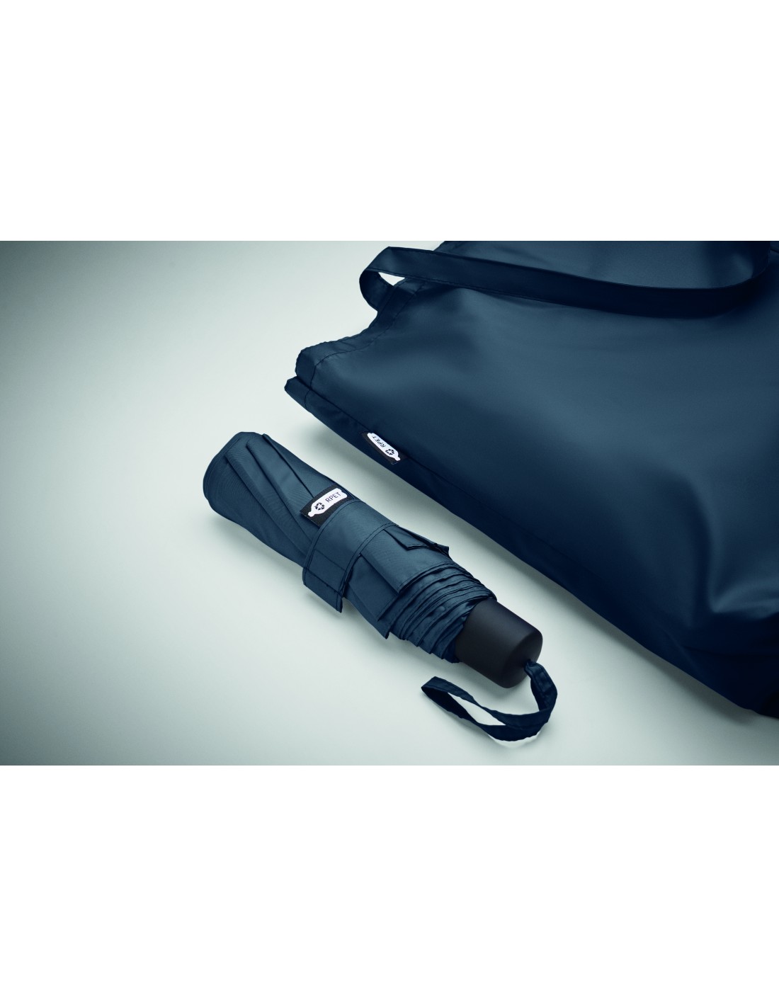 Ombrello antivento da 21 pollici con apertura e chiusura manuale a 3 pieghe in pongee RPET 190T. Custodia inclusa. Ha uno scomparto nascosto con cerniera per contenere l'ombrello e mantenere asciutto il contenuto della borsa. Quando la borsa non è in uso, si arrotola e lo scomparto con cerniera funge da custodia per l'ombrello.