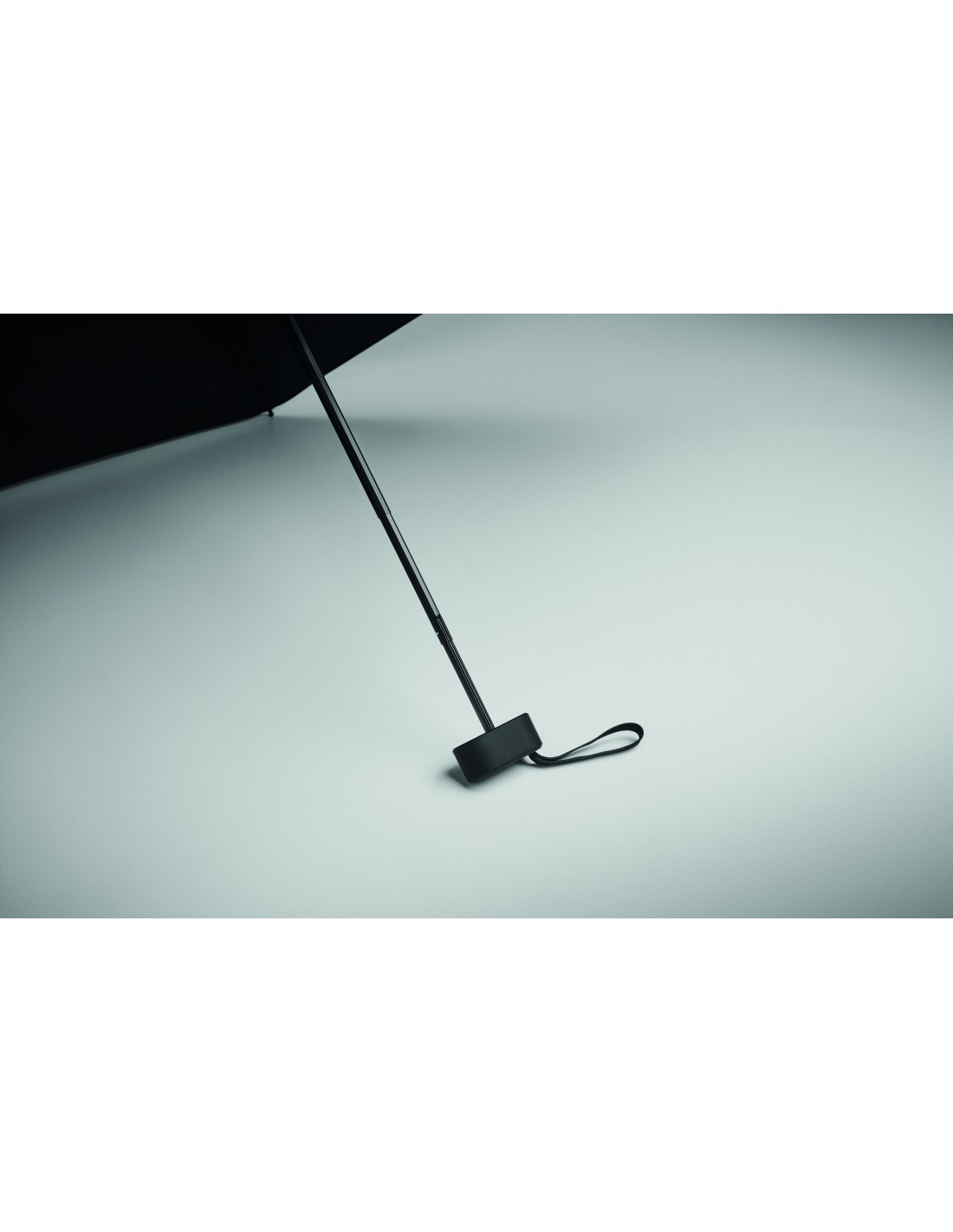 Ombrello 21'' pieghevole, 3 sezioni con tessuto pongee RPET da 190T. Struttura placcata nera e nervature con manico in legno. Apertura e chiusura manuale. Sacca nello stessomateriale.