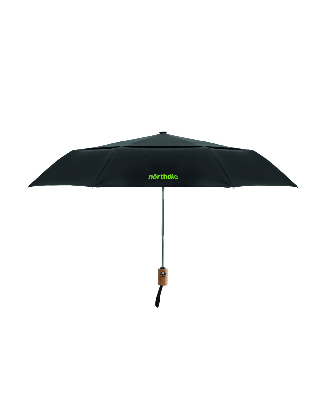 Ombrello antivento da 21''a 2 segmenti, apertura automatica in policotone 190T, fusto e punte in alluminio e manico in bambù. Stecche in fibra di vetro nera. Custodia coordinata. Chiusura automatica.