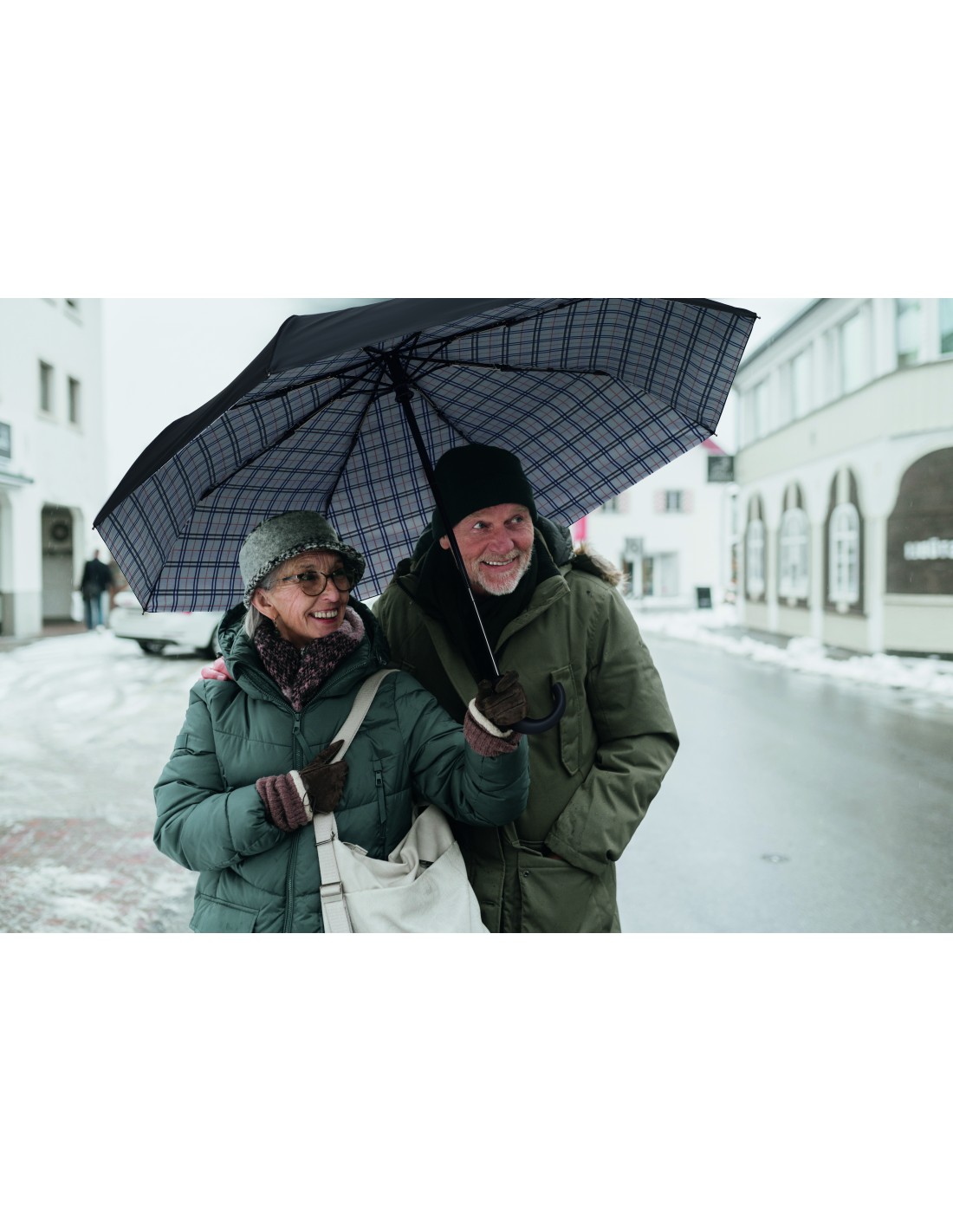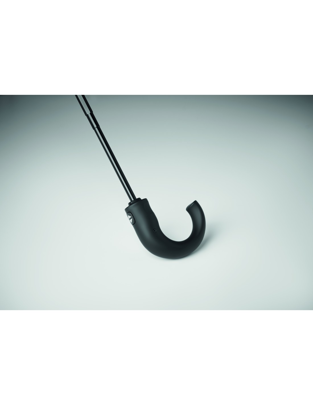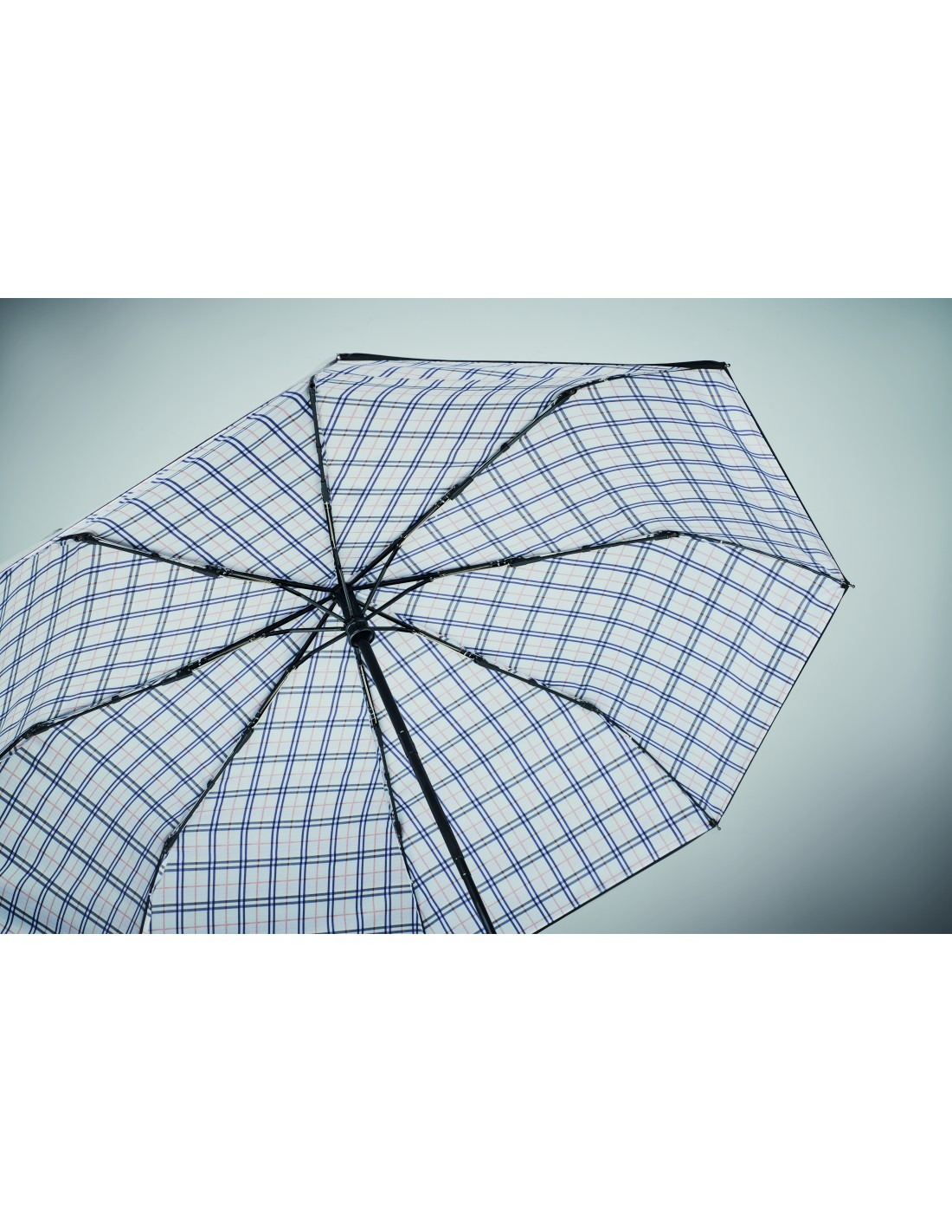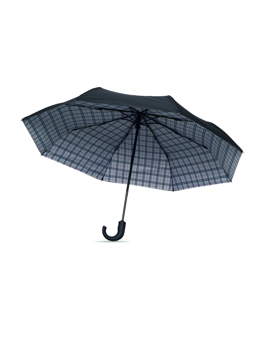 Ombrello antivento a 3 segmenti, apertura/chiusura automatica, 23'' in pongee 190T a doppio strato con motivo interno a quadri. Telaio e fusto placcati in nero. Parte centrale a due sezioni in fibra di vetro nera nichelata. Manico in legno curvo.
