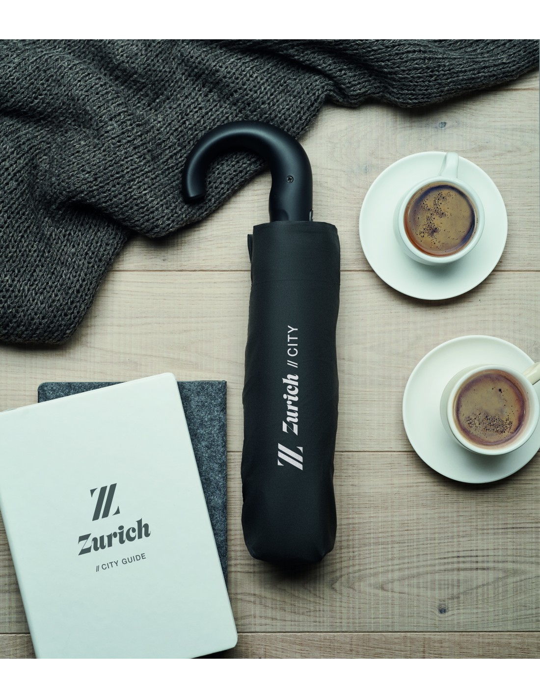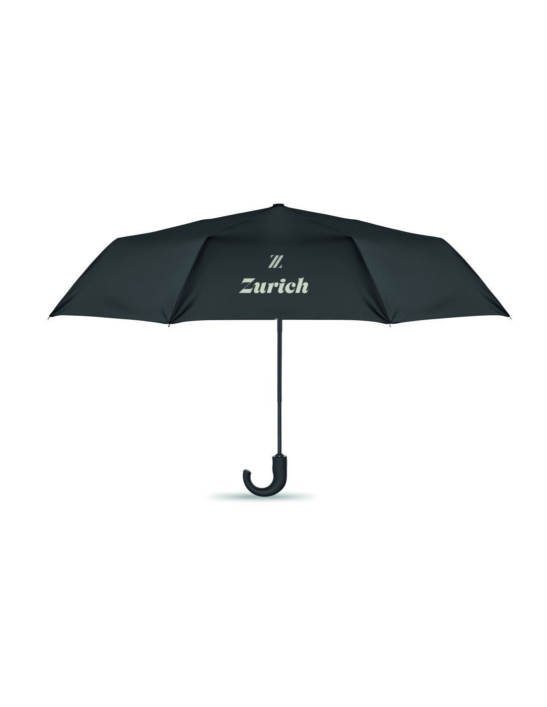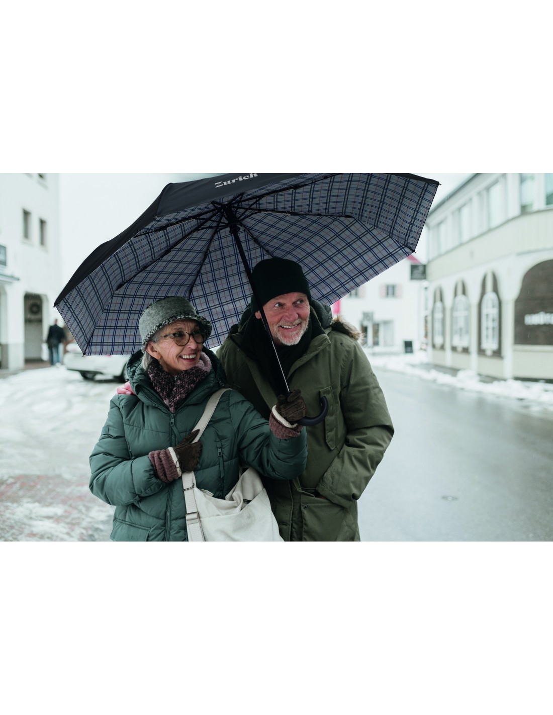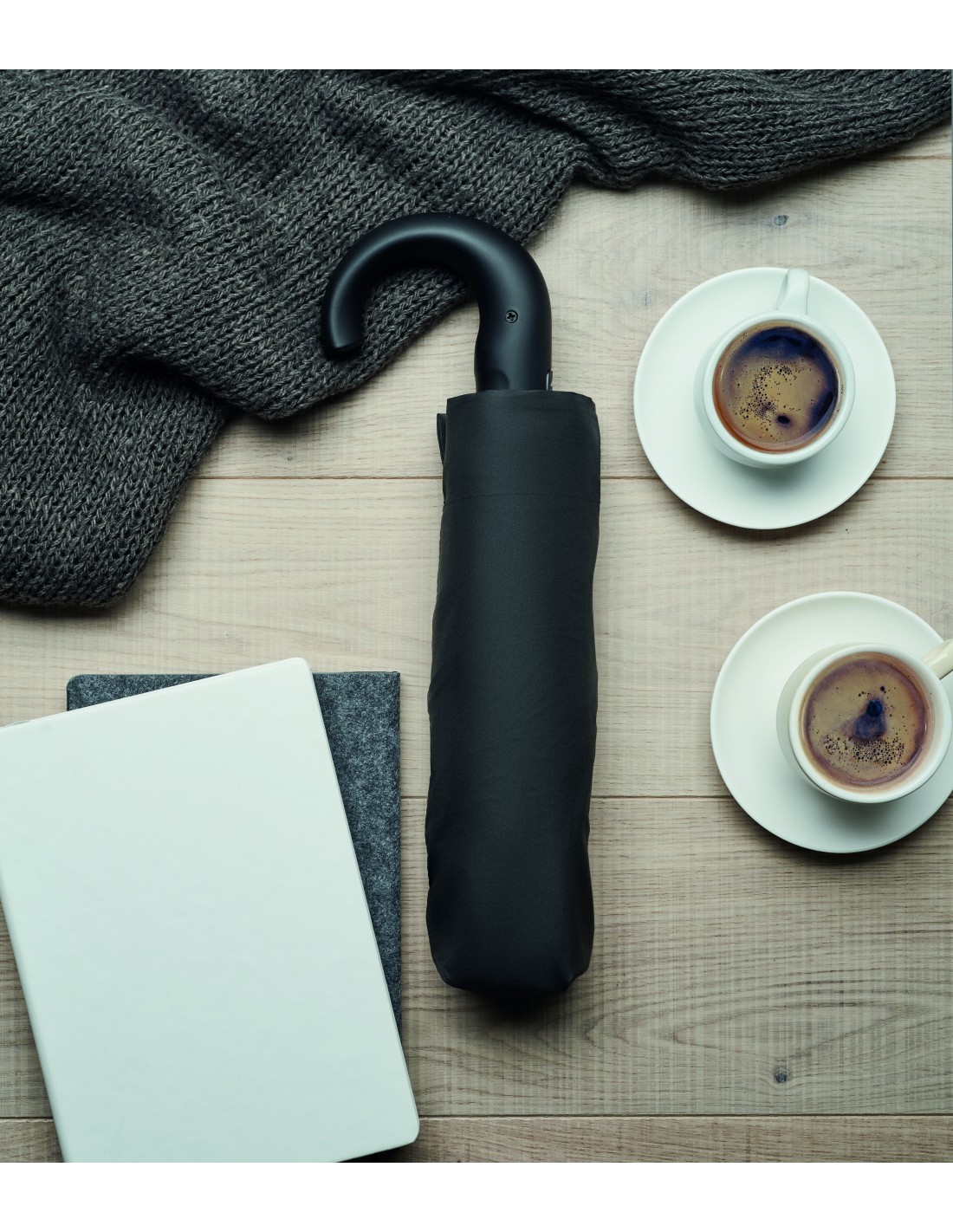 Ombrello antivento a 3 segmenti, apertura/chiusura automatica, 23'' in pongee 190T a doppio strato con motivo interno a quadri. Telaio e fusto placcati in nero. Parte centrale a due sezioni in fibra di vetro nera nichelata. Manico in legno curvo.