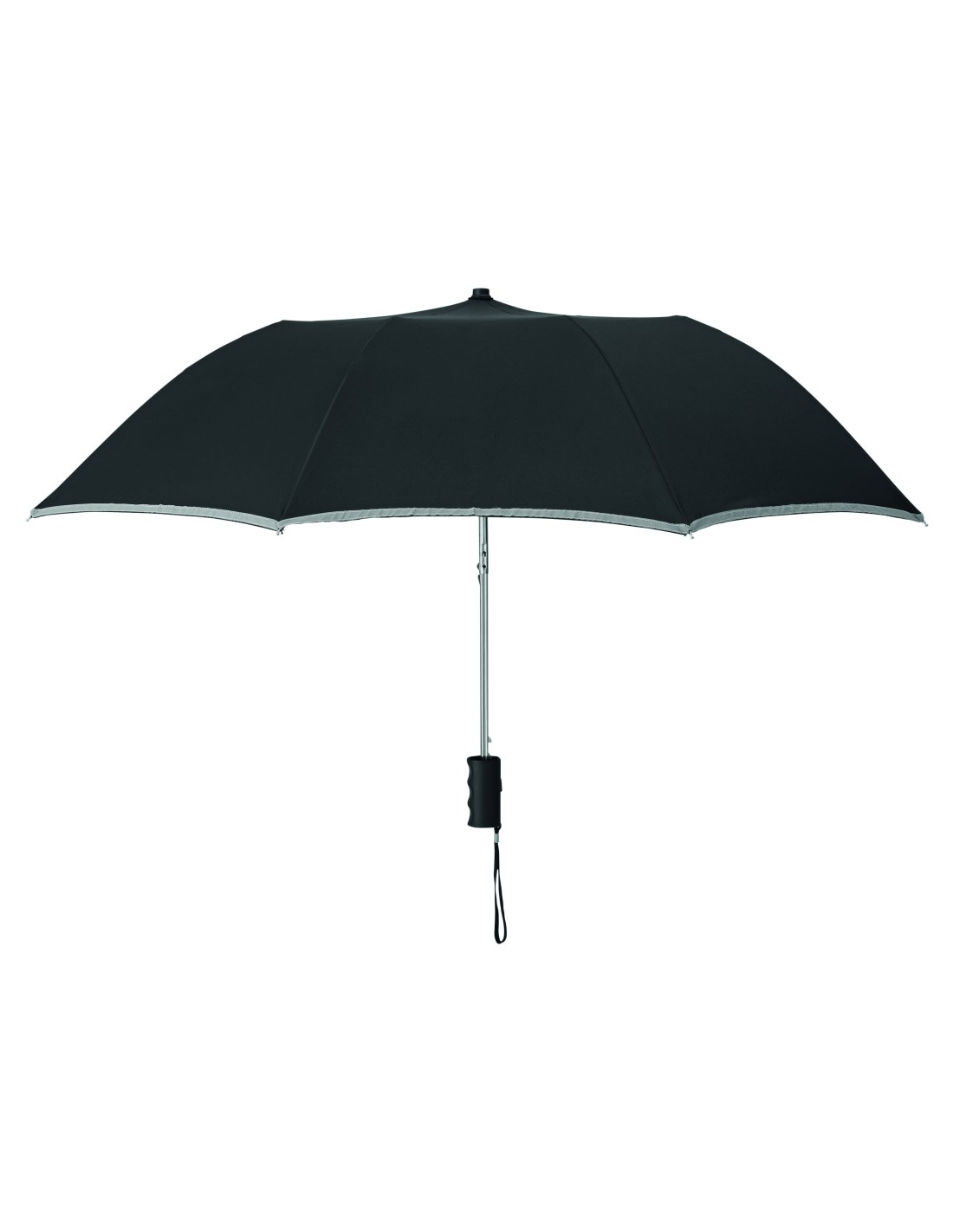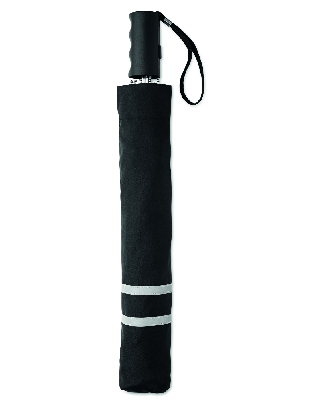 Ombrello antivento a 3 segmenti, apertura/chiusura automatica, 23'' in pongee 190T a doppio strato con motivo interno a quadri. Telaio e fusto placcati in nero. Parte centrale a due sezioni in fibra di vetro nera nichelata. Manico in legno curvo.