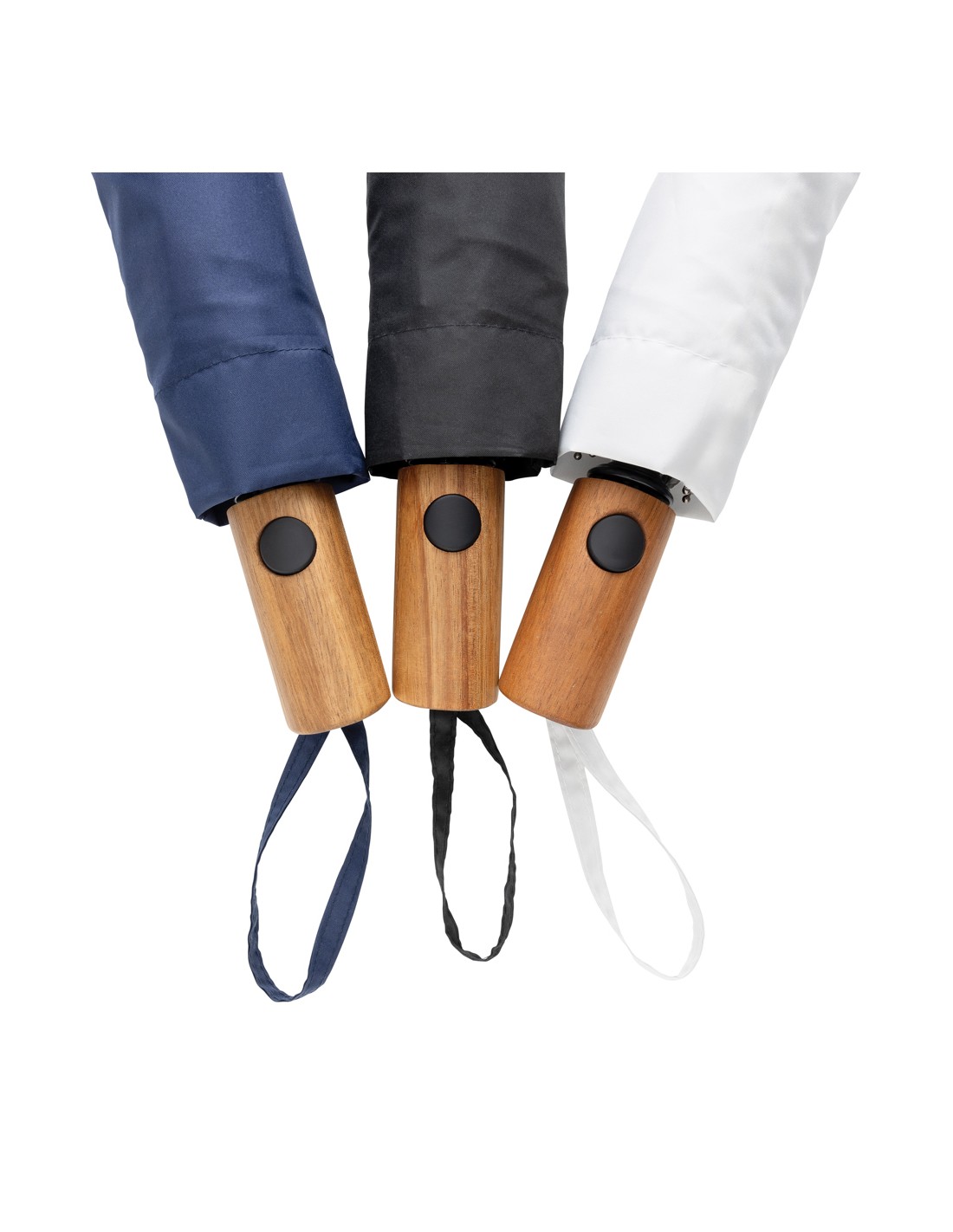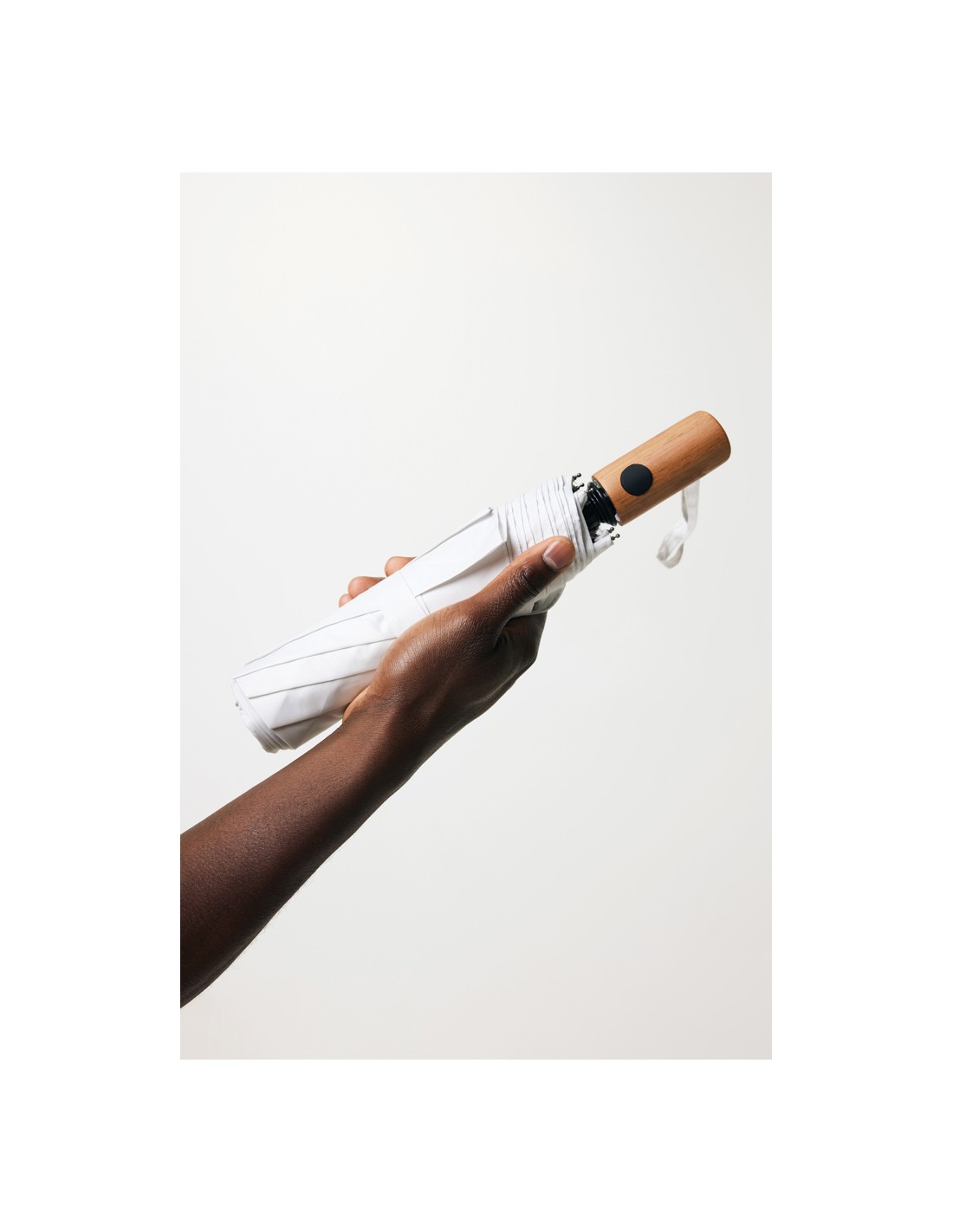 Questo mini-ombrello compatto, a 3 pezzi e ad apertura automatica, è ideale da tenere in borsa o in auto in caso di maltempo. Presenta una struttura in metallo, stecche in fibra di vetro e un bellissimo manico in legno di acacia certificato FSC®. E' realizzato in rPET, che contiene un tracciante AWARE™ che attesta l'autenticità dei materiali riciclati. Il 2% del ricavato di ogni prodotto Aware™ venduto sarà devoluto a Water.org. Da notare che il manico in legno di acacia può variare leggermente nel colore e nella consistenza. Ciò non influisce sulla sua funzionalità o durata.
