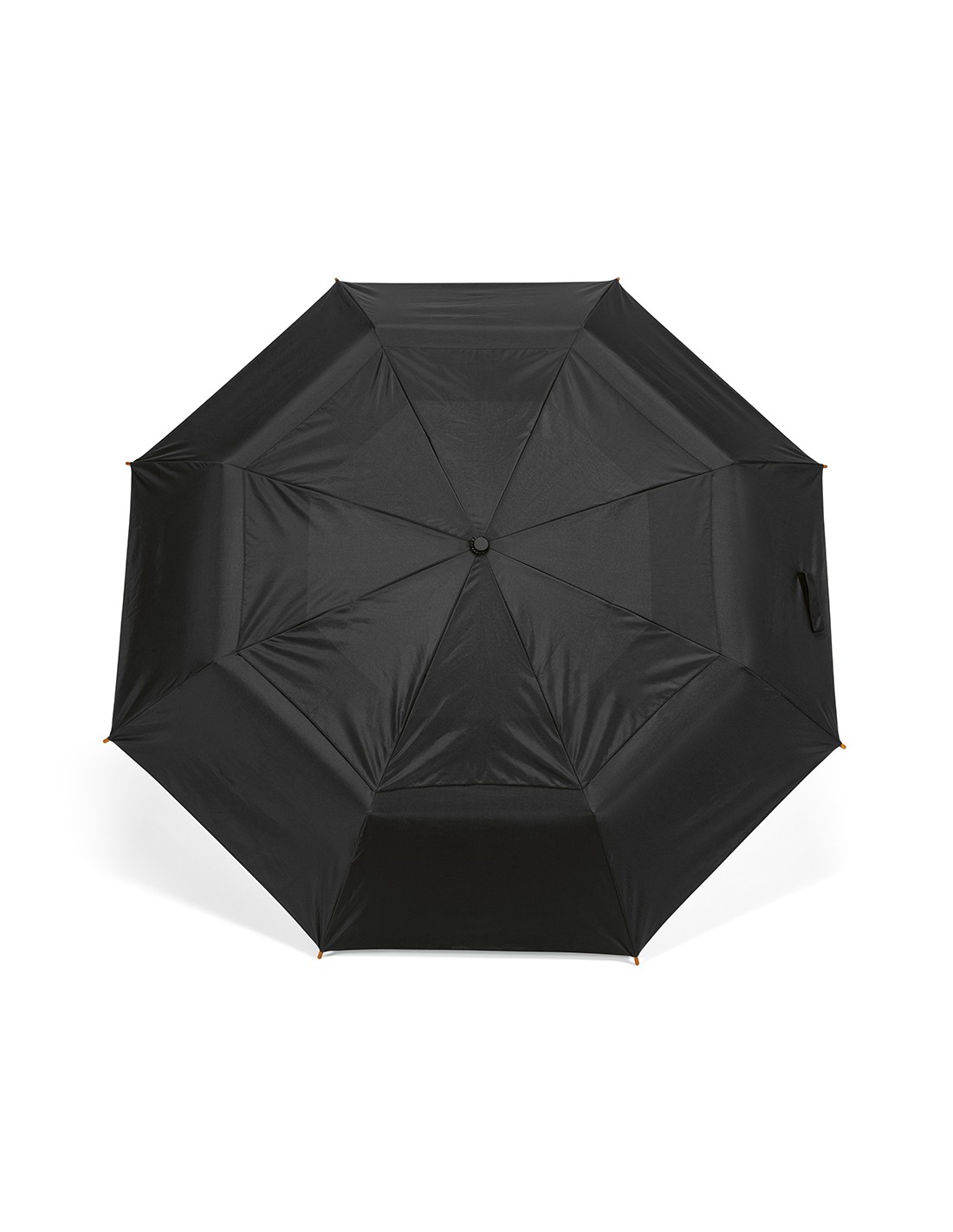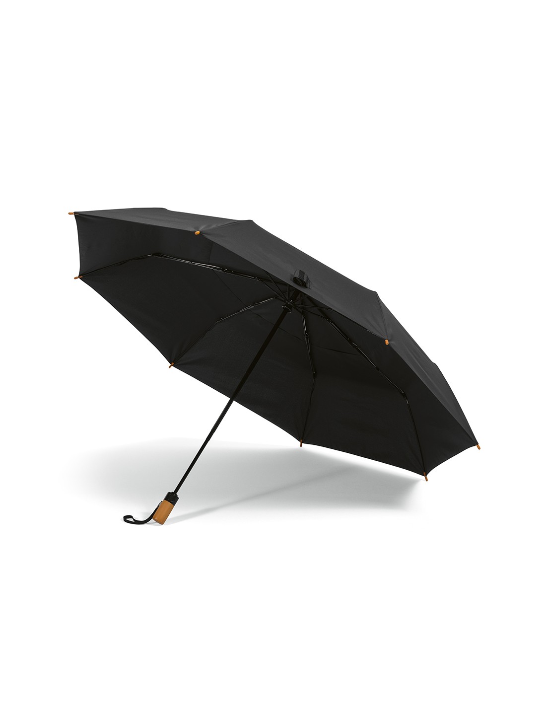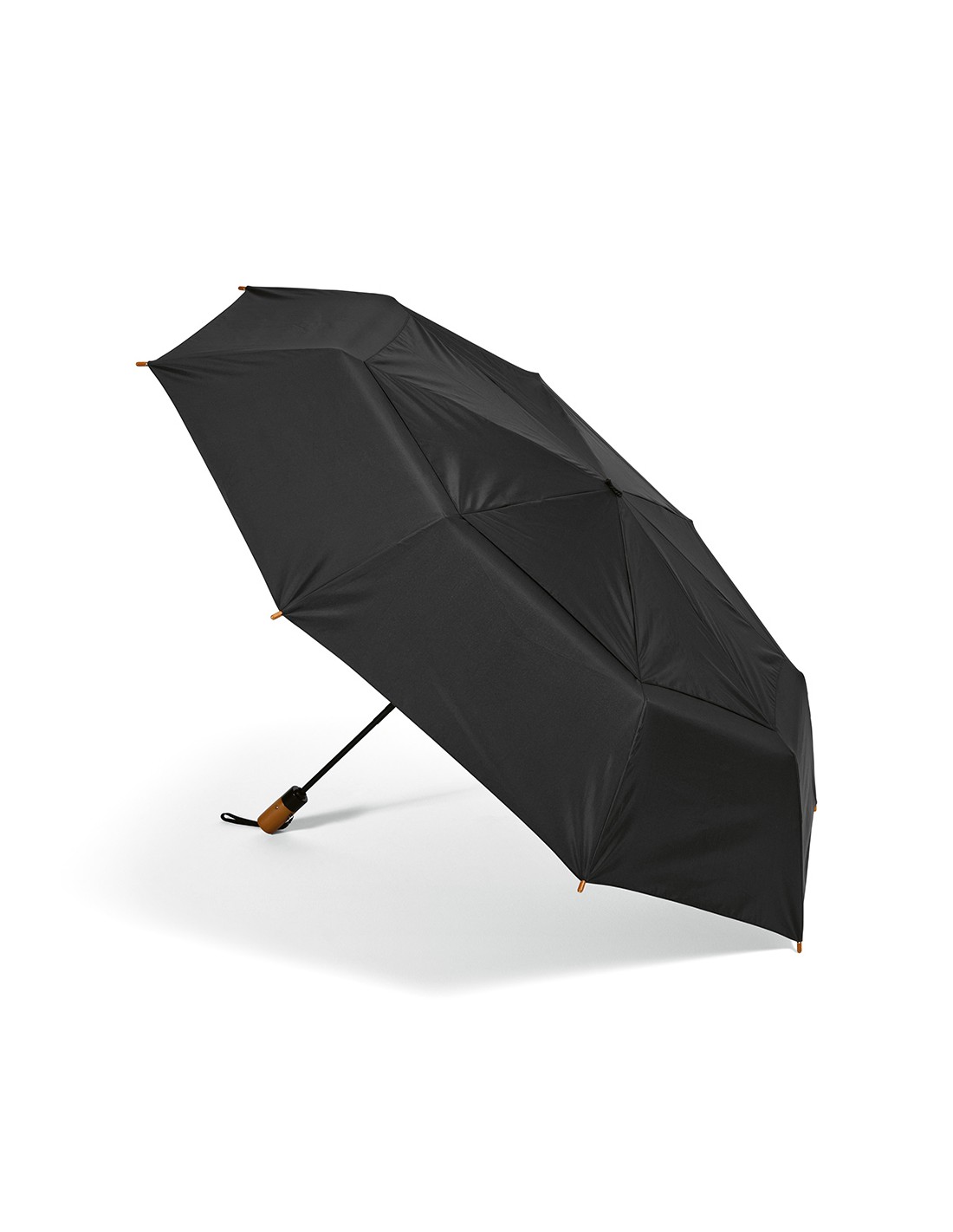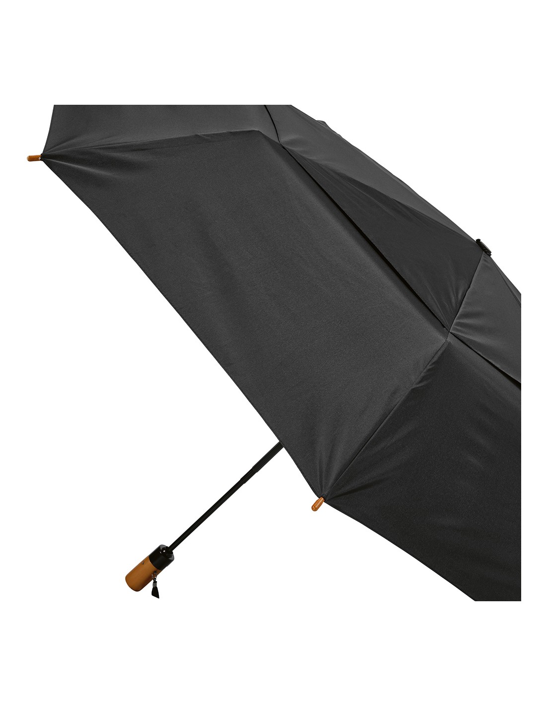 Ombrello pieghevole Jackson 27'' in rPET. Con apertura e chiusura automatica, è molto pratico da trasportare. Struttura resistente al vento in fibra di vetro, manico in legno e asta in alluminio riciclato. Fornito con custodia individuale in rPET.