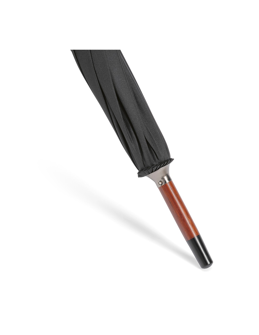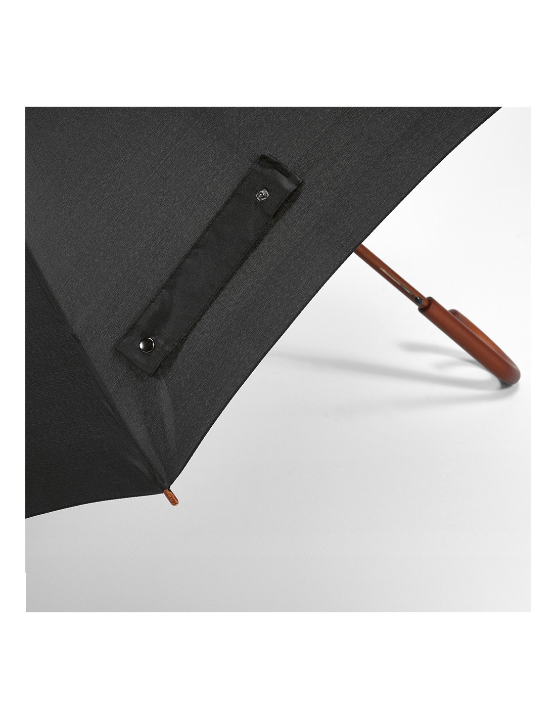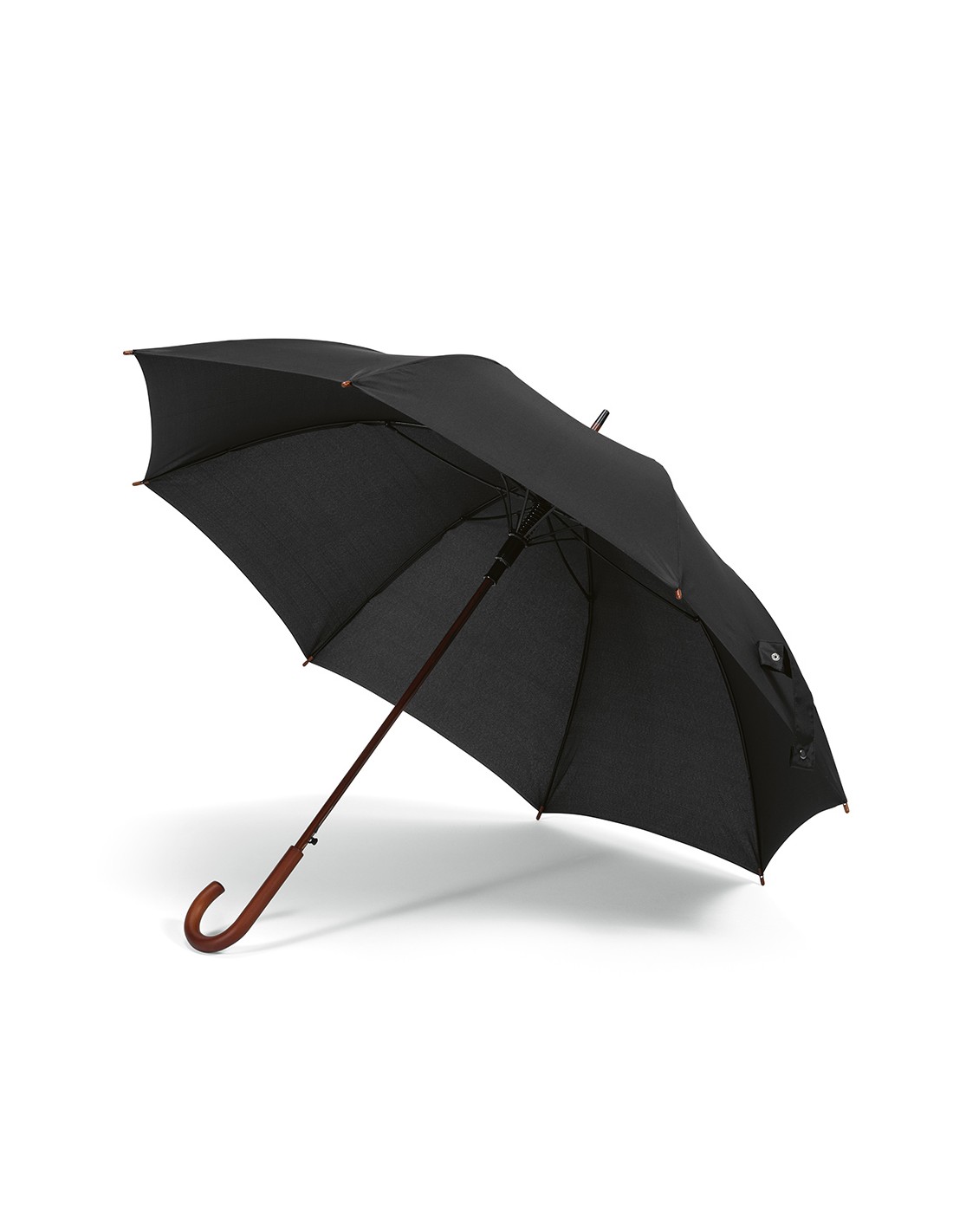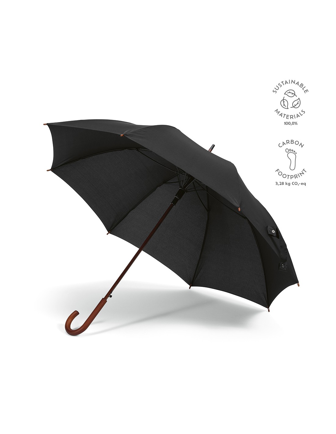 Ombrello ad apertura automatica da 23” con telo in poliestere pongee in PET riciclato. Presenta una robusta asta in metallo, un telaio in fibra di vetro e un comodo manico in EVA con estremità in colore abbinato. Ampia superficie di stampa presente su ogni pannello.