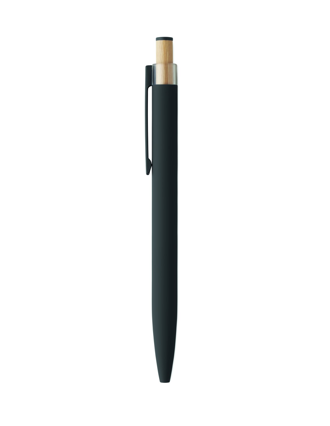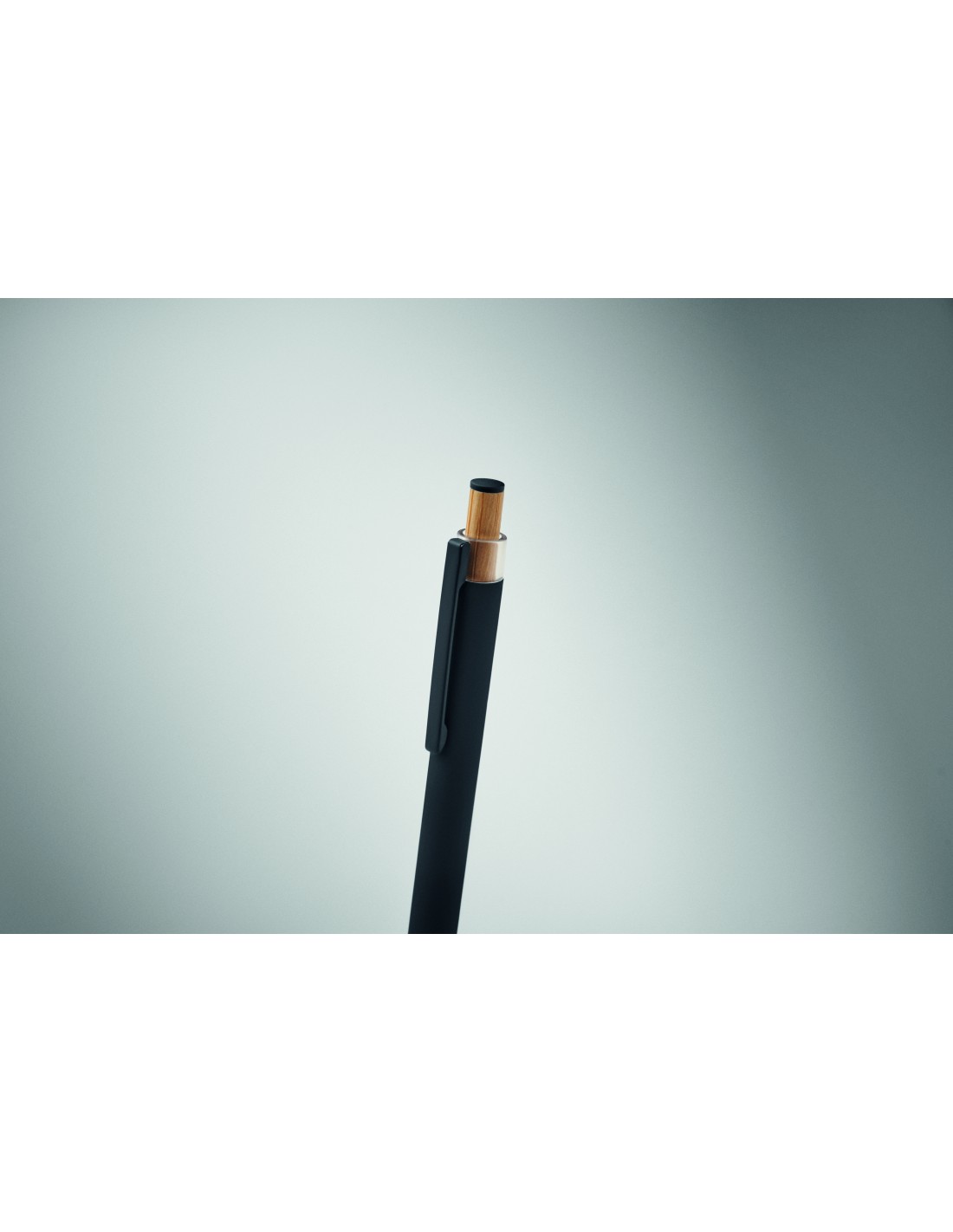 Penna a sfera in alluminio riciclato con pulsante in bambù con dettagli in tinta e clip in metallo abbinata. Inchiostro blu.