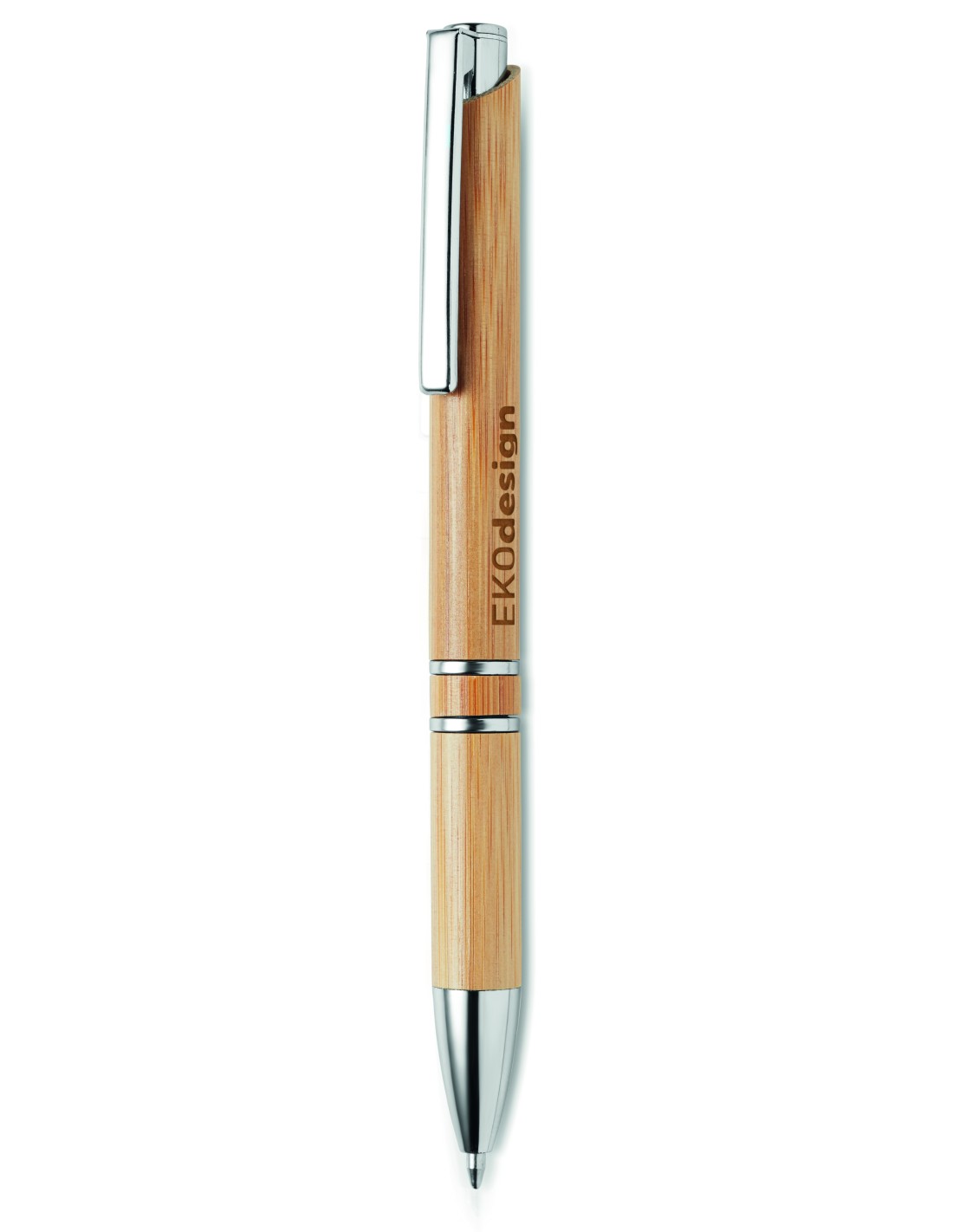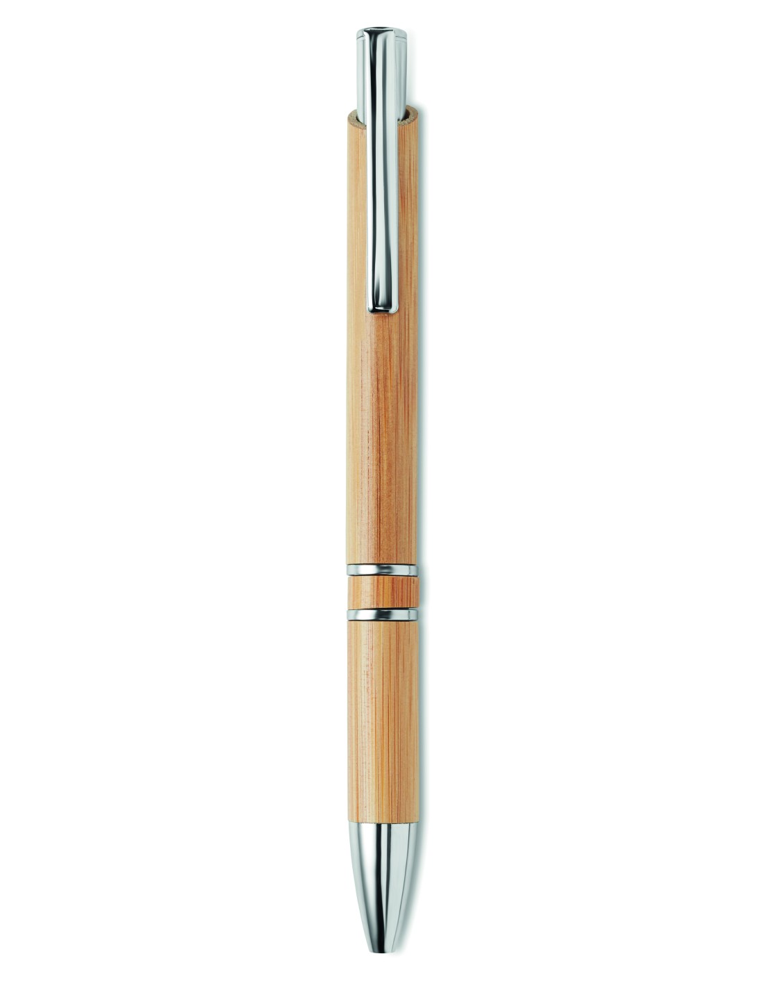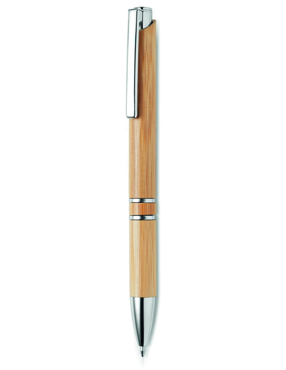 Penna a scatto in alluminio con fusto in bamboo. Refill blu.
