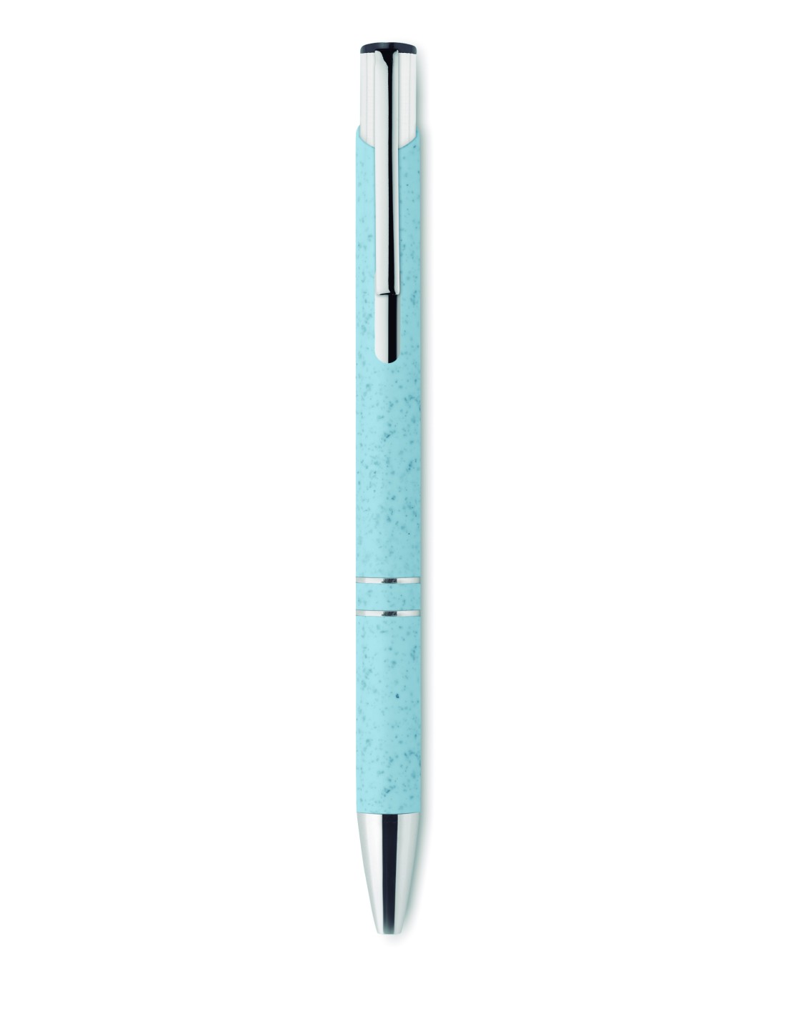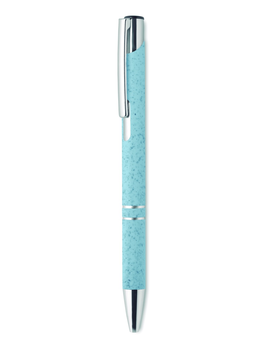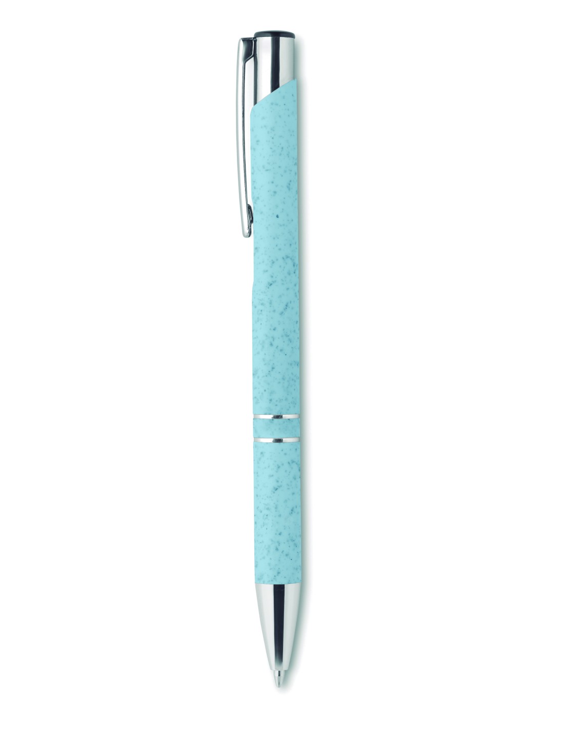 Penna a sfera push in paglia di grano 50% e ABS 50% con dettagli in argento. Refill blu.