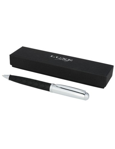 Penna a sfera dal design esclusivo con serbatoio inferiore con trama a reticolo trasversale rivestito in eco pelle. Comprende la ricarica di colore nero di qualità premium e confezionata in una scatola regalo "LUXE" (16 x 4,5 x 2,5 cm).